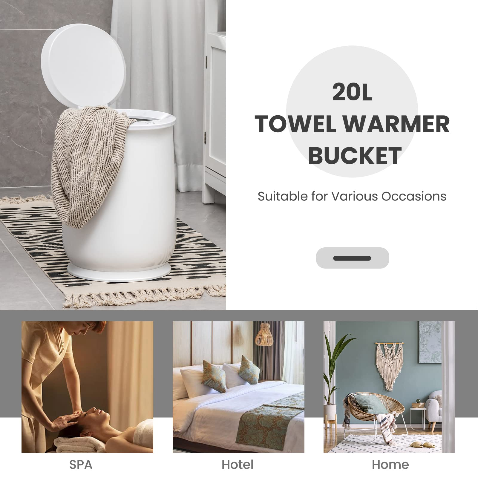 - 【Enjoy Comfy & Warm Towels】: Featuring a zinc coated inner liner design with good thermal conductivity, this towel warmer bucket heats up instantly and reaches the highest temperature of 266°F within 15 minutes. Moreover, heating wires have been strategically placed at the bottom to ensure uniform warmth distribution, eliminating any cold spots. This ensures that you are provided with cozy, warm towels after bathing or swimming.