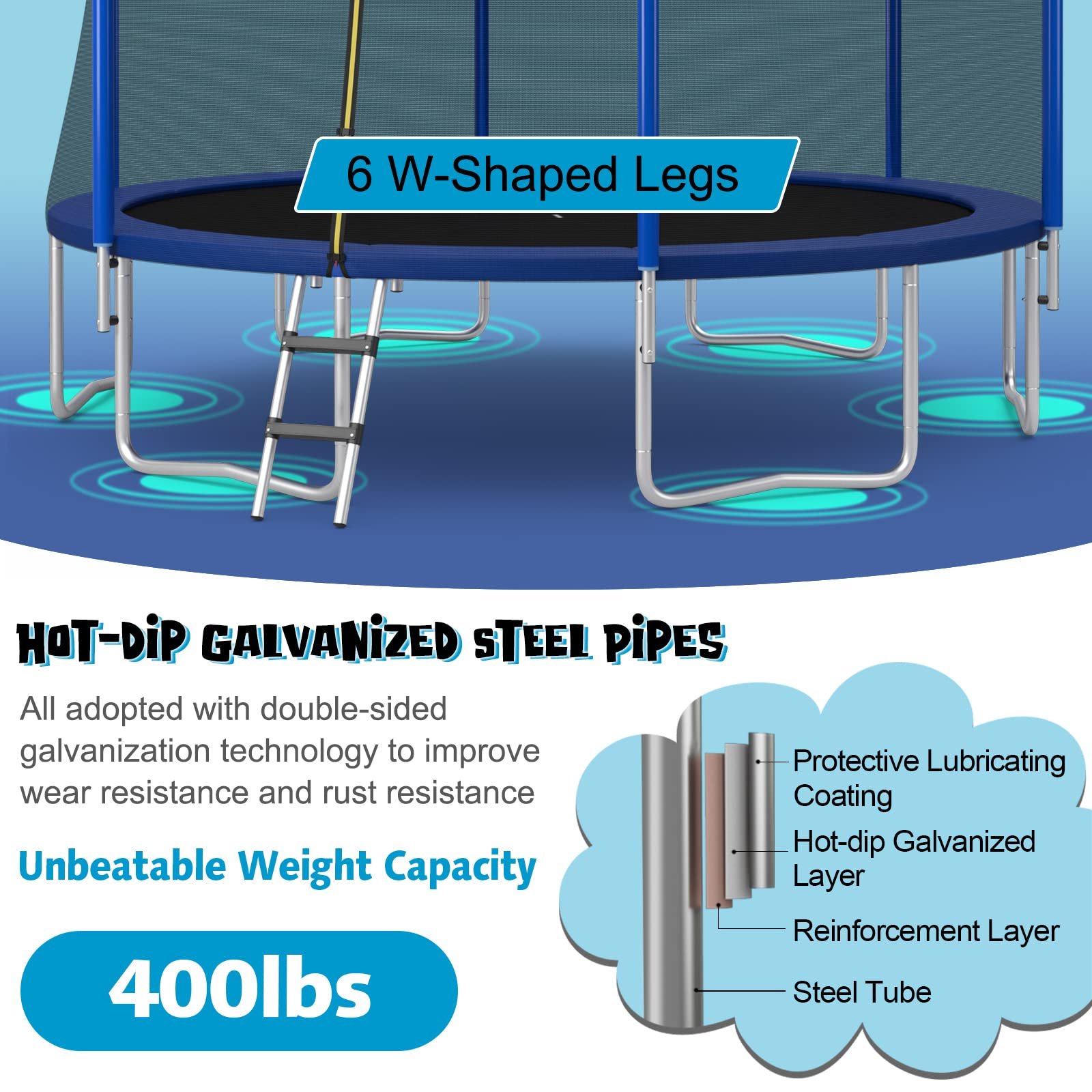 - [Built with Durability in Mind]: This trampoline adopts 8-row stitching on the edge of the jumping mat, which is not easy to break. All sizes are equipped with a ladder that has 2 wide and non-slip steps. Using the latest hot-dip galvanized technology, all steel pipes are galvanized inside and outside to improve wear resistance and rust resistance.