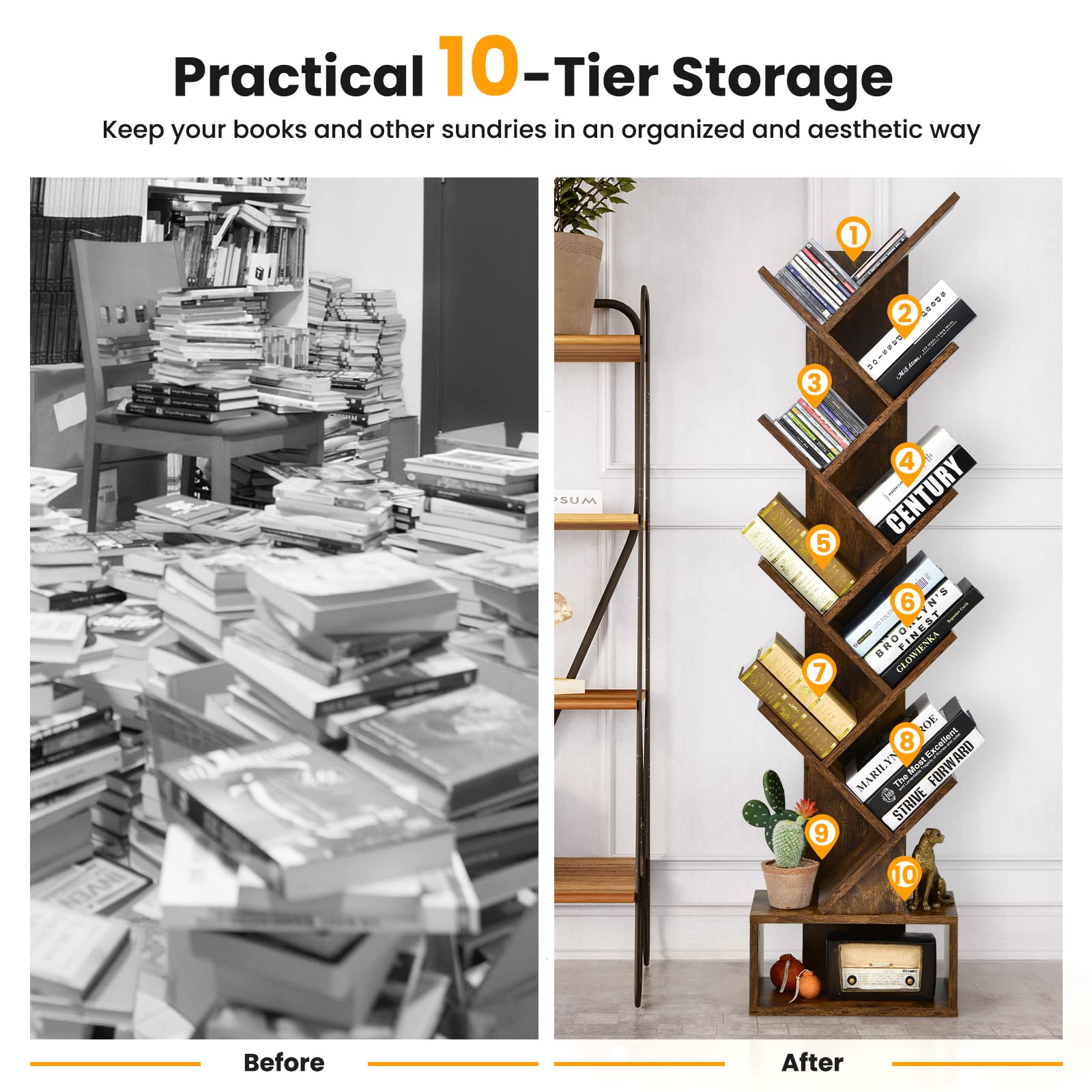 Display your beloved books in an aesthetic way! The unique tree-shaped bookshelf provides 10 staggered shelves for you to arrange your books and collections and prevent your room from messing up. Besides, the hollow base and the folding fabric drawer offer more storage options and help to keep the room tidy. Being slim and tall, the 10-tier bookcase won't take up much floor space, and therefore, fits for different rooms. On the other hand, it is rather stable to stand freely thanks to the wide base and non-slip pads at the bottom. When you place it against the wall, you can use the anti-toppling device for extra fixation and strengthened stability. In all, it is an elegant yet functional storage and display stand, suitable for decorating the living room, bedroom, study room or home office.