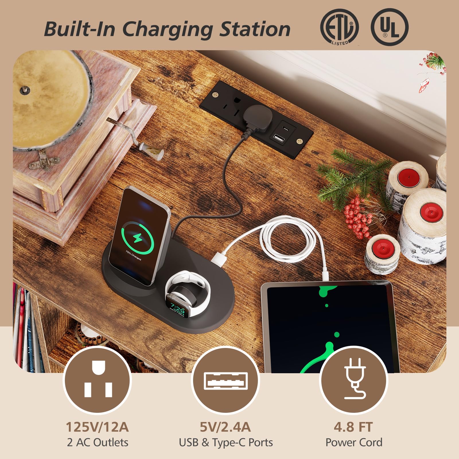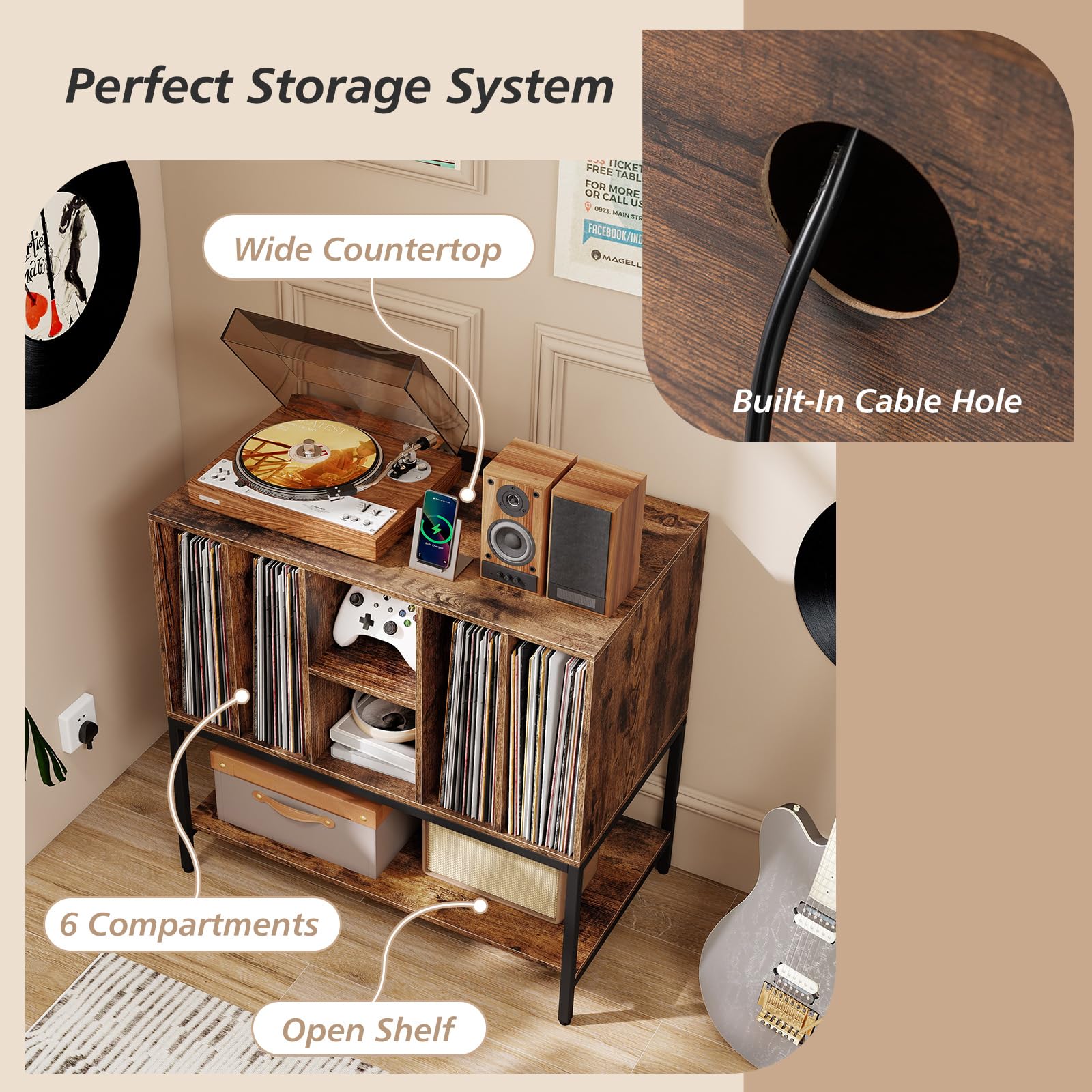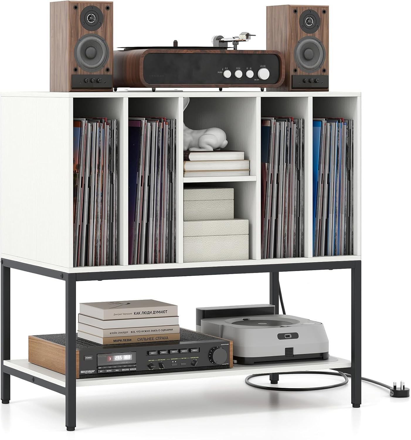 This record player stand not only powers up your devices with 2 AC outlets, USB, and Type-C ports but also offers ample storage with a wide tabletop, 6 compartments, and an open shelf. Its heavy-duty metal frame provides stability and durability, featuring 2 anti-tipping kits and adjustable foot pads for safety. Perfect for various settings, from living rooms to music rooms, this turntable table seamlessly fits into your decorations. The smooth surface ensures easy maintenance with just a quick wipe-down, giving you more time to indulge in the music you love.