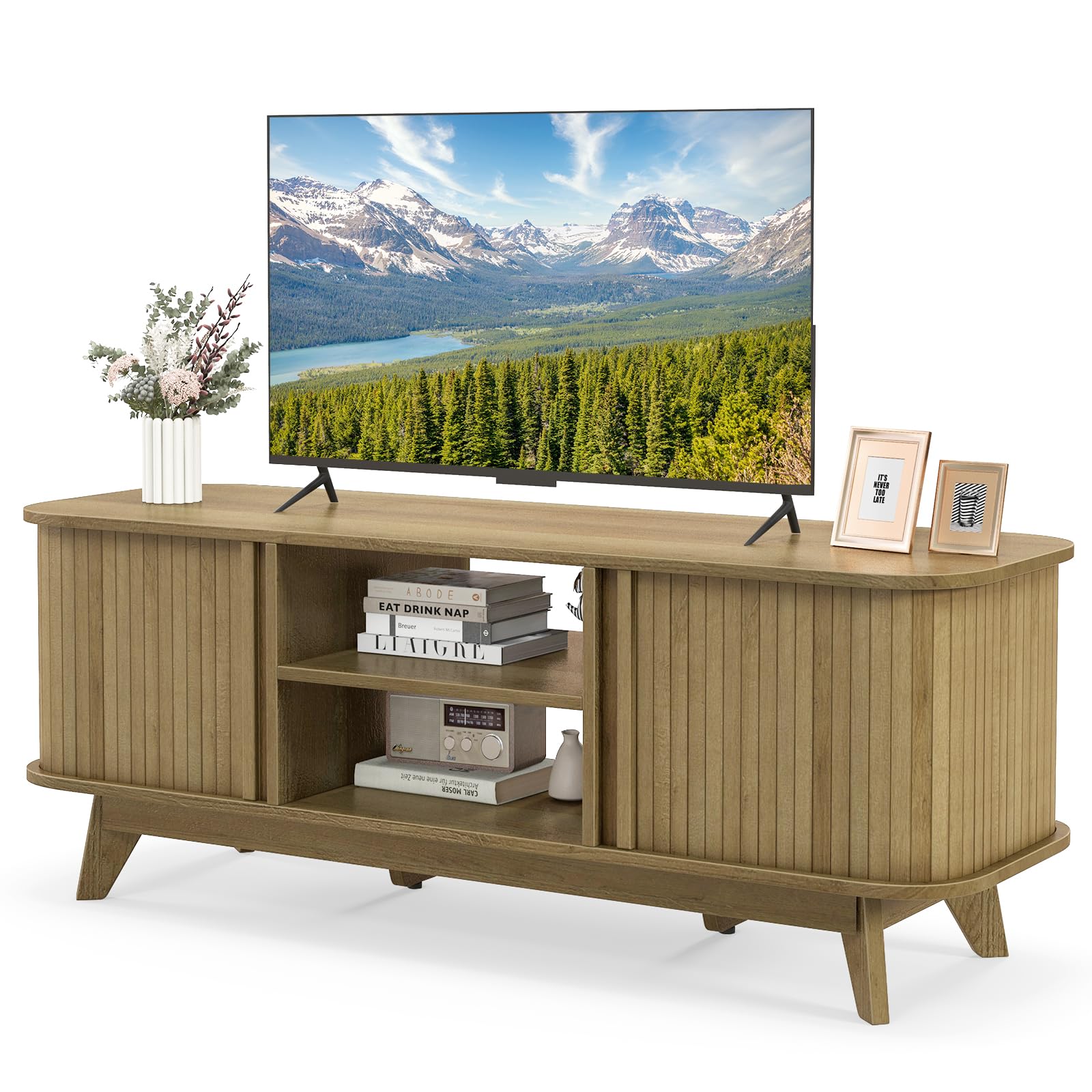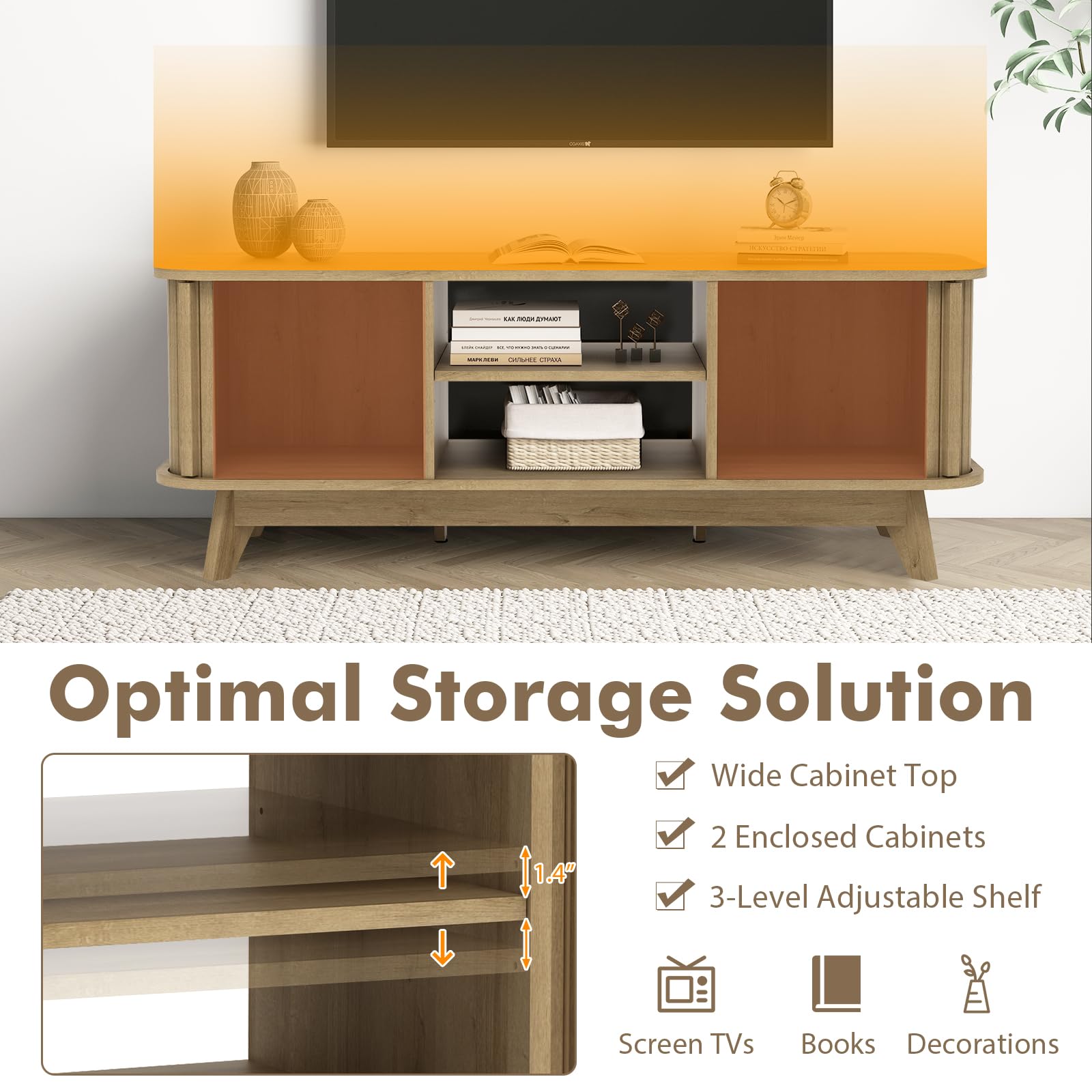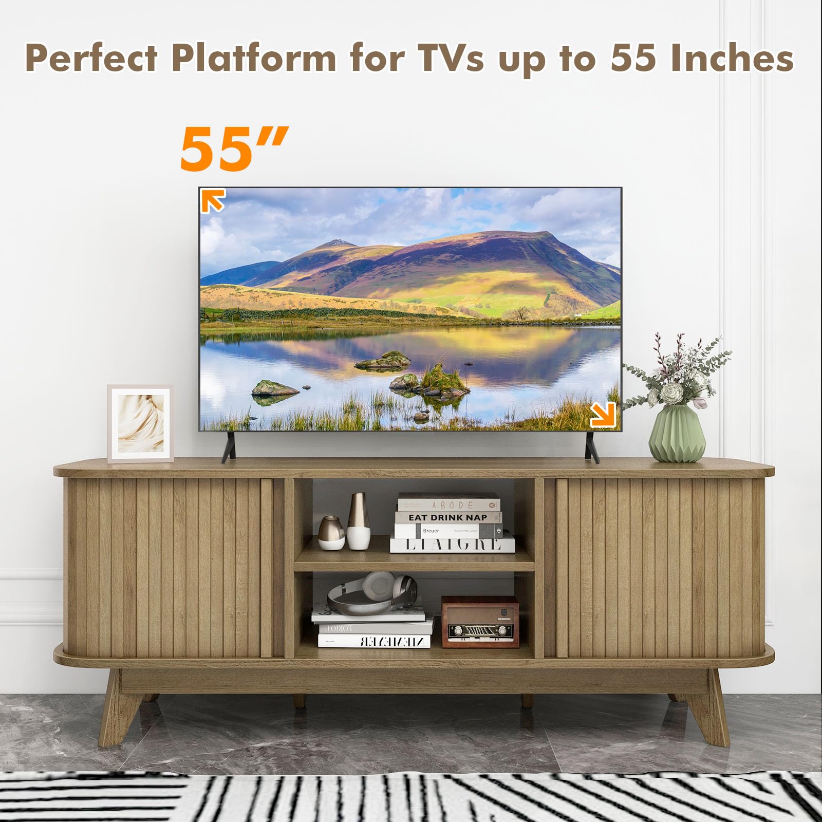 Elevate your entertainment space with this TV stand crafted for 55-inch screen TVs. Offering a stable display platform and smart storage, the media console table features a 3-level shelf for easy customization as well as 2 organized storage cabinets. Therefore, it can neatly organize your books, decorations, or CDs. The robust frame with splayed legs and adjustable foot pad ensures stability and can support up to 200 lbs. Dual sliding doors and surround-style rails provide easy access to your media collection while occupying less space. Transform your living area with this sleek and versatile TV stand, serving as a stylish media console or display cabinet for a touch of classic design. More user-friendly details await your discovery.