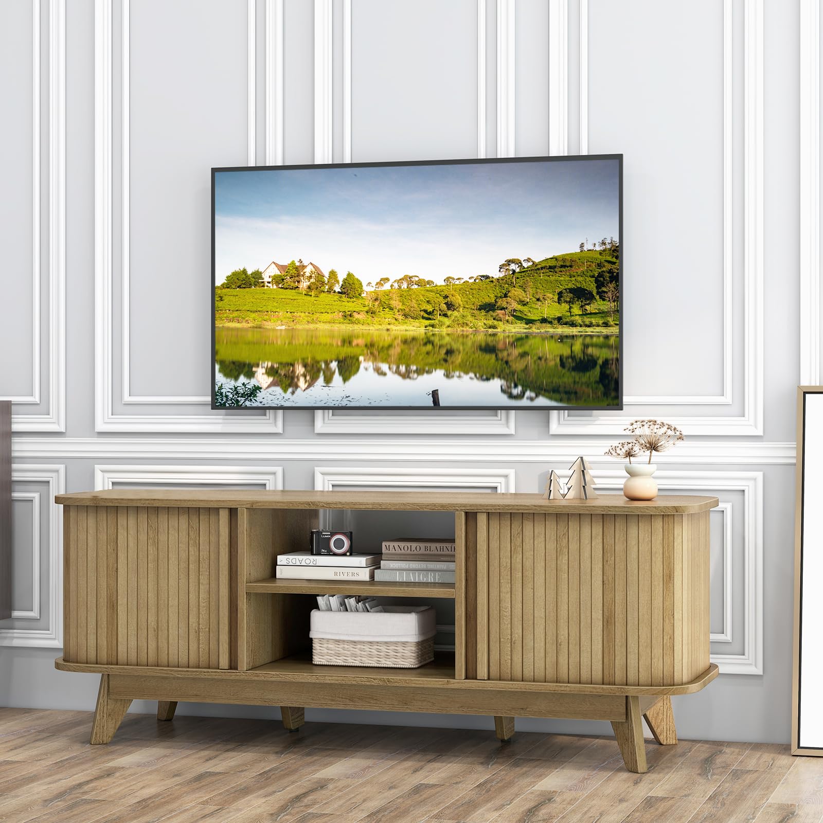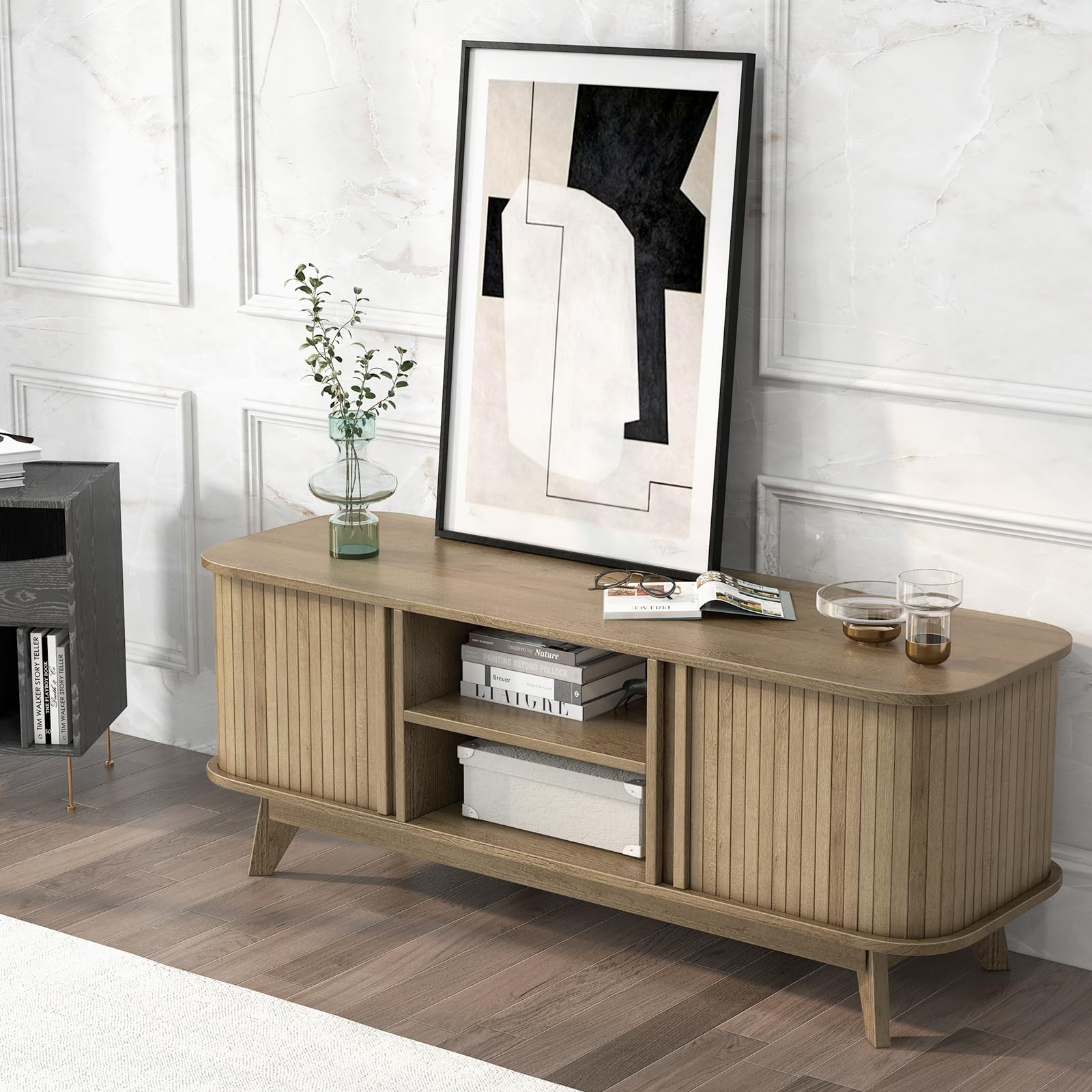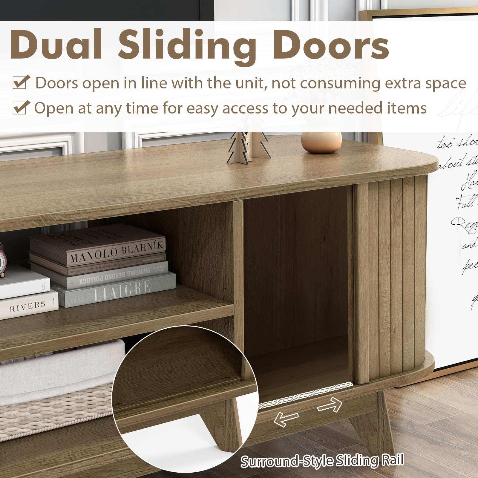 - 【Convenient Sliding Doors】: The dual side sliding doors of the entertainment center smoothly glide to reveal or hide your media items. The surround-style sliding rail ensures doors align perfectly, saving precious space.