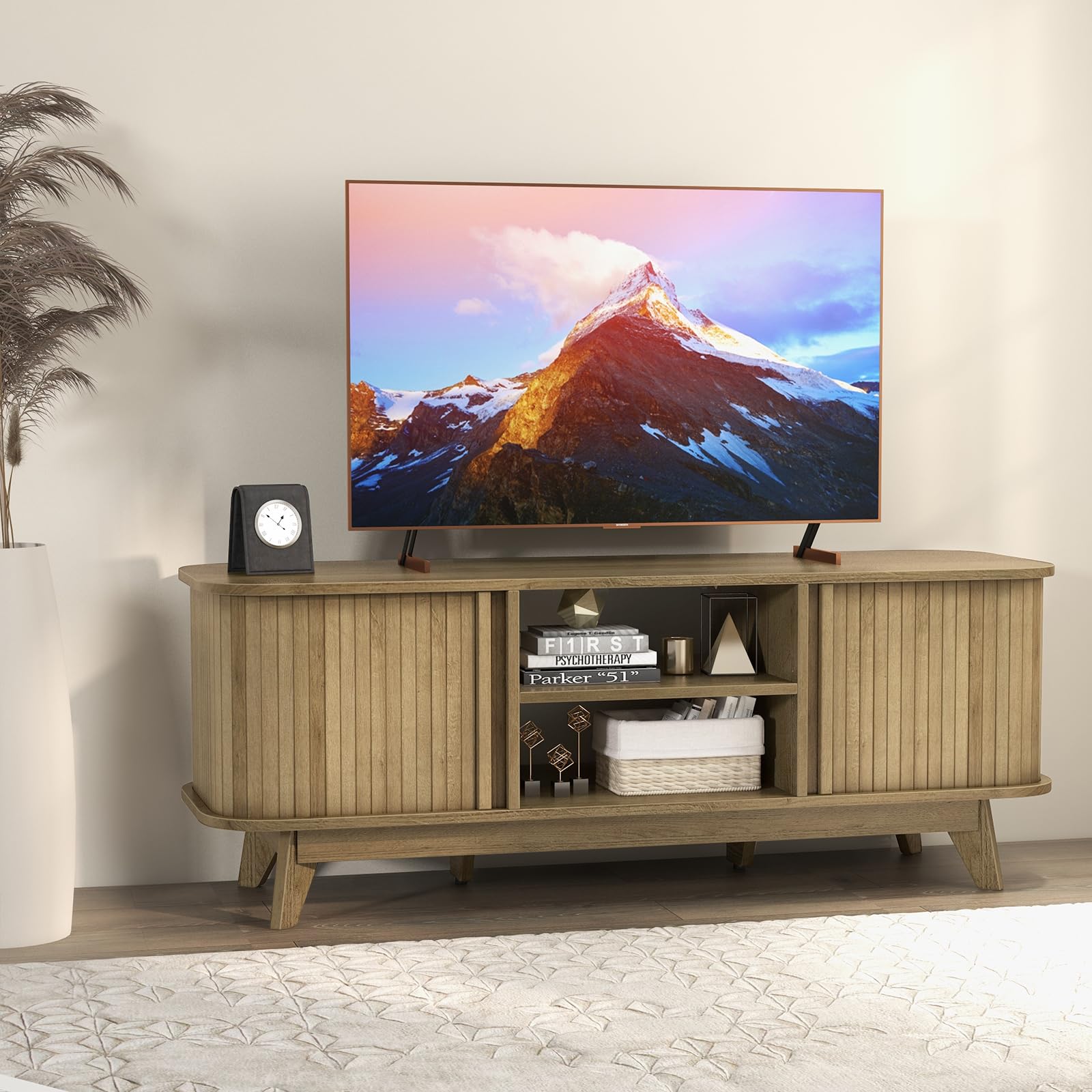 - 【Versatile Storage Solution】: Adjust your storage space effortlessly with the 3-level shelf offering customizable intervals of 1.4”. With 2 enclosed cabinets, this media console ensures optimal organization for your collection.