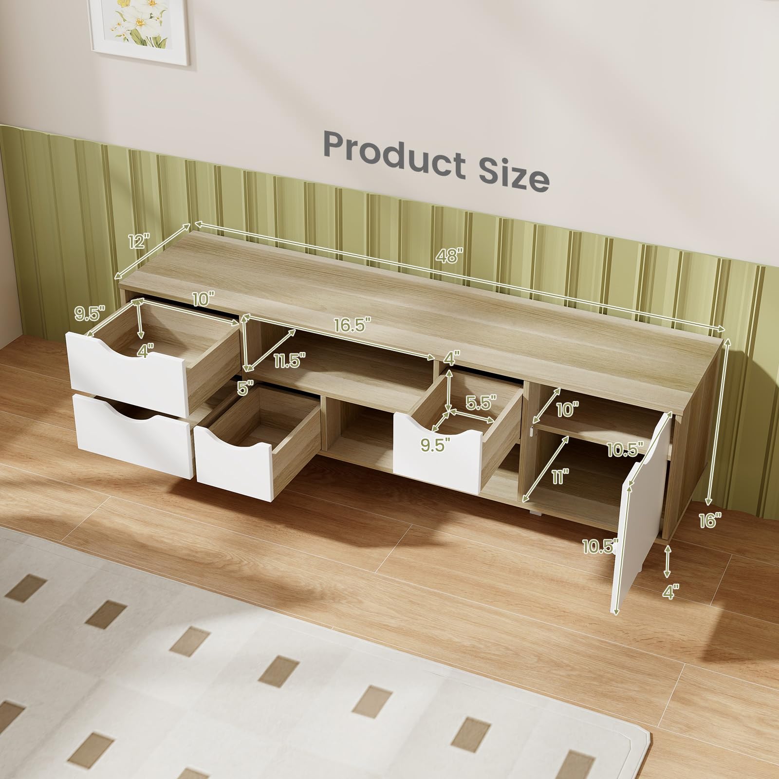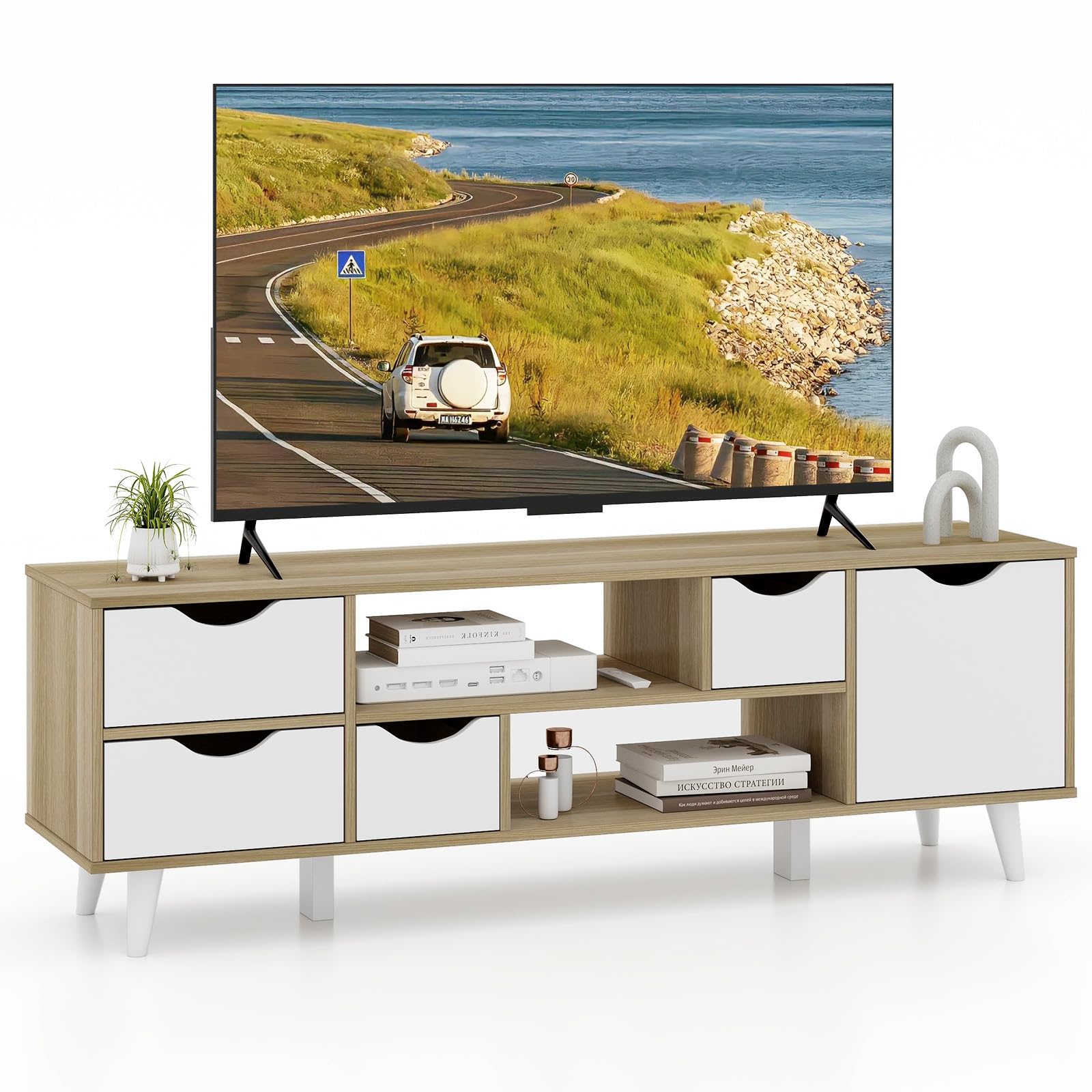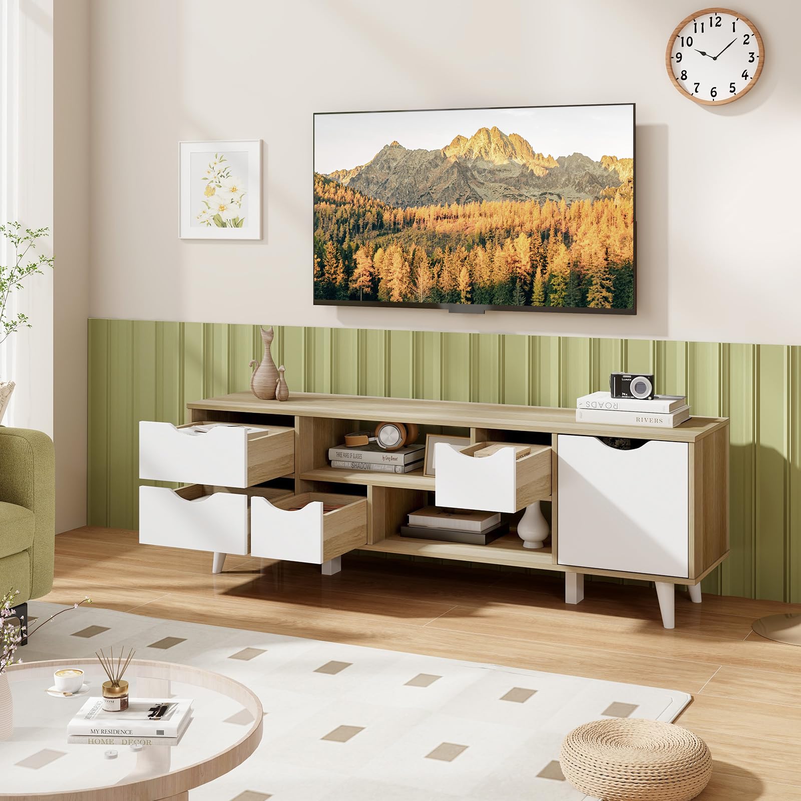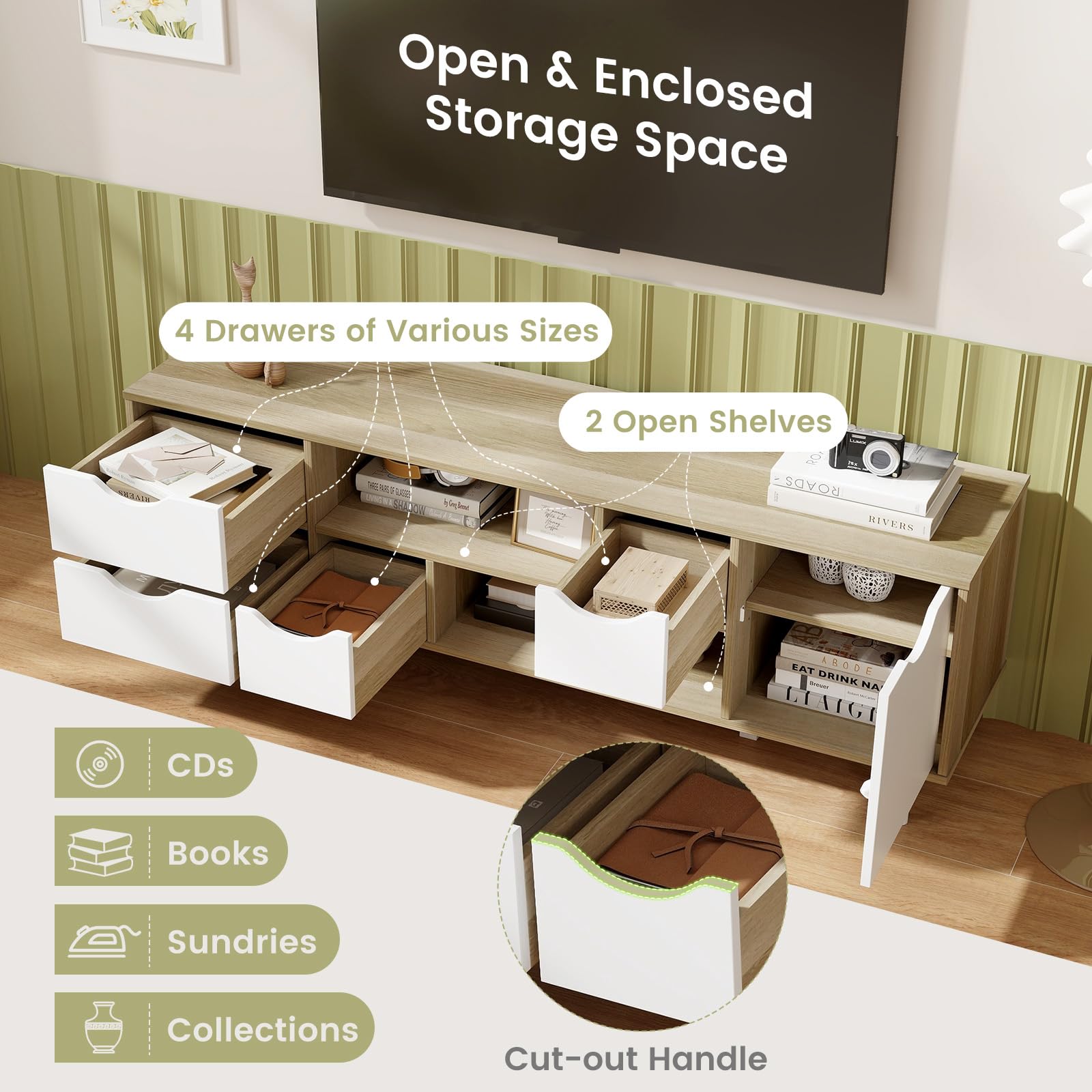 - 【Open & Enclosed Storage Space】: This TV cabinet offers generous storage with 4 pull-out drawers, keeping your media essentials neatly. And 2 open compartments are ideal for placing your cable box, gaming consoles, or other electronics.