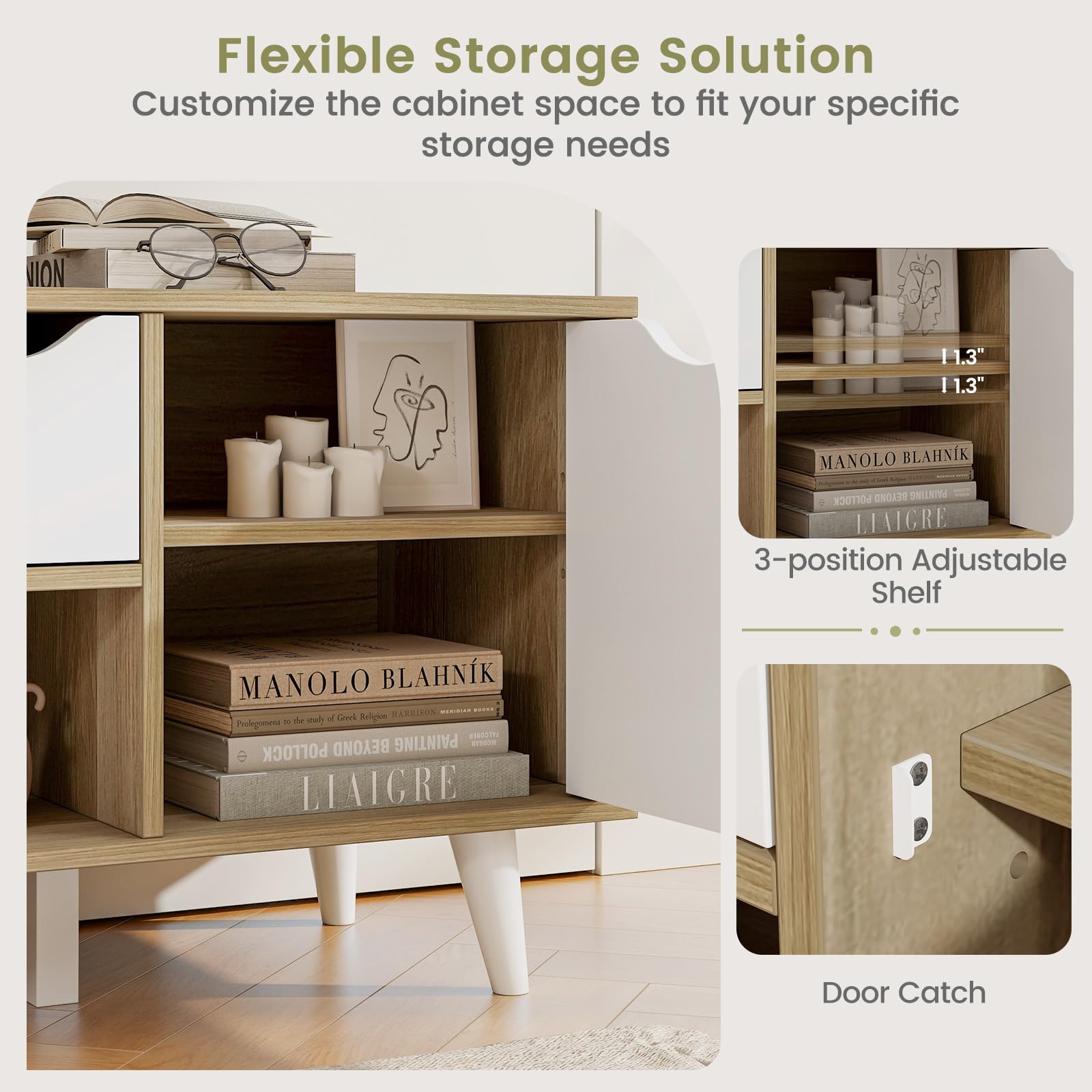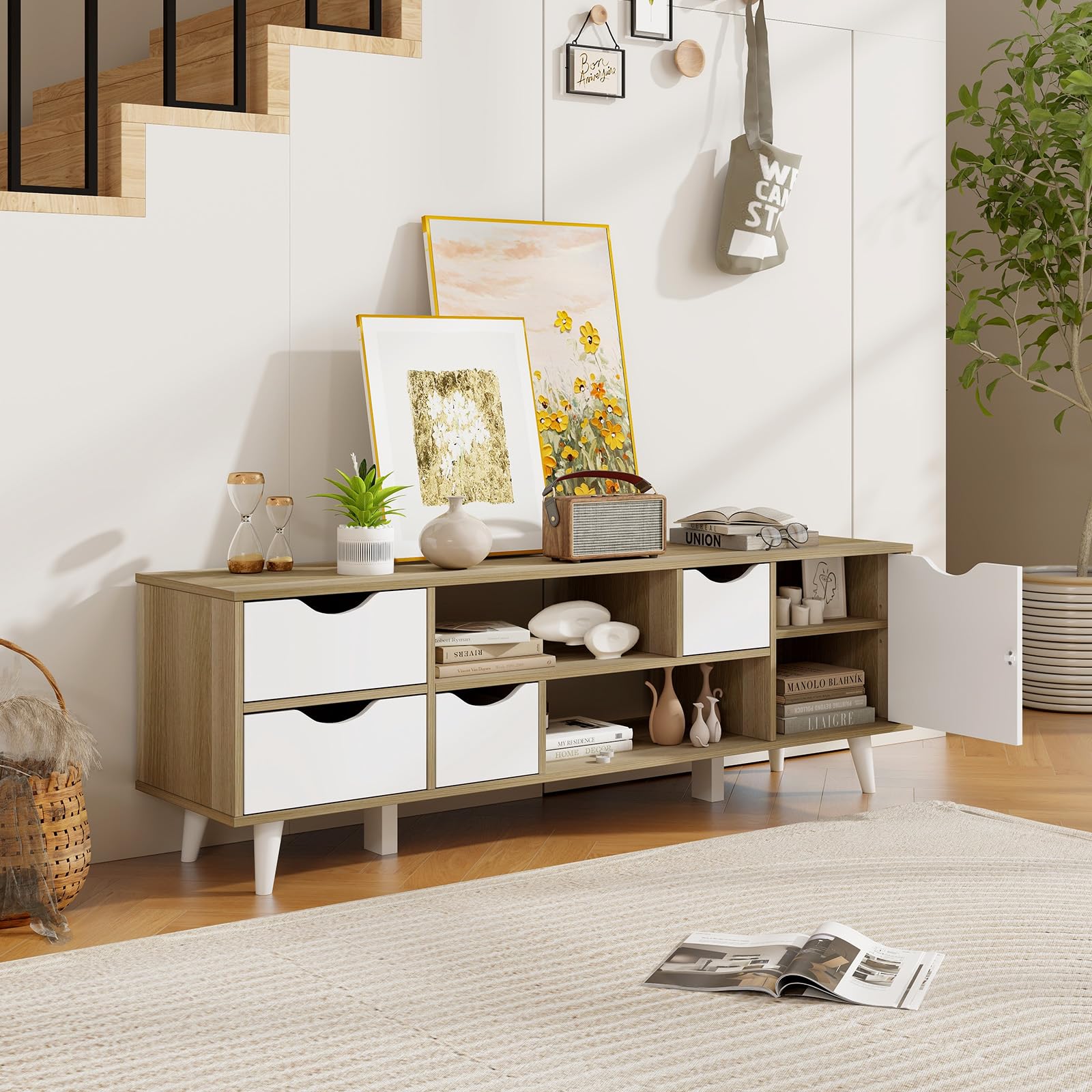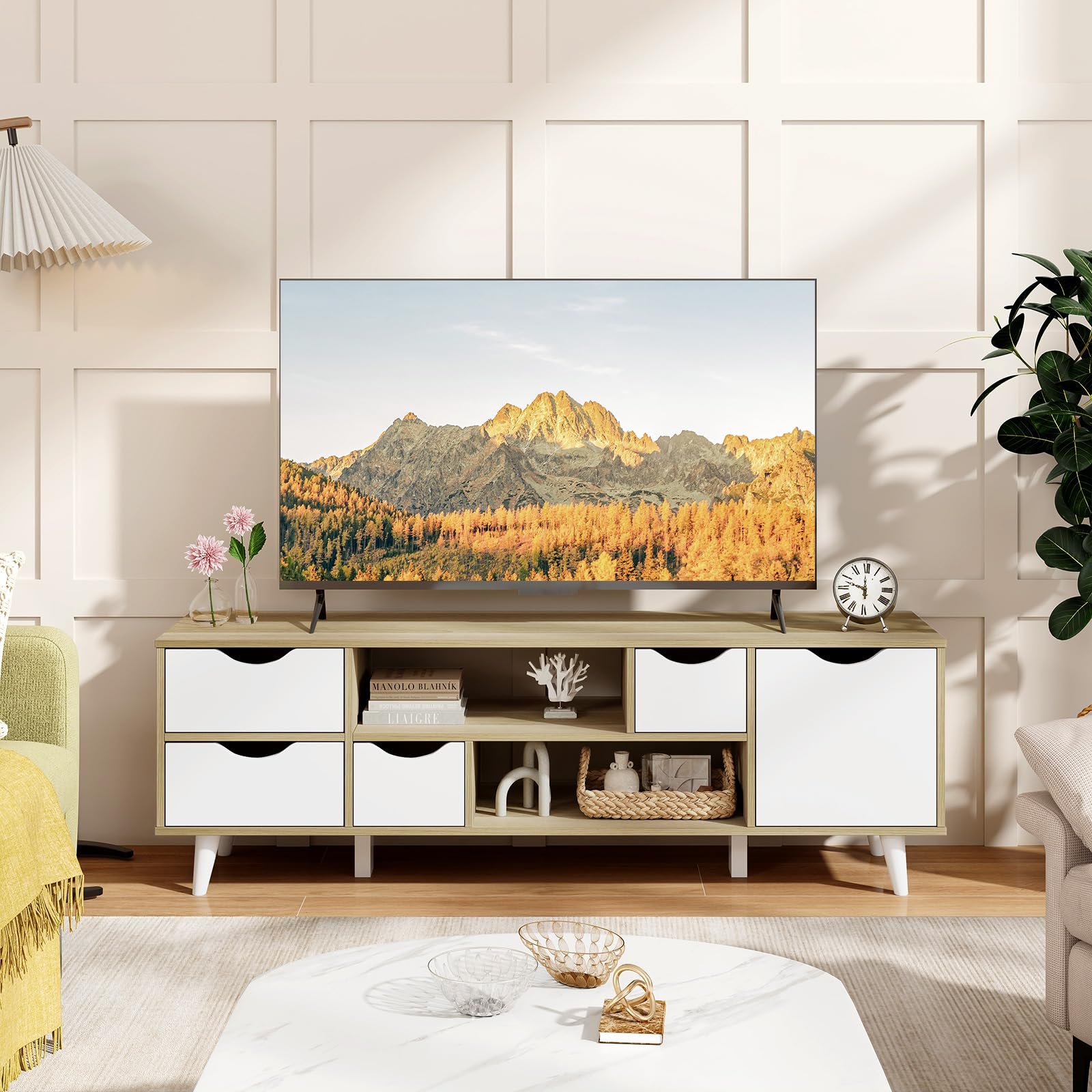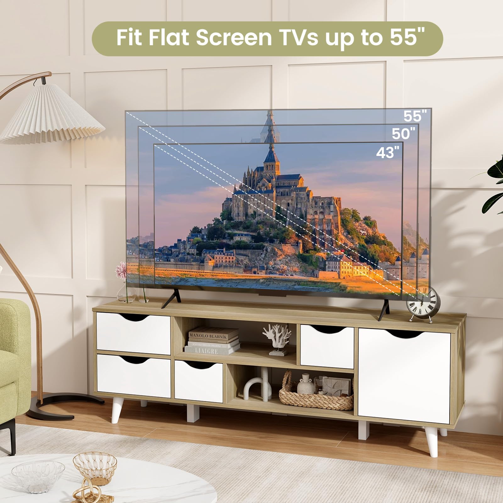 - 【Mid-century TV Stand for 55” TV】: The mid-century modern TV stand is designed to accommodate TVs up to 55 inches. The harmonious blend of colors and natural wood textures brings warmth to your space.