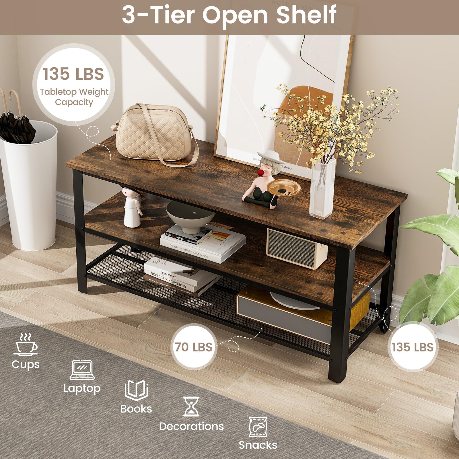 Elevate the appeal of your home with this captivating industrial TV stand! Its stylish 3-tier open storage shelf offers abundant space to neatly organize your DVD collection, speakers, remote controls, cups, laptops, snacks, books, and decorative items. The adjustable foot pads not only provide stability but also protect your floor from unsightly scratches. With its waterproof finish, cleaning becomes a breeze. This console table, designed in a trendy industrial style, adds an extra touch of charm to your living space.