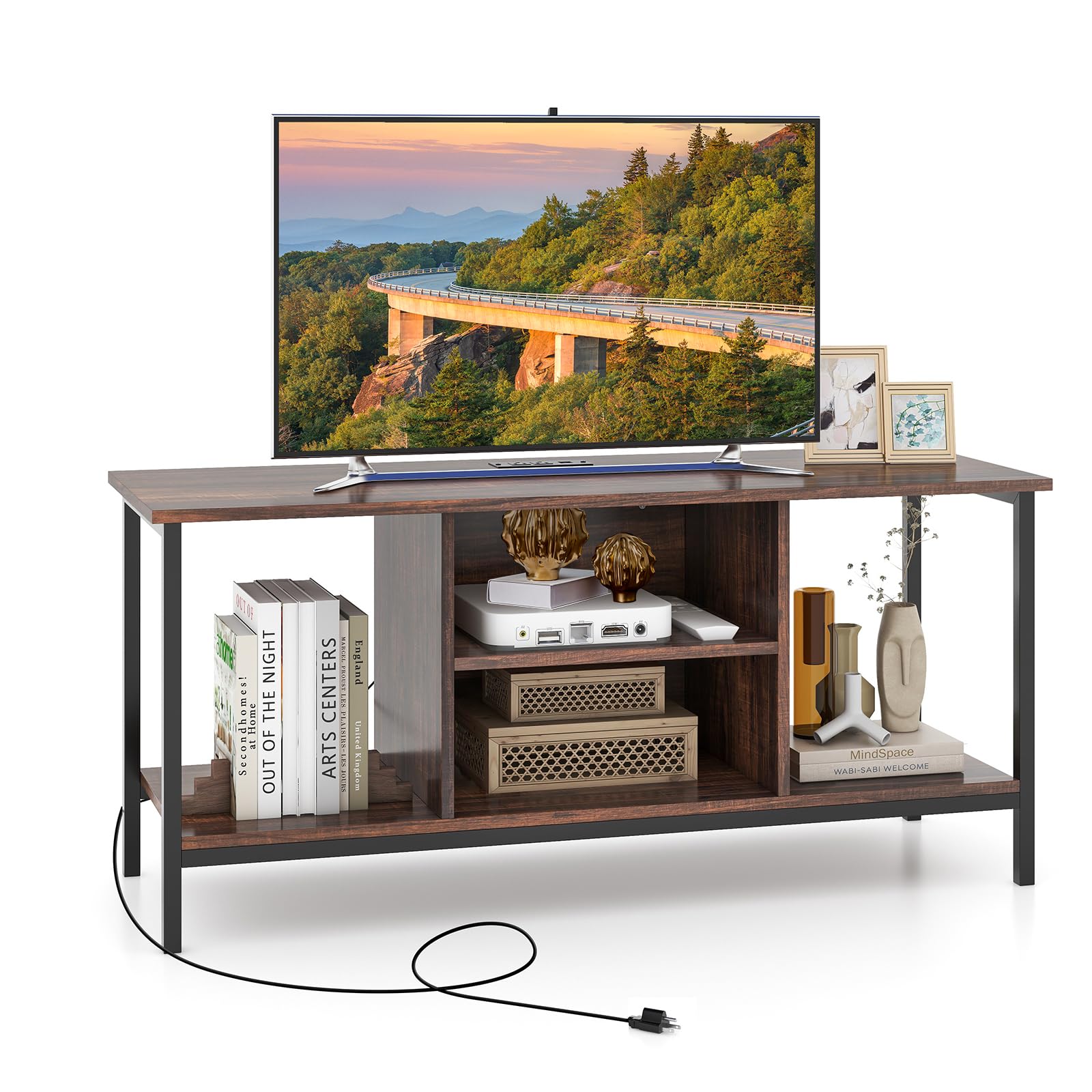 Enhance your media center with this versatile TV stand that combines functionality and style. With a built-in charging station, including 2 USB ports and 2 AC outlets, conveniently charge your devices while enjoying your favorite shows. The spacious tabletop provides the perfect viewing height for TVs up to 50” and can also double as a showcase for your beloved book collection. Stay organized with 2 open compartments, 2 shelves, and 2 cable management holes, ensuring ample storage space and tidy wire arrangement. Crafted with a sturdy sprayed metal frame, this TV stand offers stability and supports a weight capacity. Its adjustable foot pads adapt seamlessly to any surface for an optimal user experience. Easy to assemble, this TV console table adds an industrial charm to your home decor and comes with UL and ETL certifications for added peace of mind.