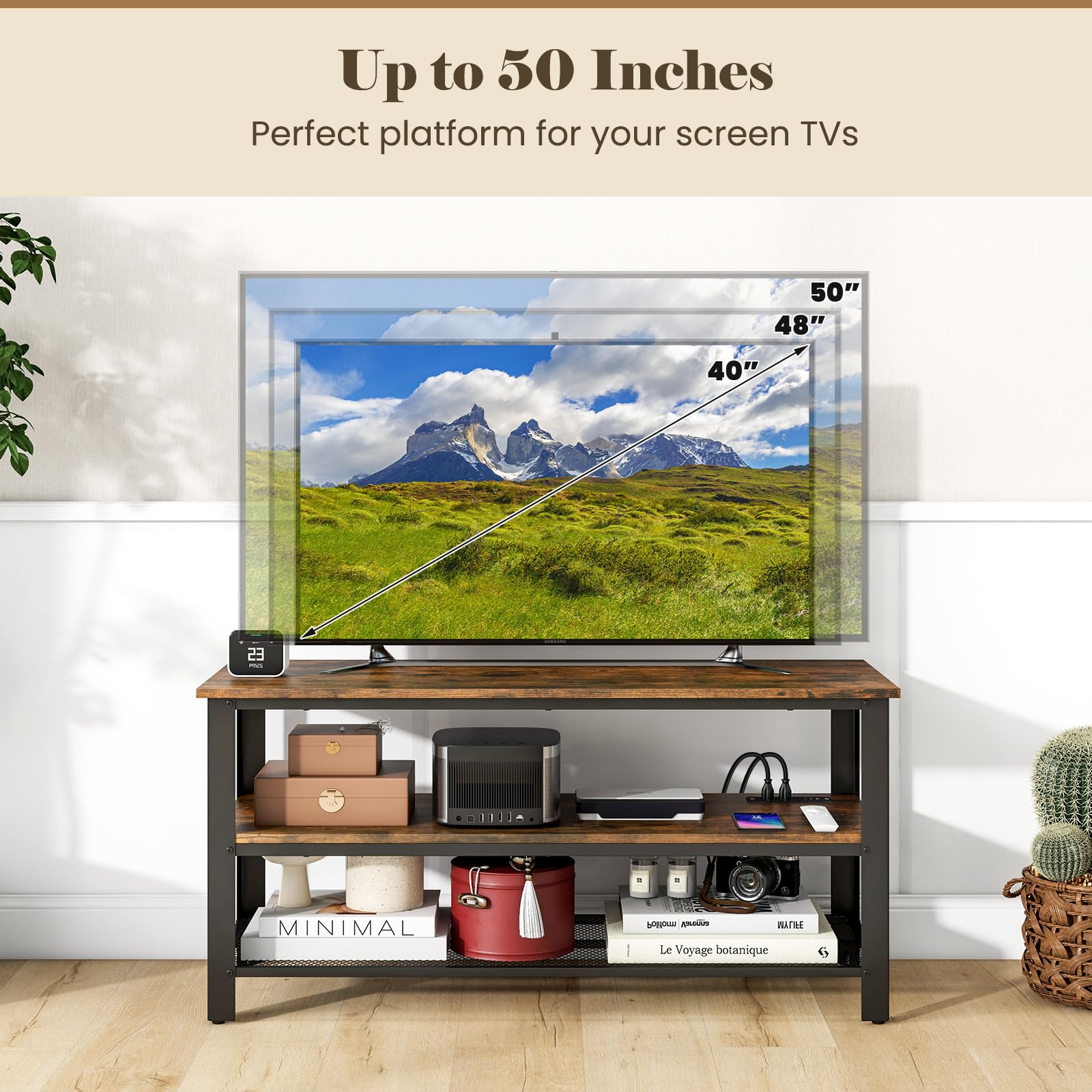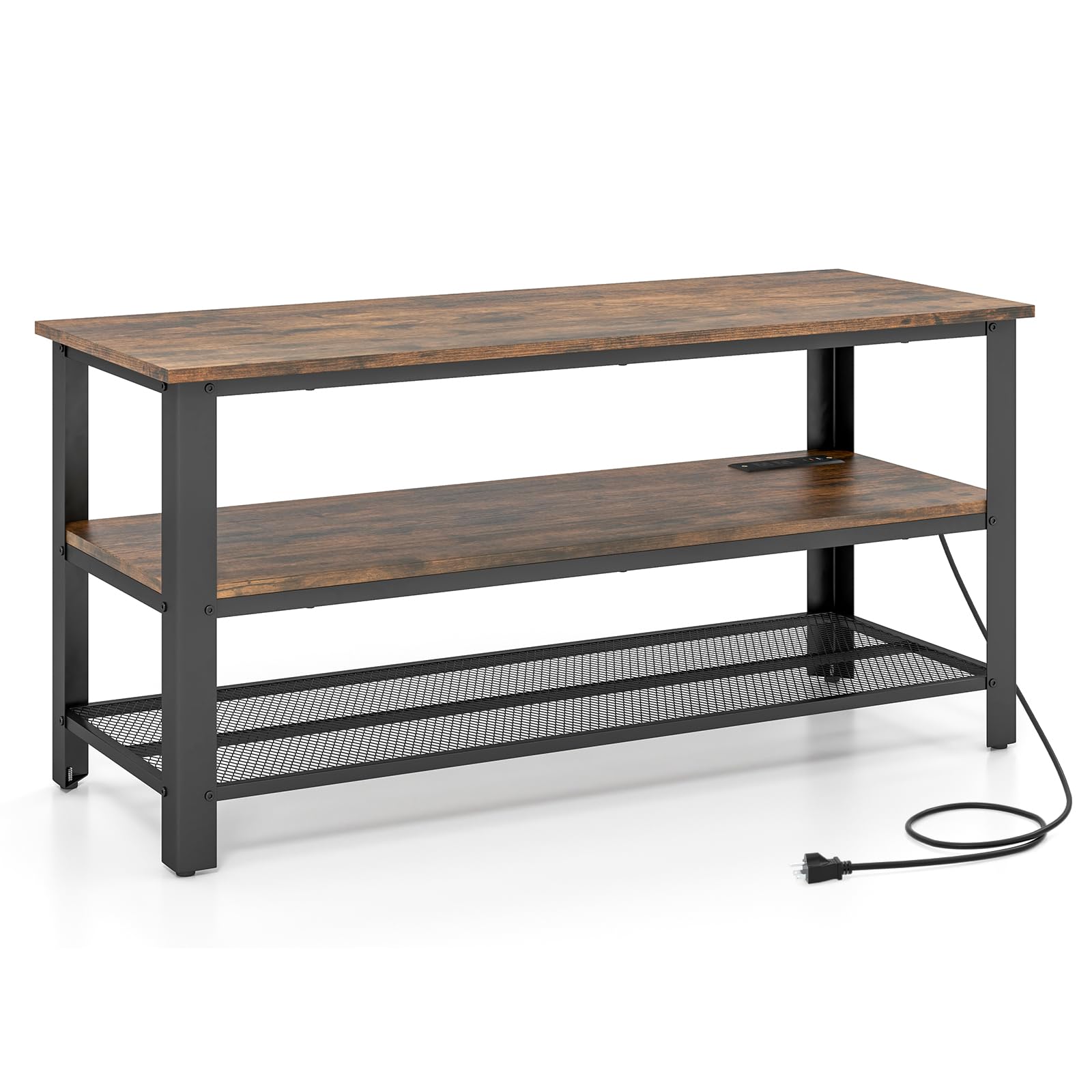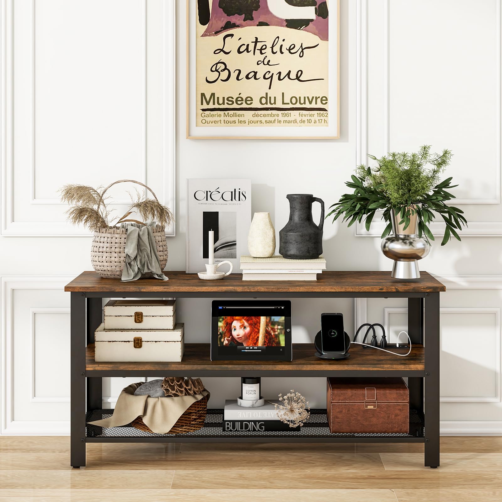 Enhance your entertainment setup with our versatile TV stand. Designed to accommodate TVs of 40”, 48”, or 50”, this TV stand offers ample space for media equipment. Stay organized with 2 convenient storage shelves, keeping your essentials easily accessible and your space tidy. Power up your devices effortlessly with 2 AC outlets, 2 USB A ports, and 1 USB C port integrated into the console table. The sturdy metal frame supports up to 340 lbs, adding an industrial flair to your decor, while adjustable foot pads ensure stability. Embrace the versatility of this multifunctional piece that seamlessly fits into any room – be it a living room centerpiece, a stylish bedroom media hub, or an elegant entryway console. Unleash the full potential of your entertainment space with this modern and functional TV stand.