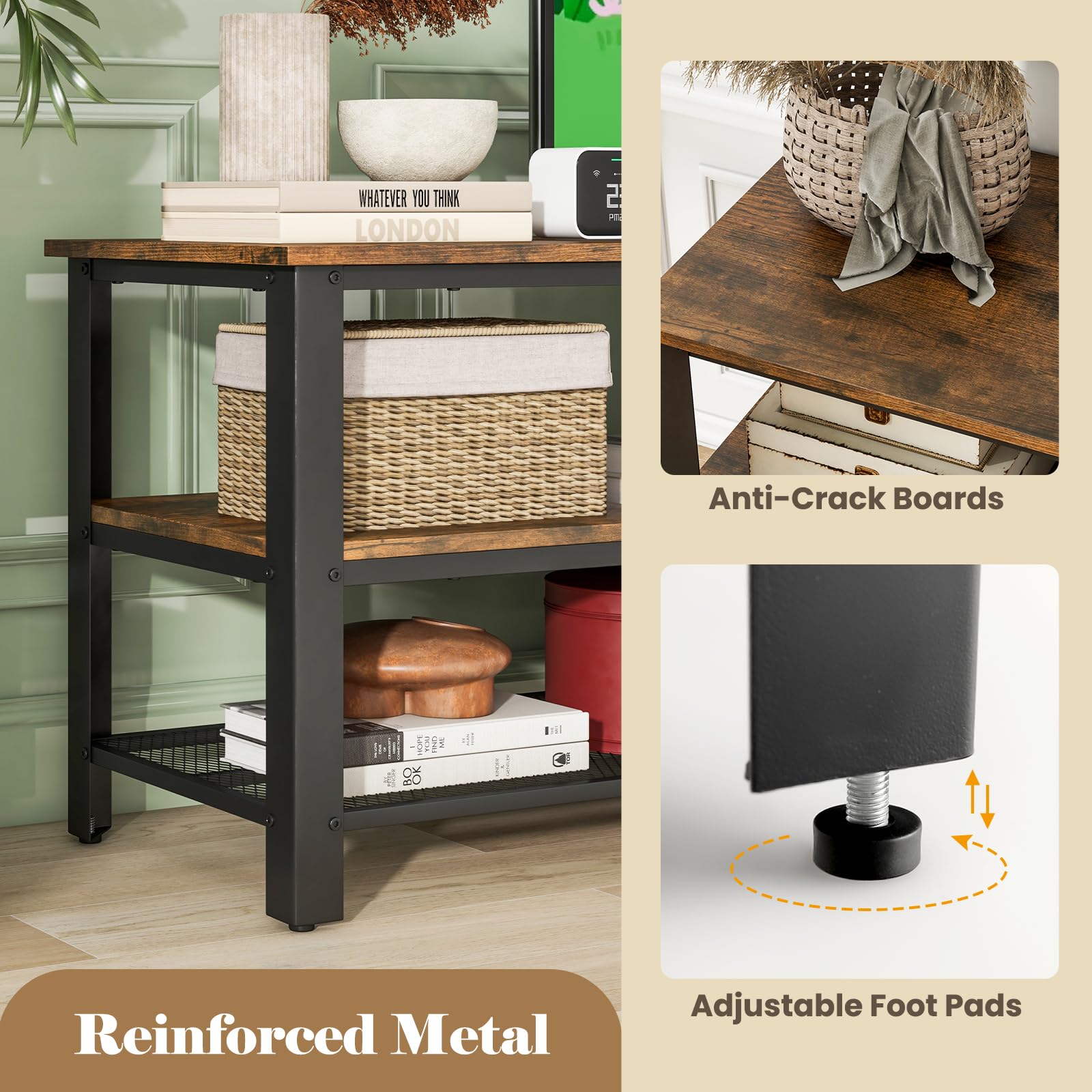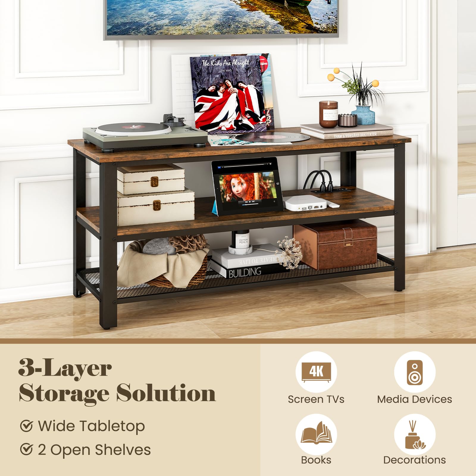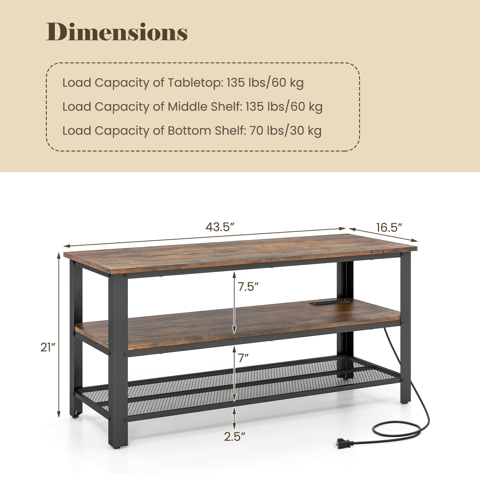 Enhance your entertainment setup with our versatile TV stand. Designed to accommodate TVs of 40”, 48”, or 50”, this TV stand offers ample space for media equipment. Stay organized with 2 convenient storage shelves, keeping your essentials easily accessible and your space tidy. Power up your devices effortlessly with 2 AC outlets, 2 USB A ports, and 1 USB C port integrated into the console table. The sturdy metal frame supports up to 340 lbs, adding an industrial flair to your decor, while adjustable foot pads ensure stability. Embrace the versatility of this multifunctional piece that seamlessly fits into any room – be it a living room centerpiece, a stylish bedroom media hub, or an elegant entryway console. Unleash the full potential of your entertainment space with this modern and functional TV stand.