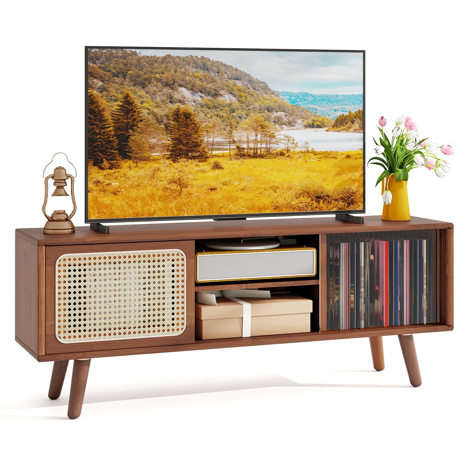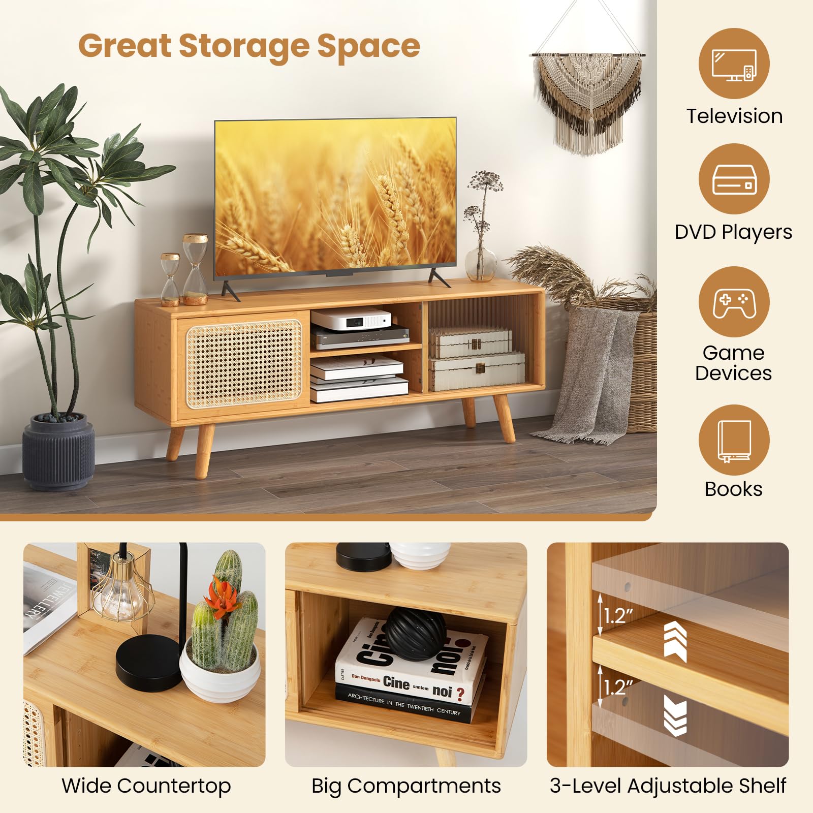 Enhance your living room with our unique TV stand! Designed for optimal viewing, this TV cabinet accommodates 55-inch TVs on its spacious 47.5” by 12” top, perfect for displaying decorative items. The integrated wire management system, with a rear hole and concealed wire hole, maintains a neat and organized space. Enjoy ample storage with two compartments and a 3-position adjustable shelf.The bamboo frame, supported by sturdy rubber wood legs, ensures durability. With dual sliding doors, one PE rattan, the other tempered glass. This stand combines quality materials and aesthetics. Upgrade your space with this functional and stylish TV stand.