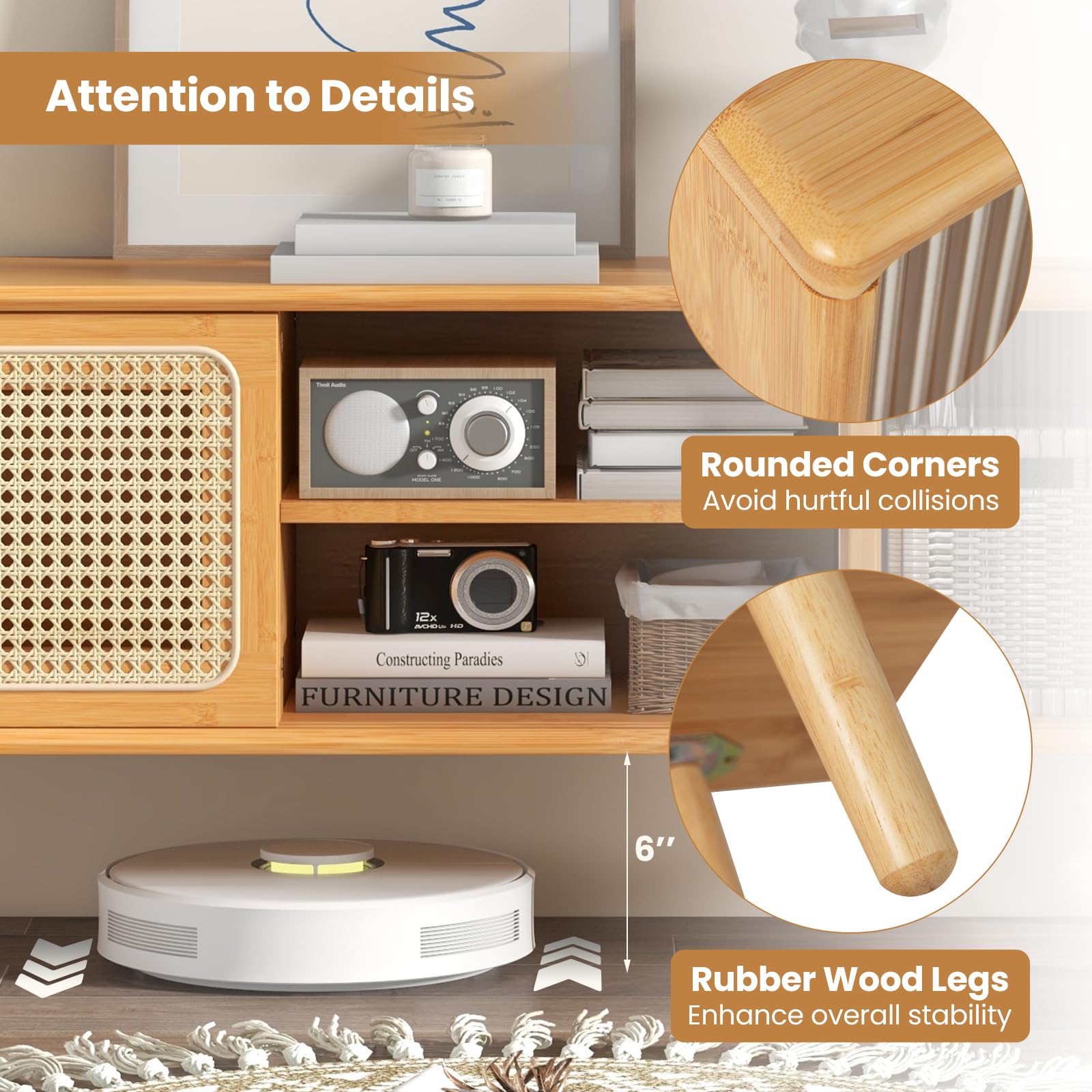 - Easy Access & Elegant Style: Featuring double sliding doors, our TV stand offers convenient access to stored items. One door is made of tear-proof PE rattan, adding a touch of bohemian elegance, while the other features a tempered glass door, providing a stylish visible feature.