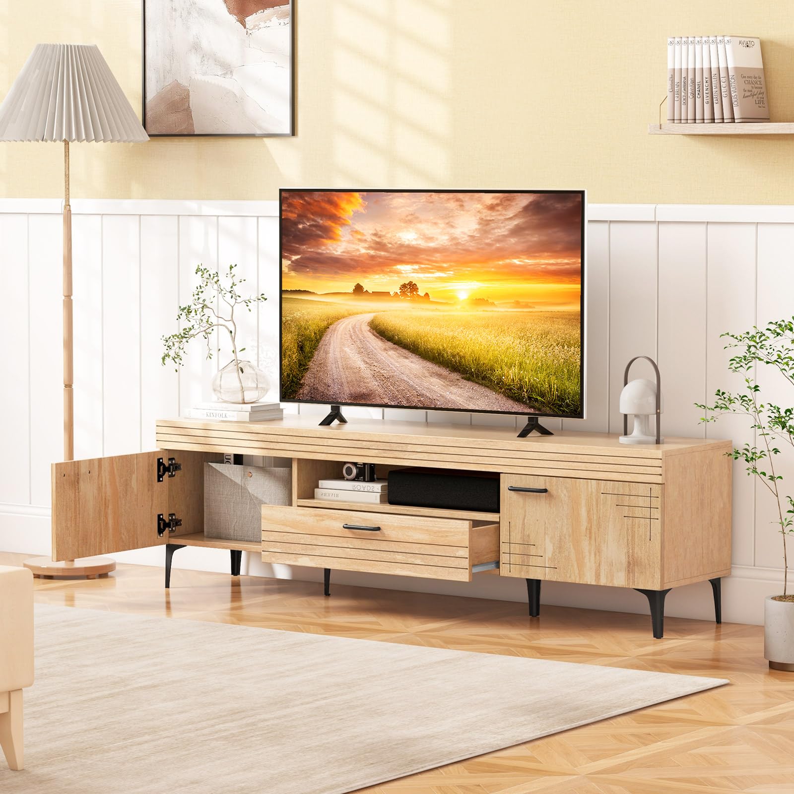 - [Spacious Storage Solution]: This media console table supports a 65” TV and offers ample storage options. Enjoy a generous tabletop, an open shelf for devices, a large drawer for accessories, and 2 cabinets for all your media essentials.