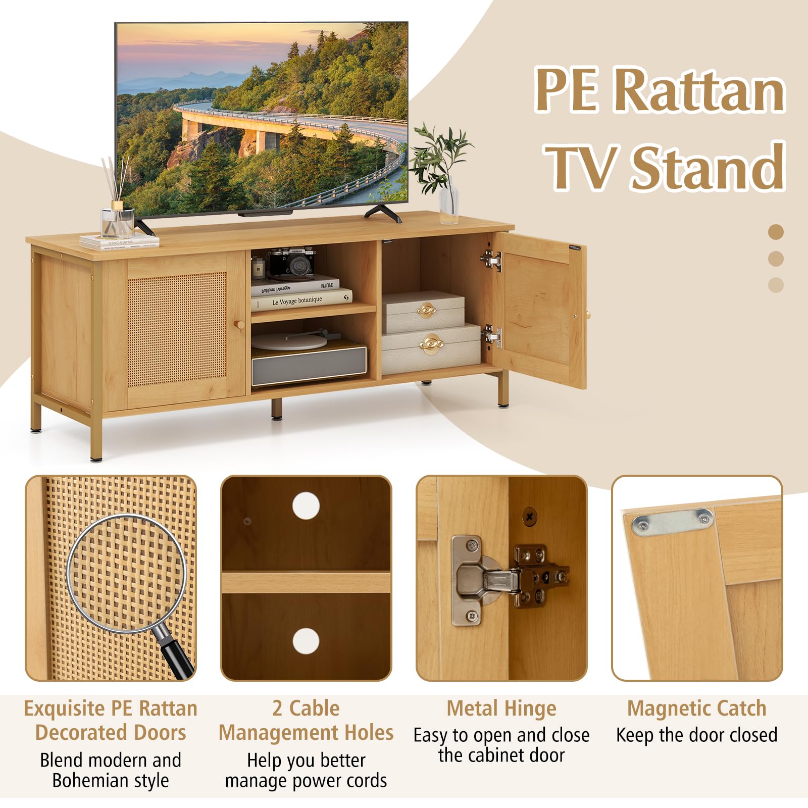 - 【Boho Inspiration】: This exquisite piece combines the warmth of oak wood grain, the beauty of natural PE rattan weaving, enhancing the aesthetic appeal of your space. Thus, this PE rattan TV stand is quite an eye-catching addition to your bedroom, living room or entryway.