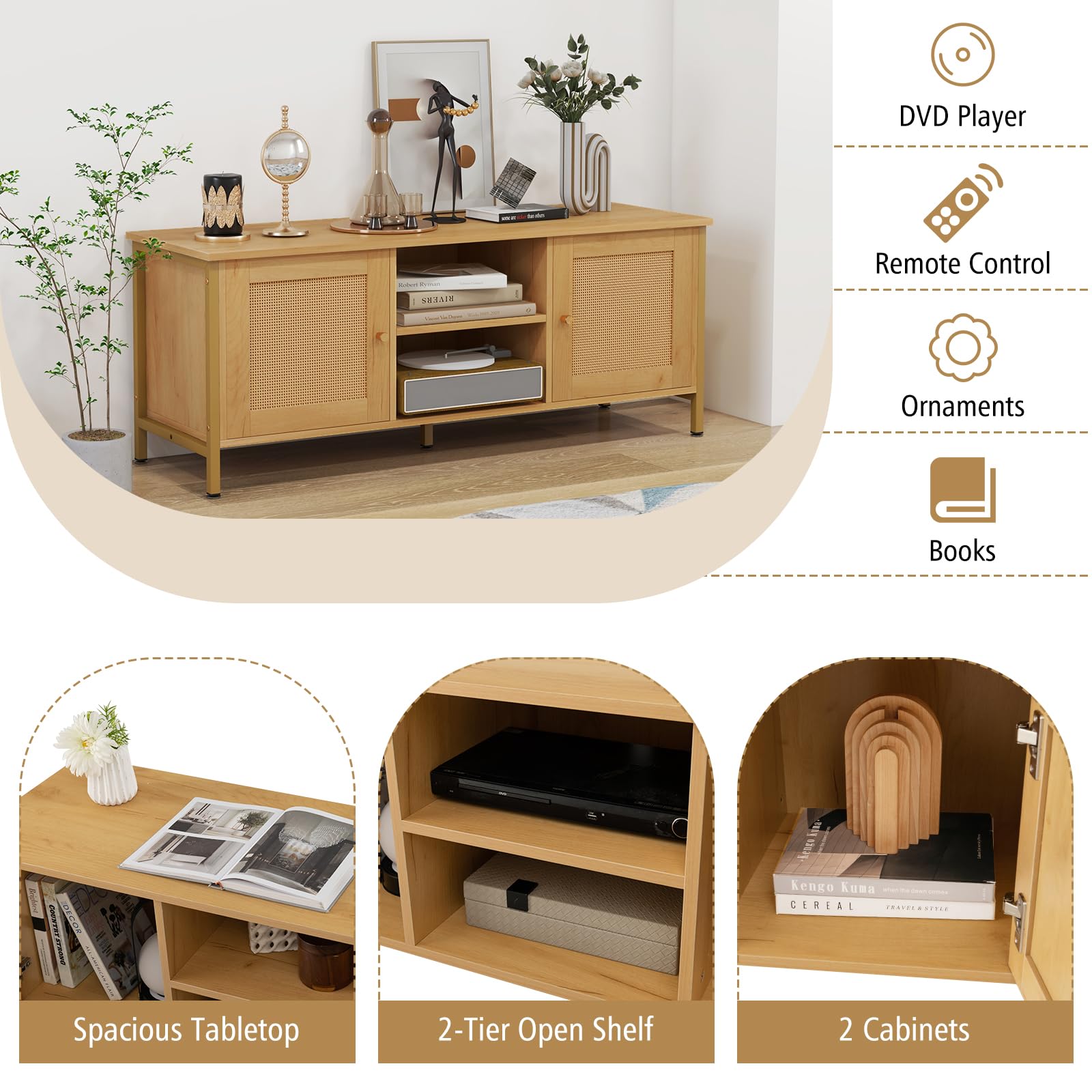 - 【Large & Sorted Storage Space】: 2-tier open shelf provides ample space to store DVD players, remote control, and game consoles. In addition, there are 2 cabinets to enlarge storage capacity for a variety of daily items, keeping your home well organized.