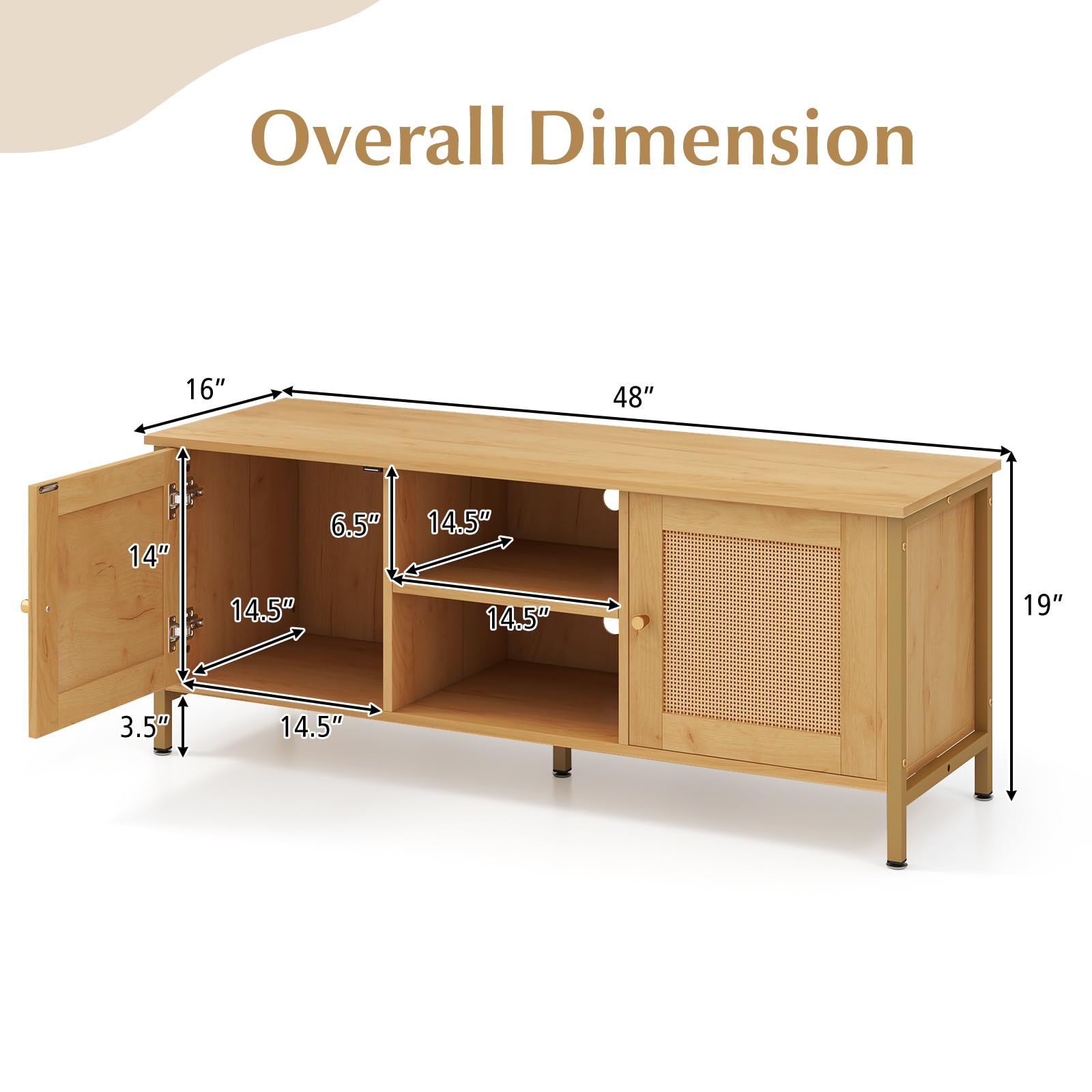Take a look at this boho style TV stand! The tabletop is spacious enough to accommodate flat screen TVs up to 55'' and some decorative items. In addition, 2 open compartments and 2 cabinets provide ample storage and display space for media items. The cable management holes make it easy to run through the power cords and keep the messy wires hidden at the back. Meanwhile, the media TV console is a stable unit, not only for the sturdy metal legs, but also for the adjustable foot pads underneath to fit the unevenness of the floor. This boho TV stand is a perfect combination of functionality and aesthetics, which also works great as a console table in the entryway.