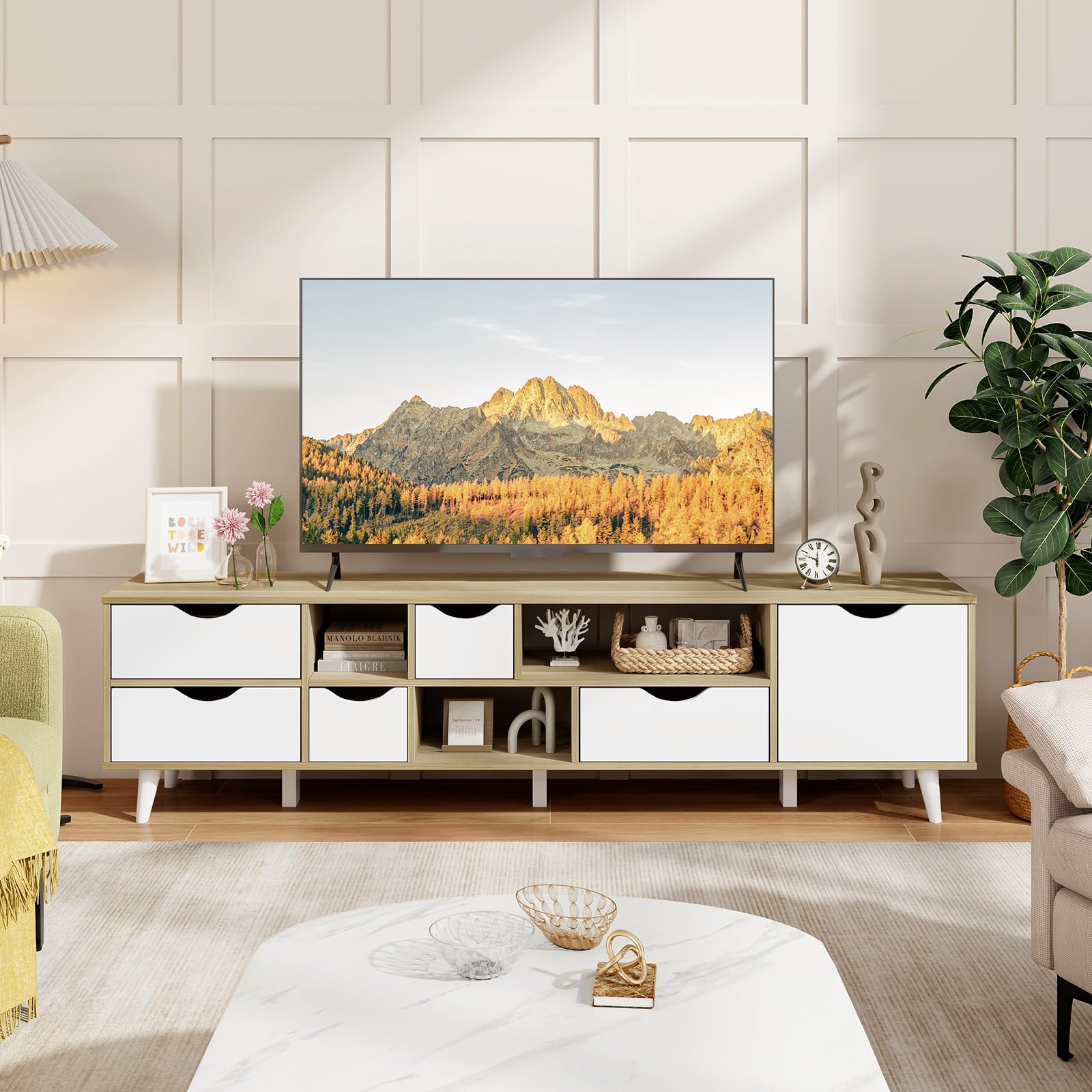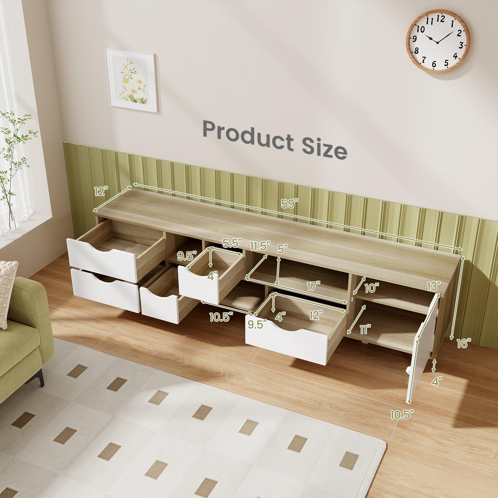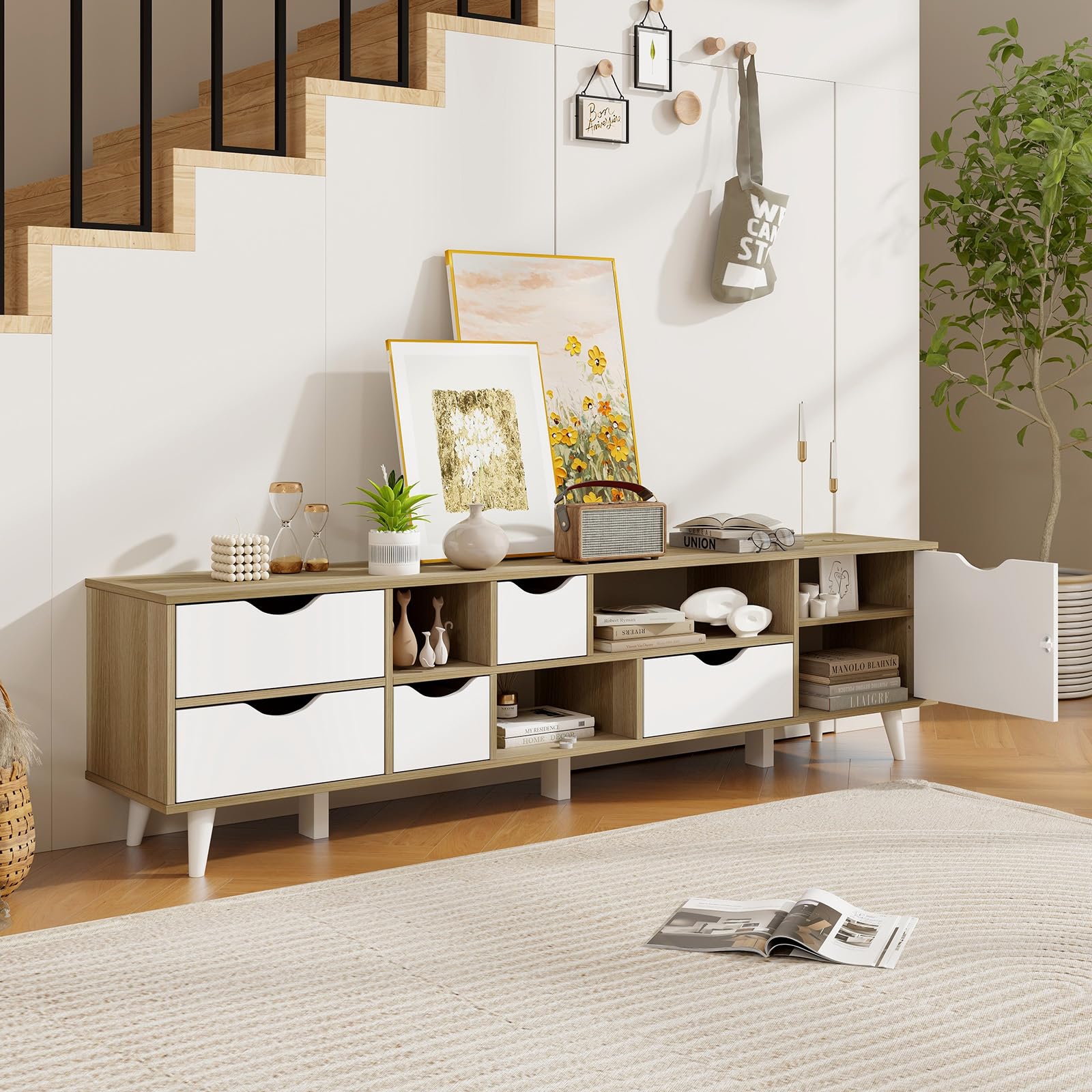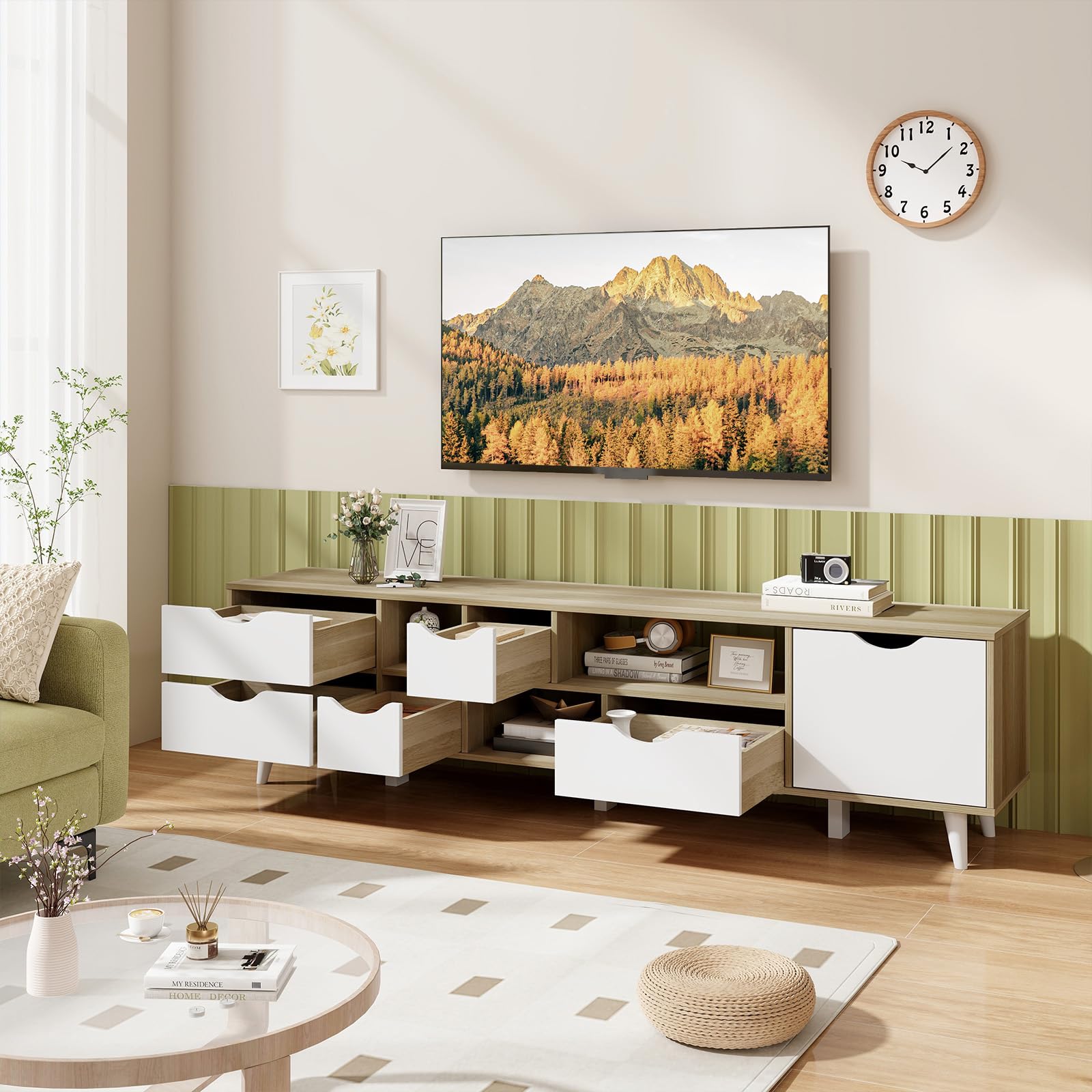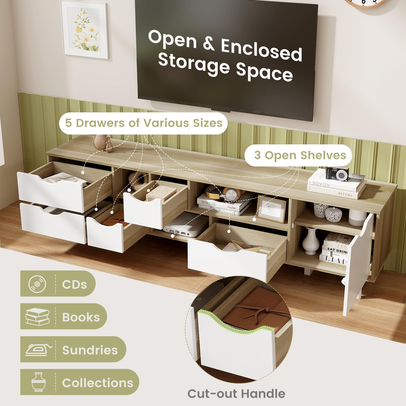 - 【Spacious Storage Solution】: With 5 pull-out drawers and 3 open compartments, this TV stand offers ample space to keep all your media essentials organized and easily accessible.