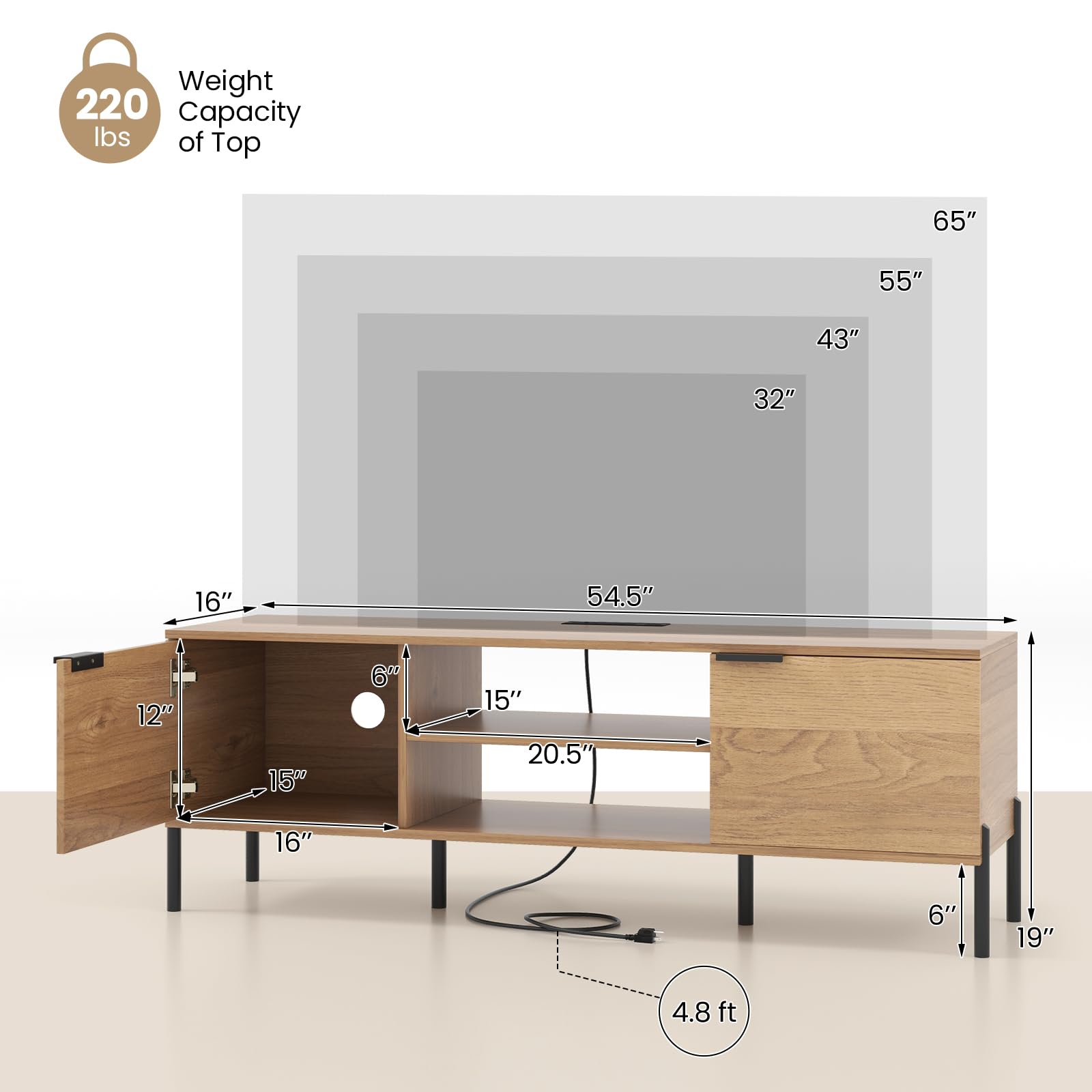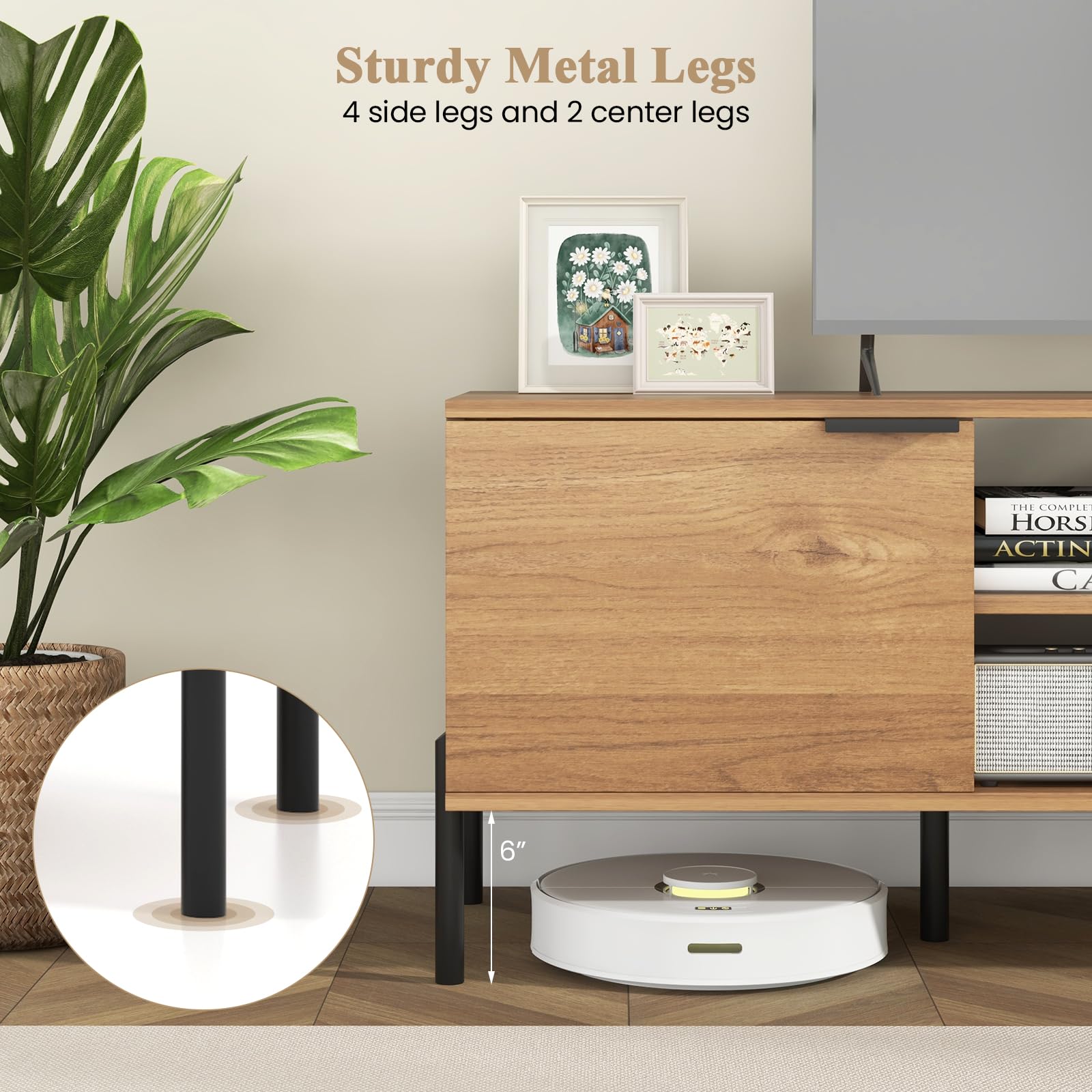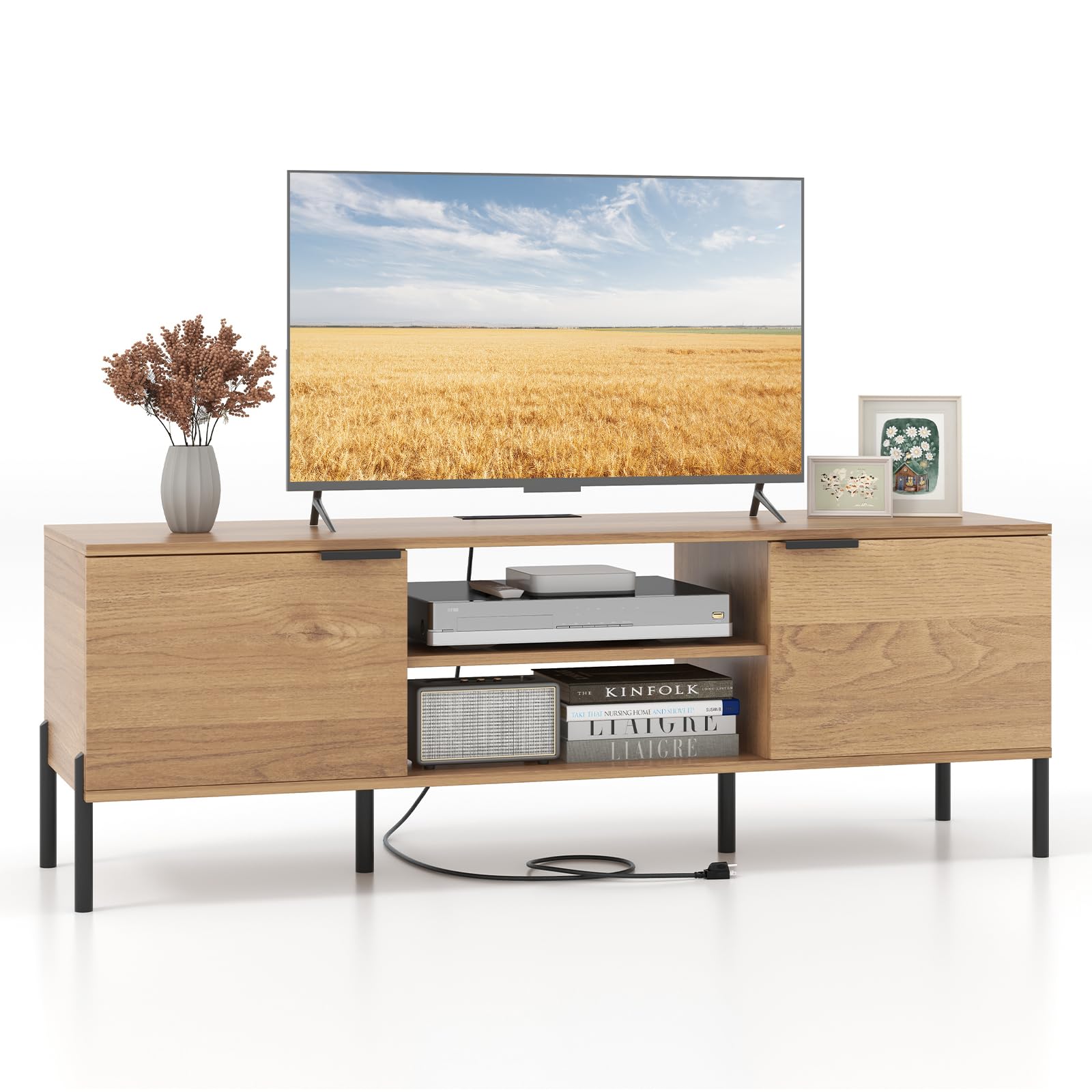 It features a built-in power station complete with 2 outlets, 1 USB port and 1 Type-C port, ensuring your electronic devices stay charged and within reach. Supported by 6 sturdy metal legs, the TV stand promotes unmatched stability and reliability. Besides, it offers ample storage options through its roomy top, 2 cabinets and 2 open shelves. What's more, the 2 cable holes helps avoid unsightly wires. Whether used as an entertainment center or as a versatile storage solution, this media console cabinet brings both functionality and a touch of modern elegance to your interior.