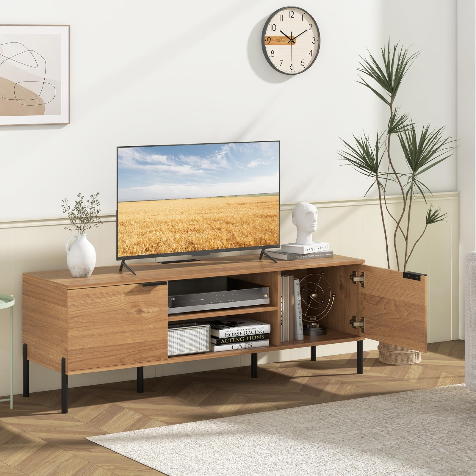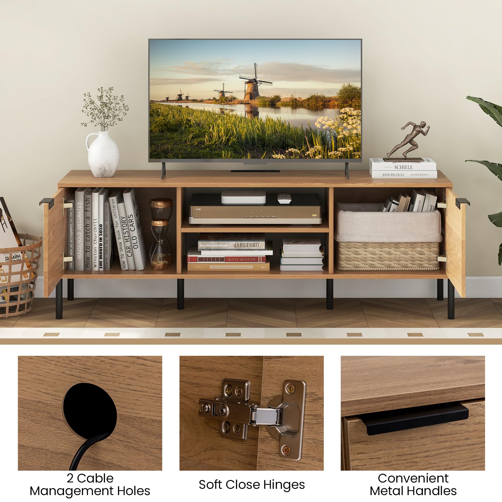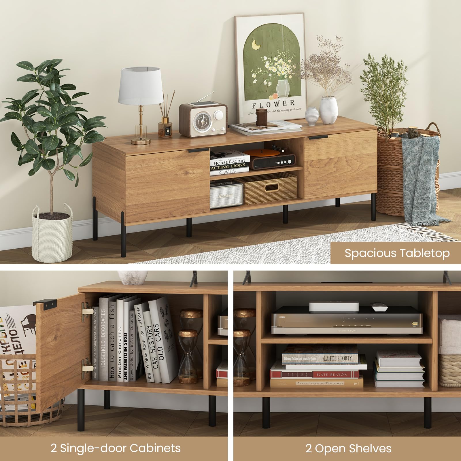It features a built-in power station complete with 2 outlets, 1 USB port and 1 Type-C port, ensuring your electronic devices stay charged and within reach. Supported by 6 sturdy metal legs, the TV stand promotes unmatched stability and reliability. Besides, it offers ample storage options through its roomy top, 2 cabinets and 2 open shelves. What's more, the 2 cable holes helps avoid unsightly wires. Whether used as an entertainment center or as a versatile storage solution, this media console cabinet brings both functionality and a touch of modern elegance to your interior.