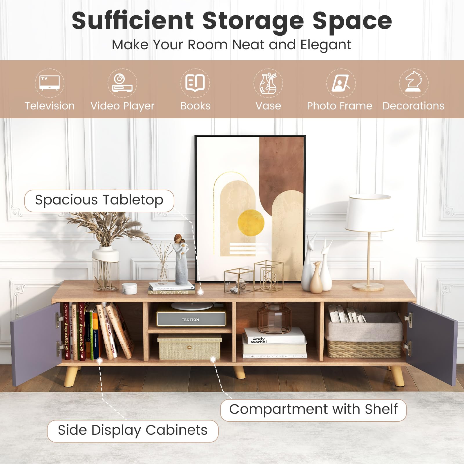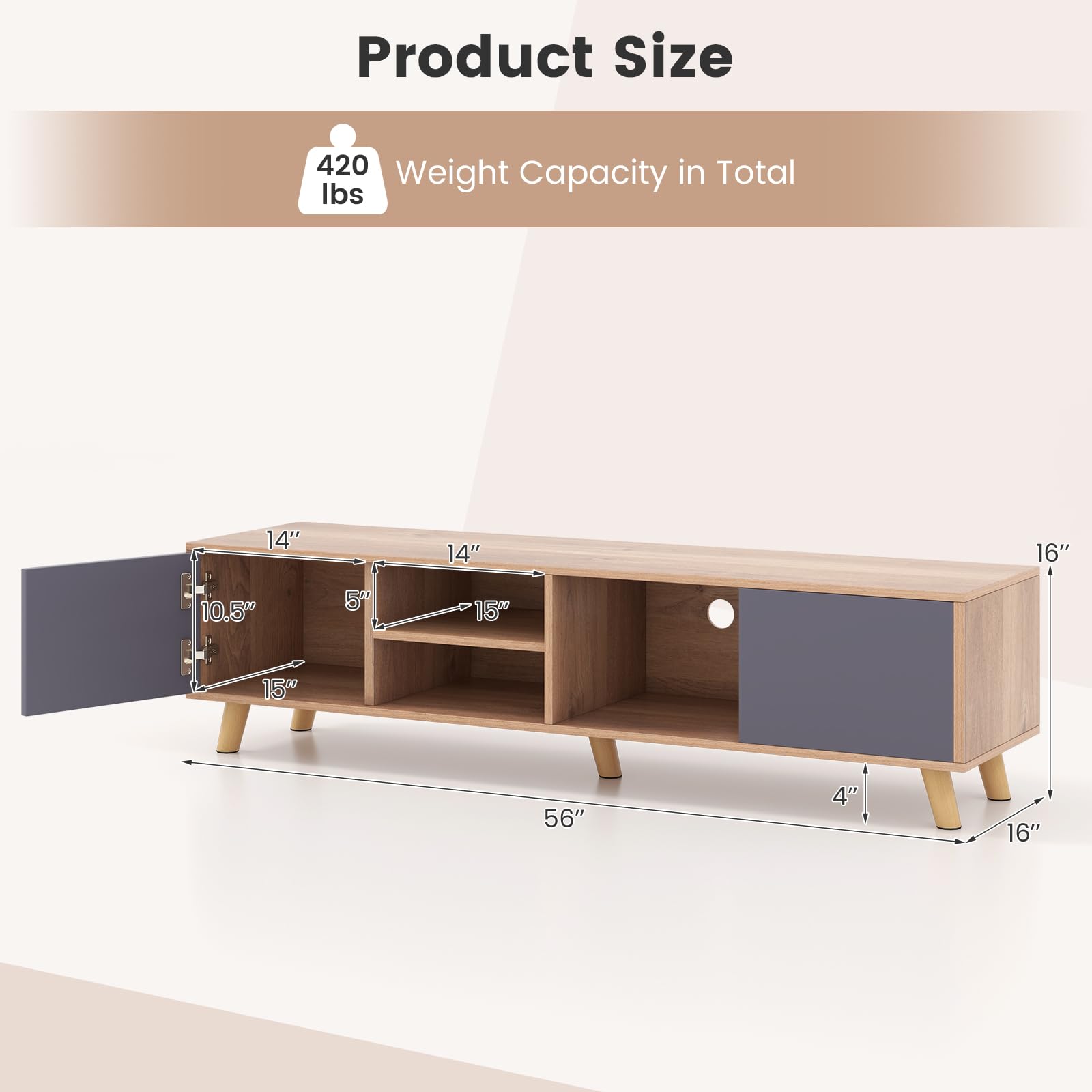Revamp your living area with our sleek TV stand, meticulously crafted for both functionality and style. This contemporary entertainment center offers generous storage options. Compatible with most flat-screen TVs up to 65 inches, this media console provides a dependable base and robust stability for an enjoyable viewing experience. Engineered for longevity, the TV cabinet features 5 sturdy legs for secure positioning. With 4 inches of clearance beneath the cabinet, upkeep is a breeze. Beyond its purpose as a television cabinet, this versatile media console seamlessly complements your decor, doubling as an elegant display unit. Its versatile design allows it to blend seamlessly in a variety of environments, injecting a touch of sophistication and utility into your living space.