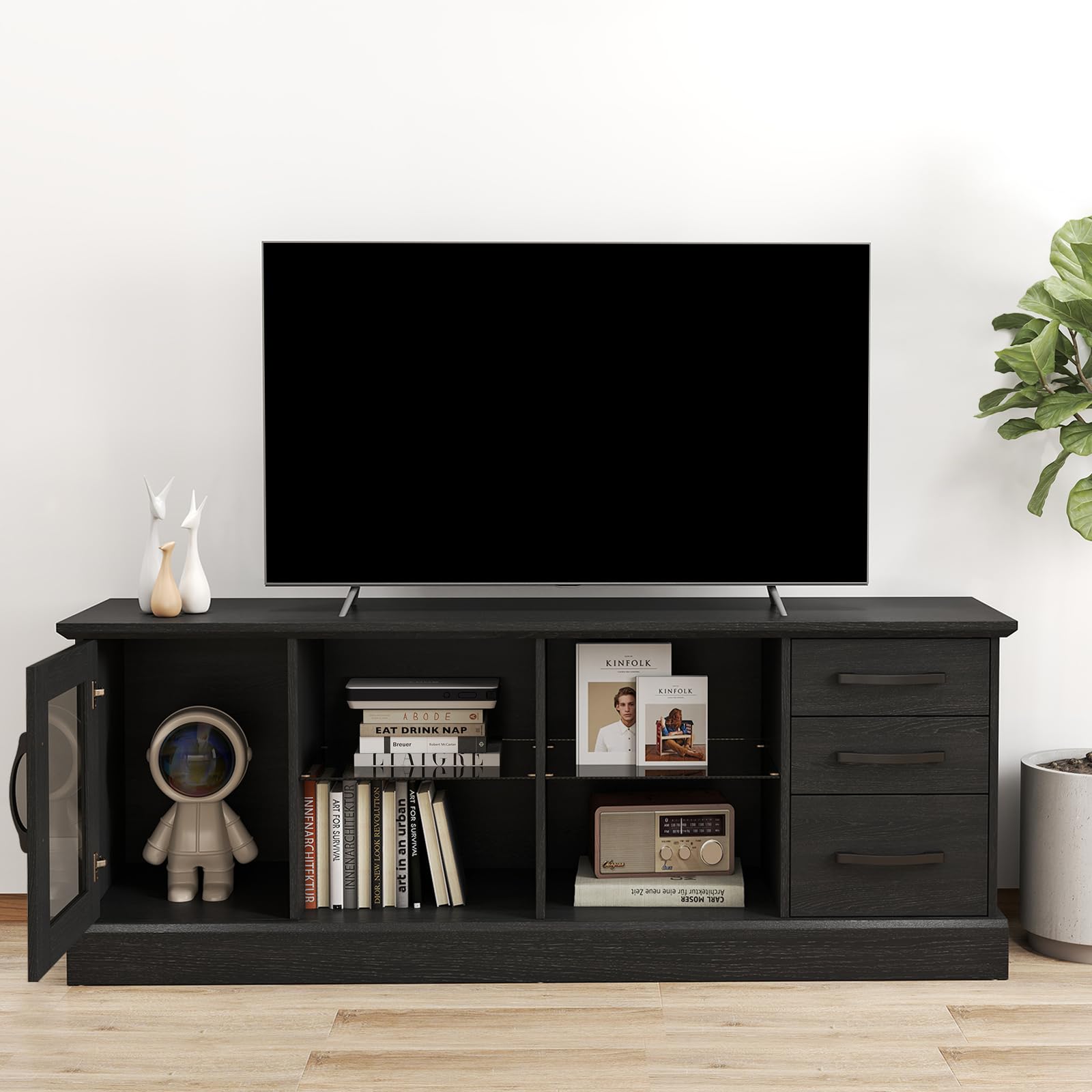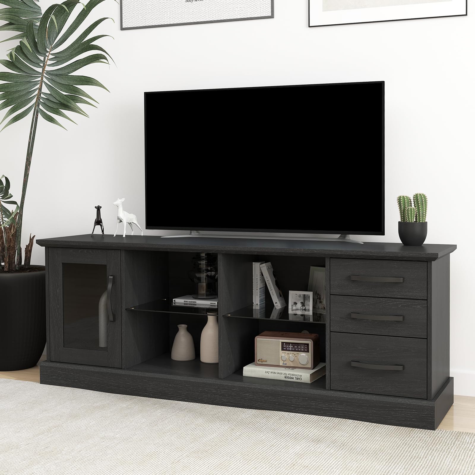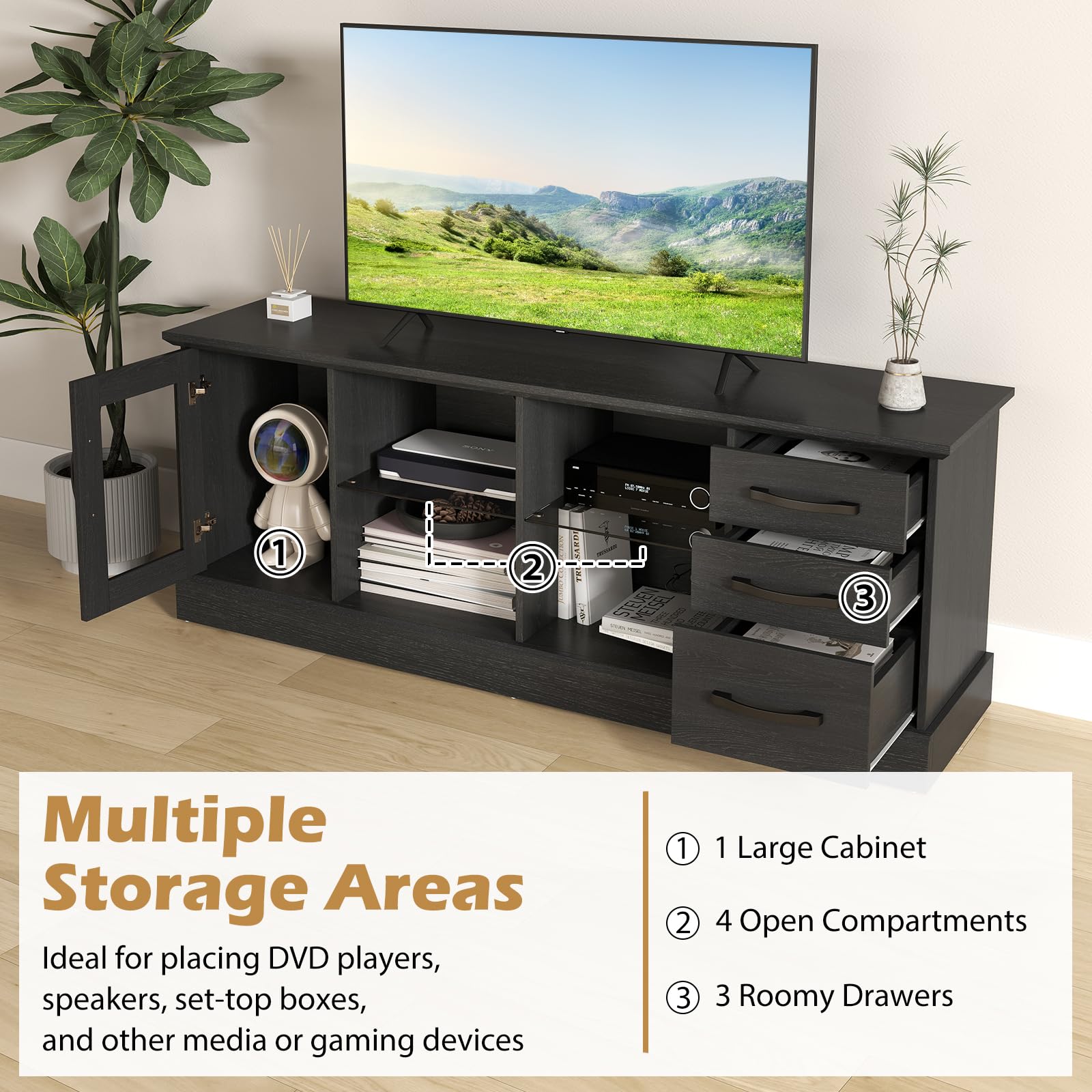 - [Multiple Storage Options]: This modern TV stand with storage features 1 large cabinet, 4 open compartments at the center, and 3 roomy drawers, making it perfect for storing DVD players, speakers, set-top boxes, and other media or gaming devices.