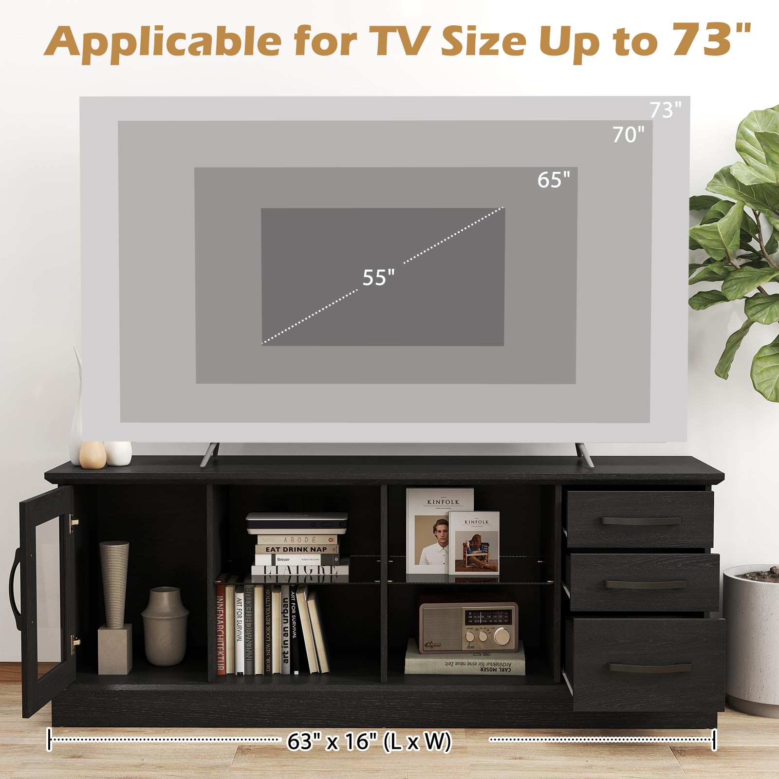 - [Fits TVs up to 73 Inches]: With a spacious 63" x 16" (L x W) countertop, this media console table is suitable for TVs up to 73 inches. The sturdy countertop can support up to 550 lbs, providing a stable and secure platform for your TV and electronics.