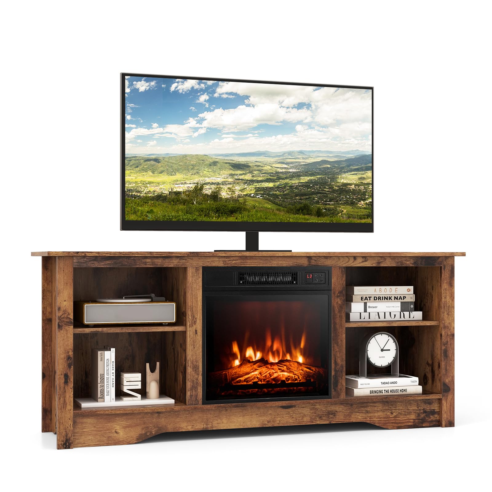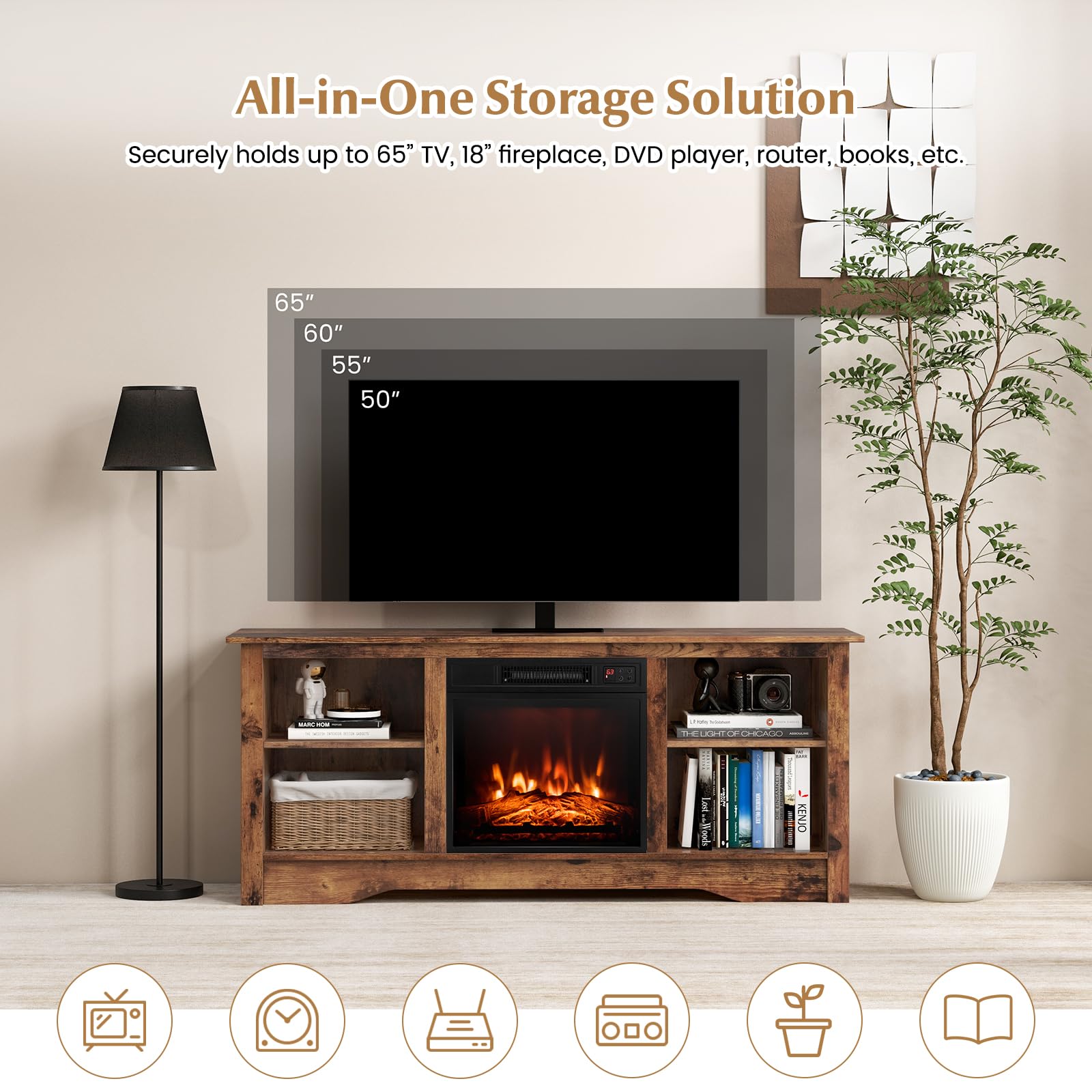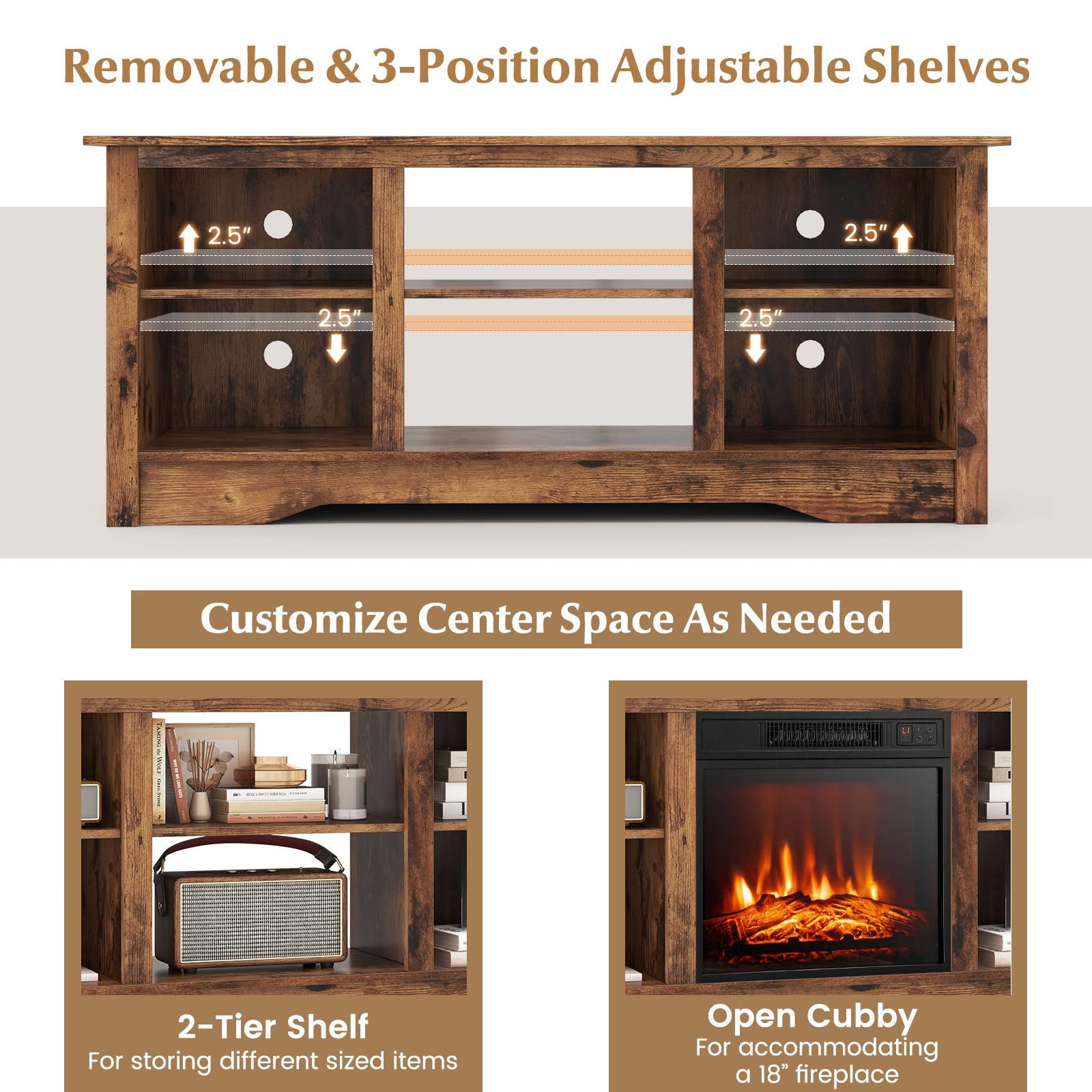 - All In One Storage Solution: Our fireplace TV stand is designed to securely hold up to a 65" TV, 18" fireplace, DVD player, router, books, and more. The removable and 3-position adjustable shelves give you the flexibility to customize the center space to suit your needs. Use it as a 2-tier shelf for storing different sized items or an open cubby for accommodating an 18" fireplace.