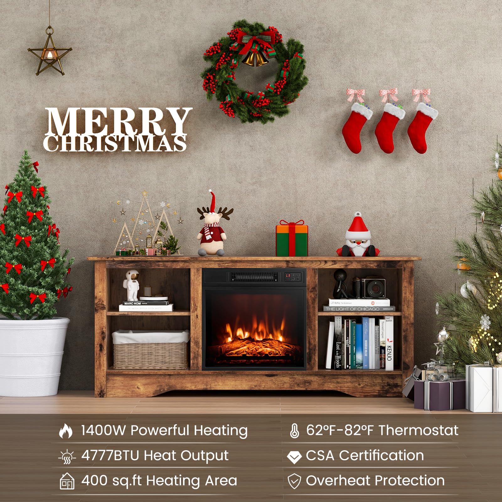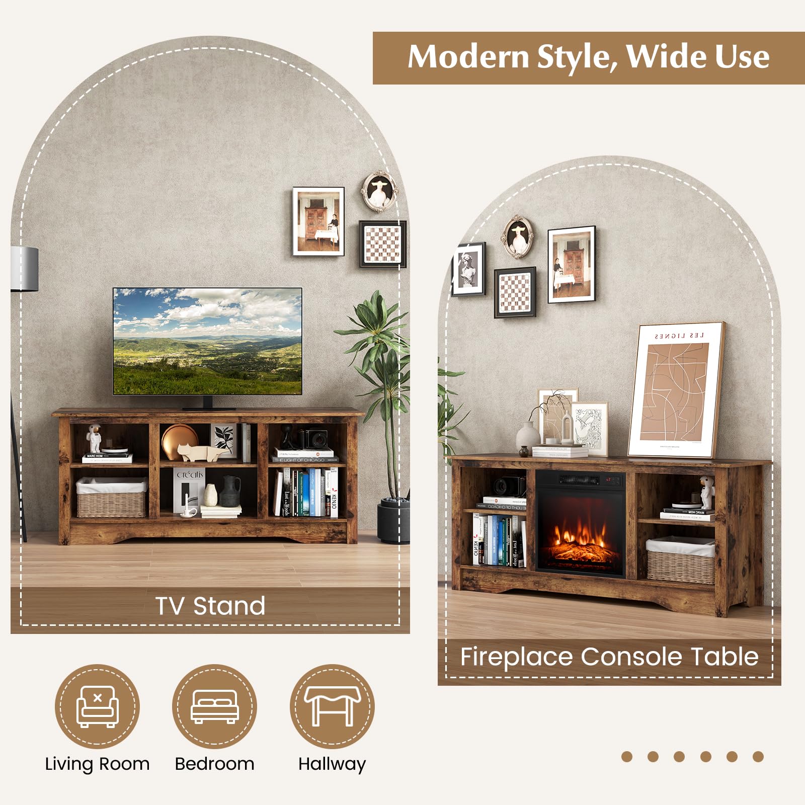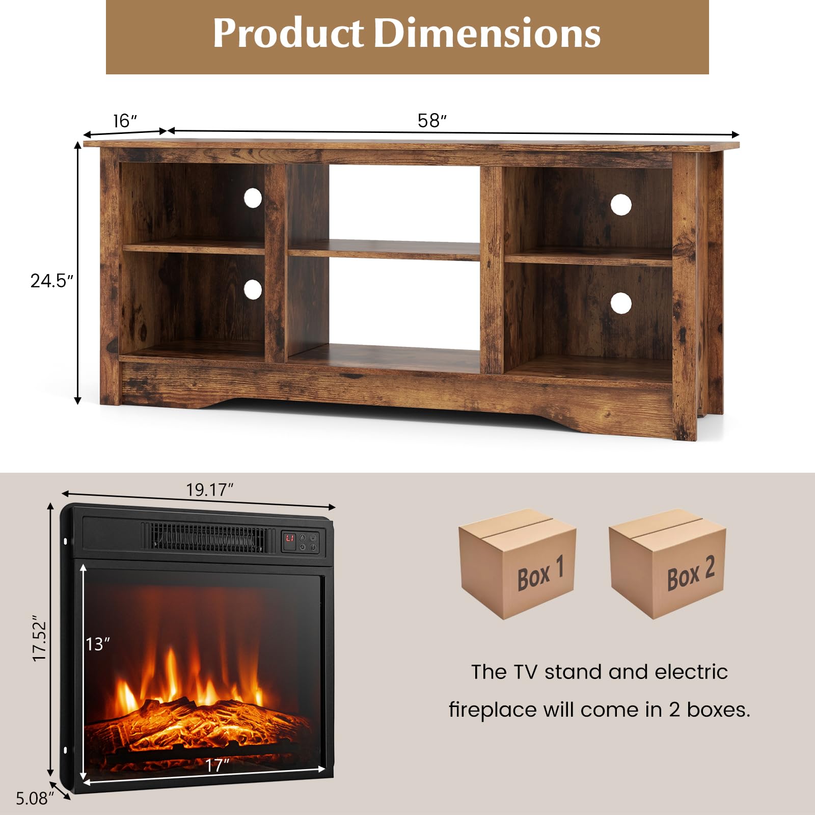 - All In One Storage Solution: Our fireplace TV stand is designed to securely hold up to a 65" TV, 18" fireplace, DVD player, router, books, and more. The removable and 3-position adjustable shelves give you the flexibility to customize the center space to suit your needs. Use it as a 2-tier shelf for storing different sized items or an open cubby for accommodating an 18" fireplace.