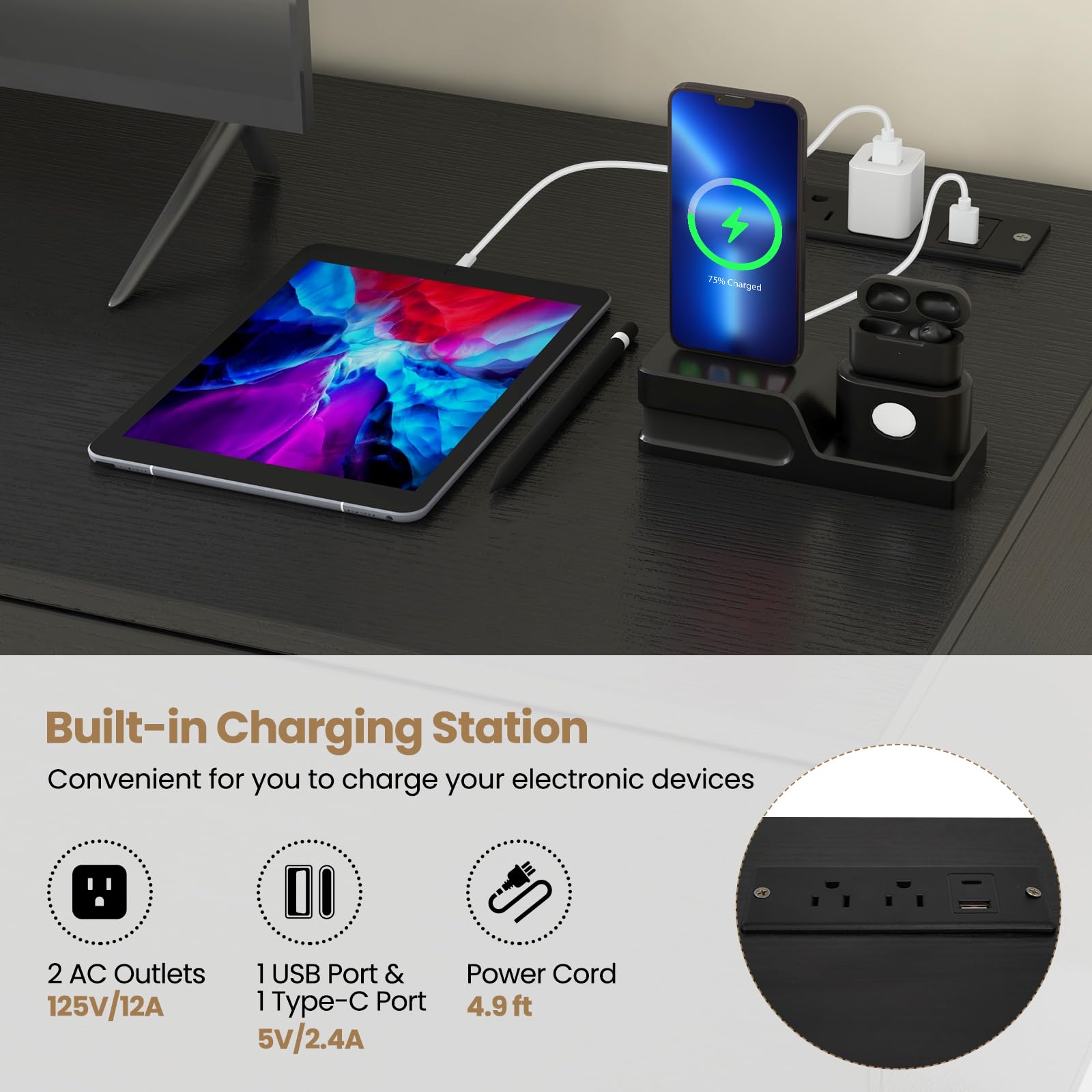• [Built-in Charging Station]: This modern TV stand's tabletop comes with a built-in charging station that include 2 AC outlets, 1 USB port, and 1 type-C port, you can conveniently power up your cell phone, laptop, and other devices without the clutter of extension cords.