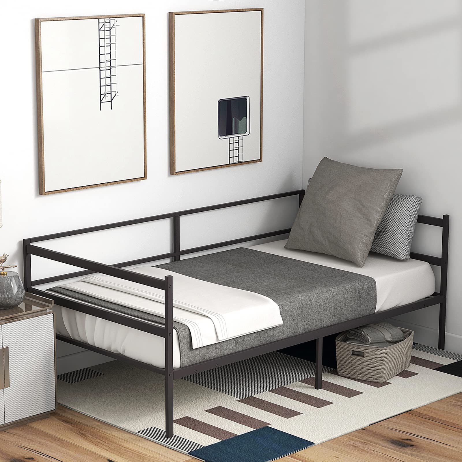 This metal daybed combines reliable quality and exquisite craftsmanship. Made of solid metal slats, the sofa bed features outstanding toughness and incredible durability for long service time. Additionally, the extra middle support legs and tight connection highly improve its overall stability. Dual use design can well suit different needs, which can be used as a bed in your bedroom or a sofa in the living room. The under-bed space is spacious enough to place plenty of idle items, capable of catering to your storage needs. This metal sofa bed with chic side rails adds highlight to your home and matches seamlessly with interior decoration