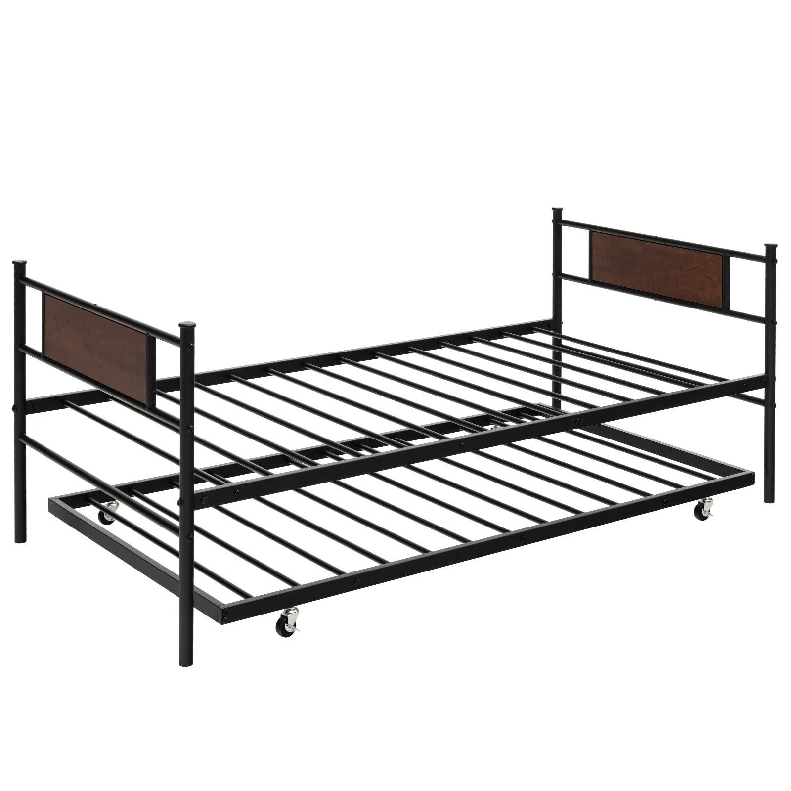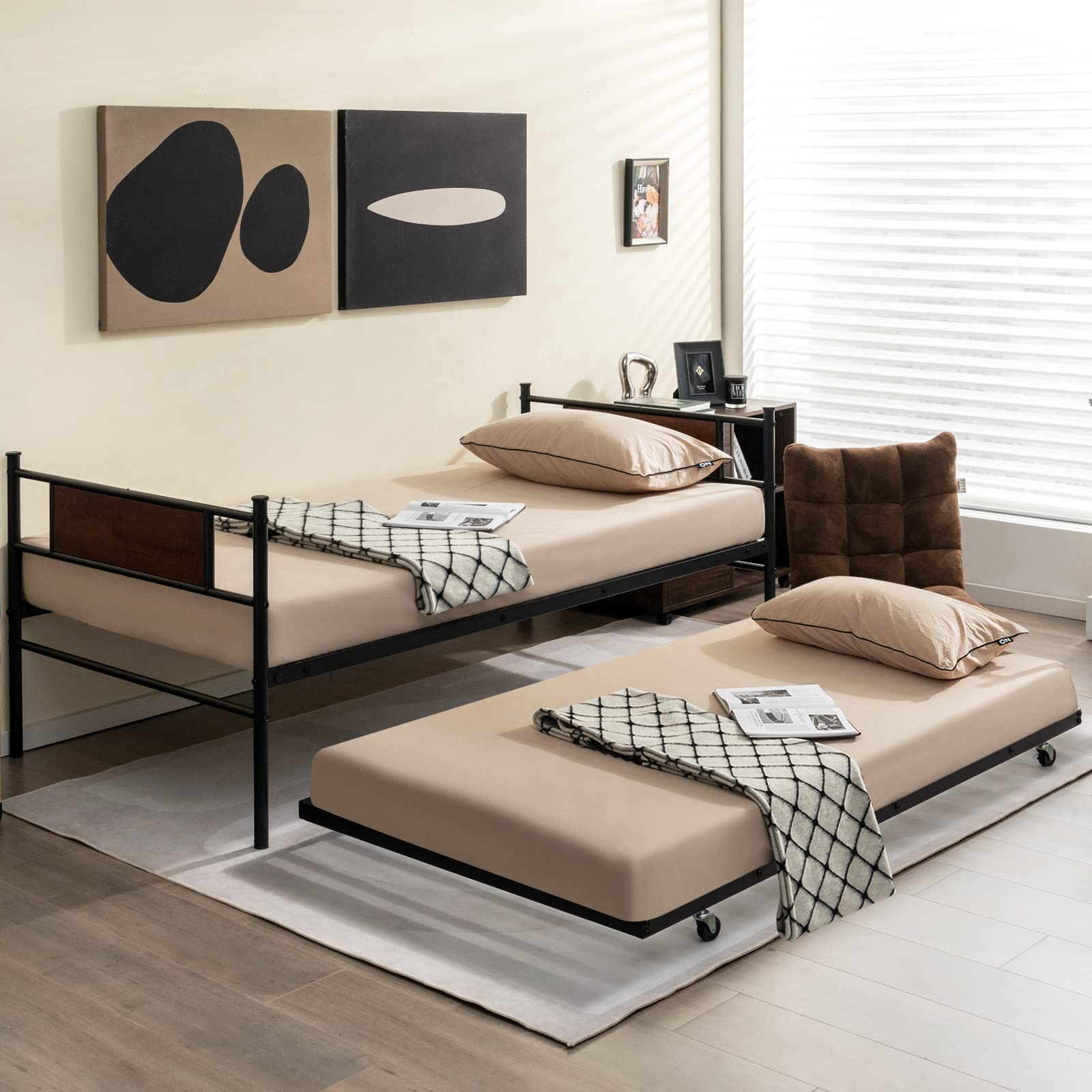 - Twin Daybed with Built-in Casters: Thanks to 4 lockable rubber casters, the daybed trundle set offers 2 different using methods. When the trundle is put away, it becomes a cozy sofa with armrests as a whole. After you pull out and fix the trundle, it perfectly serves as 2 platform bed frames, further expanding the sleeping areas.