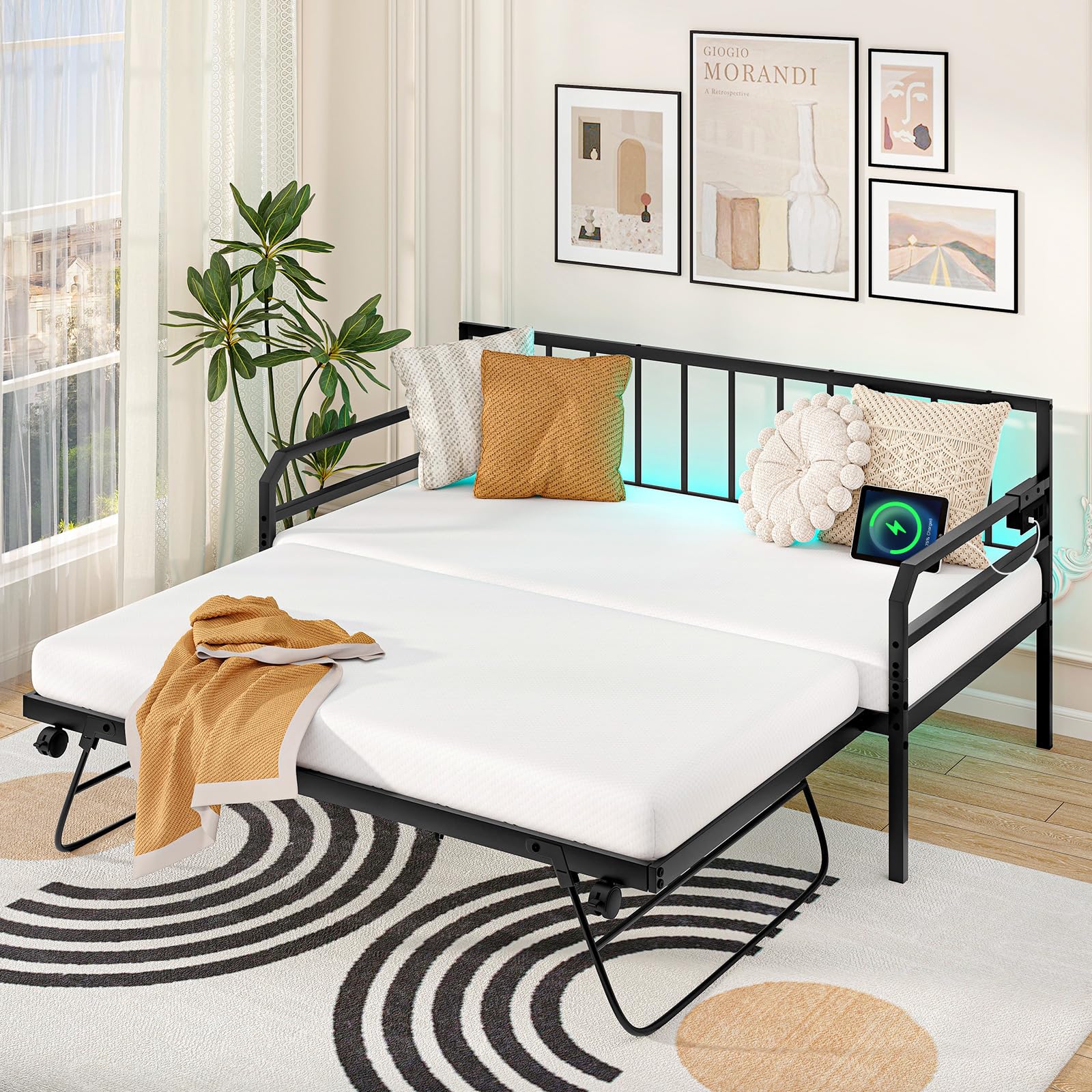 The built-in charging station is designed to keep devices powered and within reach, perfect for lounging, browsing, or working. But that's not all! Experience tailored illumination with the integrated LED light on this daybed. Adjustable settings with the app or remote control provide a soft and ambient glow for a cozy atmosphere in your room. This twin bed frame serves as a comfortable seating option during the day and transforms into a cozy sleep space at night with its pop-up trundle. Crafted with a robust metal frame, this daybed provides ultimate durability and prevents sagging. Whether used for sitting during the day or as an extra sleeping space at night, this daybed offers flexibility and style.