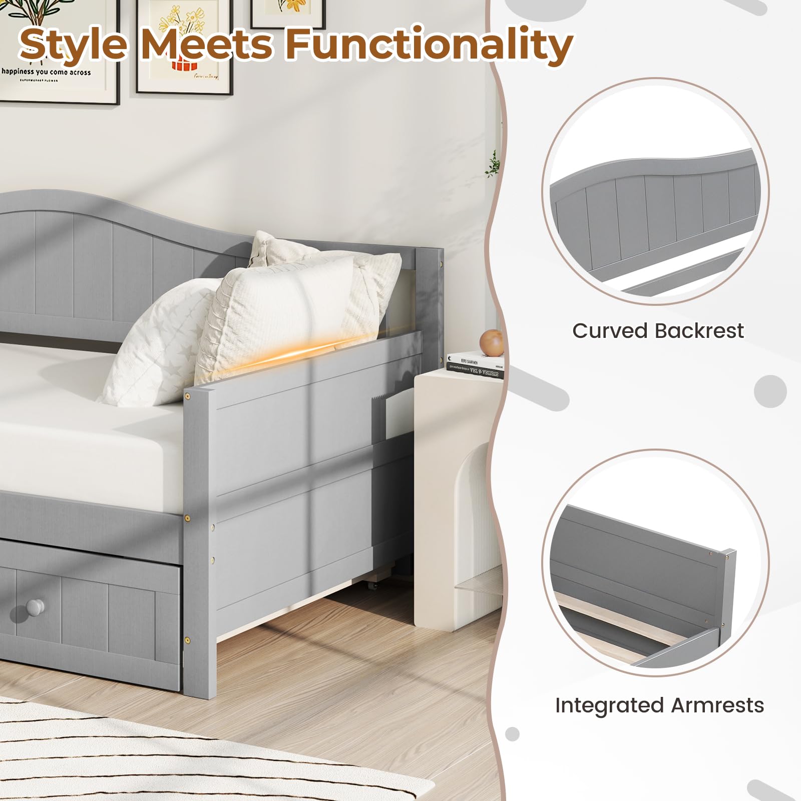 The daybed doubles as seating or need an extra bed for overnight guests. Perfect for visitors, the trundle slides out smoothly and provides an additional sleeping area without taking up extra space. Besides, crafted from solid wood and supported by sturdy plywood slats, the daybed ensures strong load bearing and reliability. Equipped with backrest and armrests, the sofa bed combines style with practicality. Additionally, with sleek design and modern appearance, this bed frame seamlessly blends in with different home styles.
