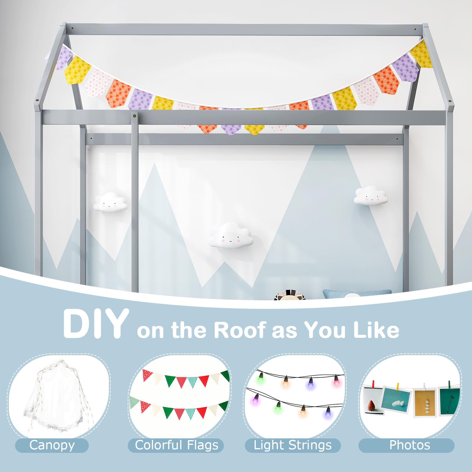 - [DIY on the Roof as You Like]: Transform your child’s room into a magical haven with our twin size house bed! It features a customizable roof design, allowing you to adorn the bars with canopy, colorful flags, light strings, and photos (not included) to create a dreamy sleeping environment.
