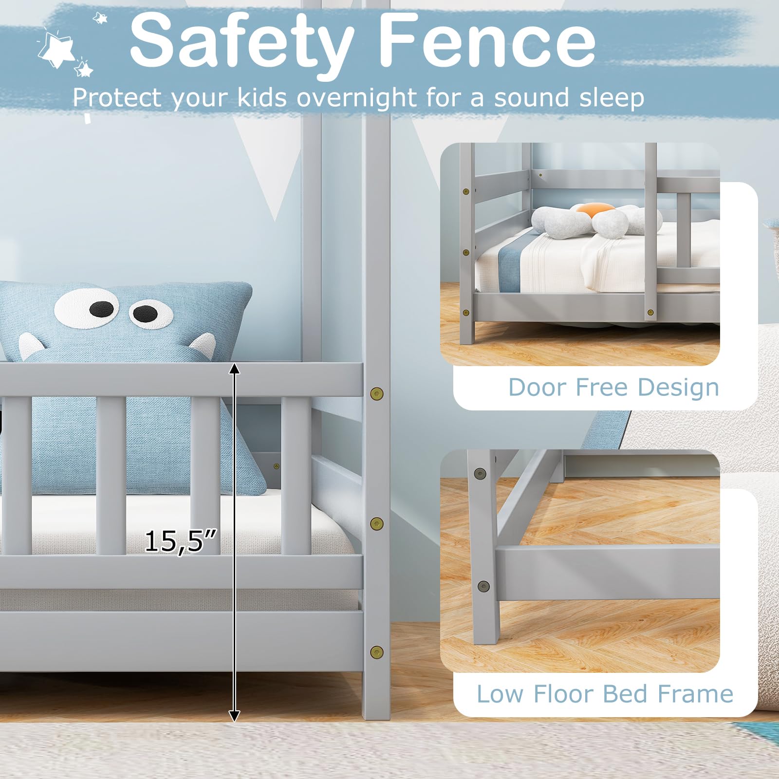 - [Child-Safe Design]: The low floor bed frame with a door-free design ensures safe and effortless entry and exit for your child, reducing the risk of falls and injuries. Moreover, the house bed features a 15.5" high full-length safety fence to protect your kids overnight for a sound sleep.