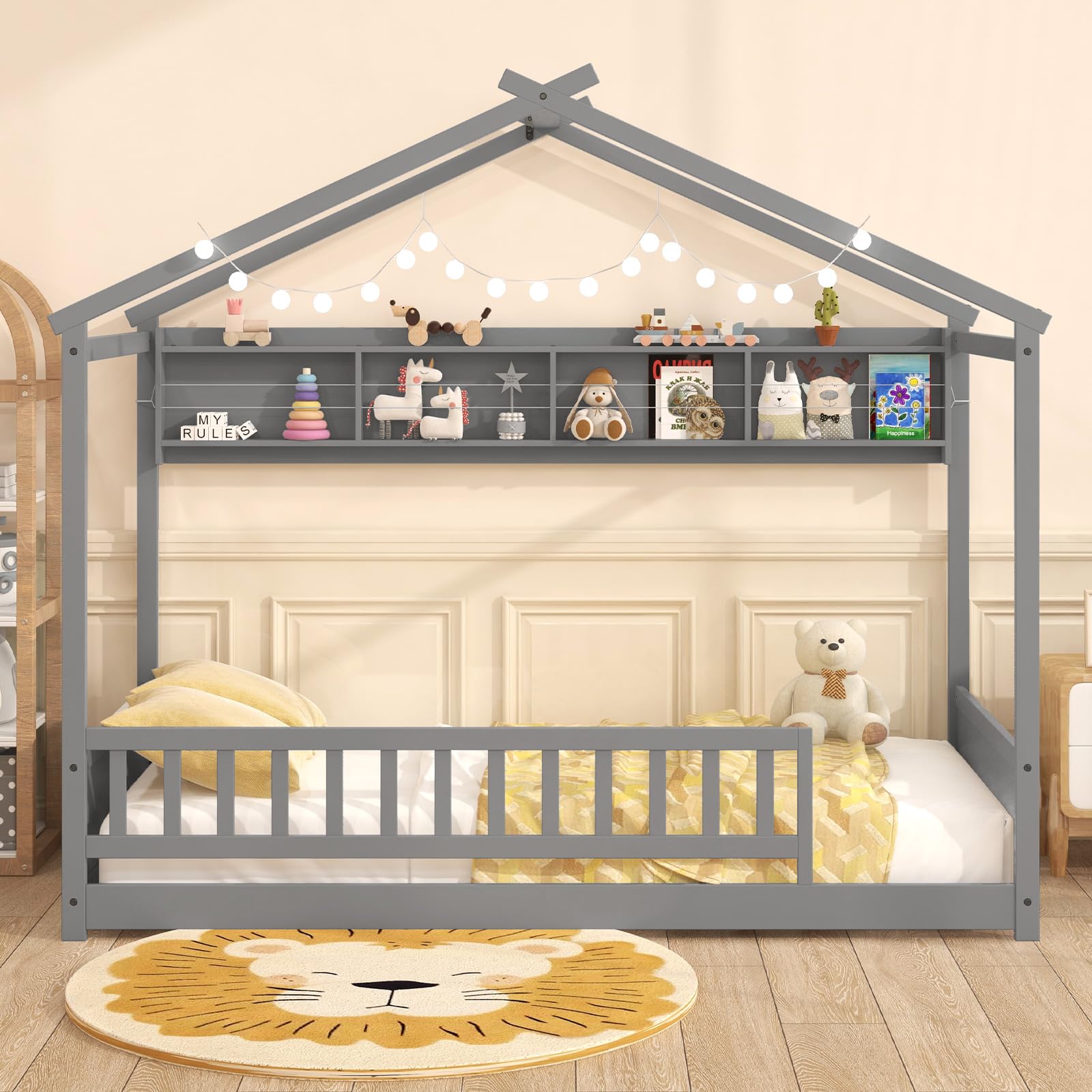 Discover magical bedtimes! Wave goodbye to ordinary sleep and hello to enchanting dreams with our twin house bed for kids - where every bedtime is an adventure! Designed with little explorers in mind, this floor bed twin merges the magic of a playful sanctuary with the calm of a comfy sleep nook. Ideal for fostering independence, its Montessori-inspired build sits low to the ground. Confidence in safety shines with its solid wood construction and multiple stability - enhancing plywood slats to handle up to 250 lbs! Plus, innovative above-bed storage - complete with anti-falling safeguards - keeps the clutter away and essentials within safe reach. Bring this blend of joy, safety, and neat organization to your child’s room and witness their delight. Create a snug, secure haven for your little one’s sweetest dreams. Click to make their dream space a reality!