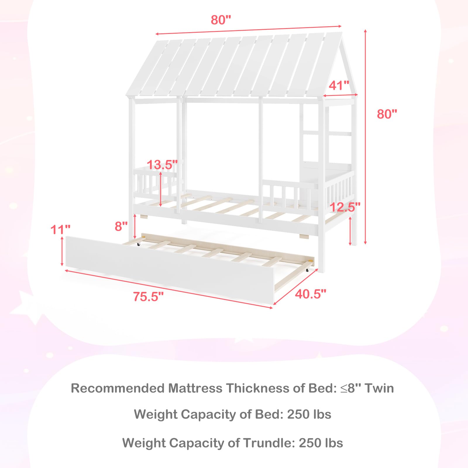 Crafted with imagination in mind, this twin bed frame features a unique house shape complete with a decorative roof. The platform bed is equipped with a practical trundle underneath, ideal for sleepovers when extra sleeping space is needed. The solid wood playhouse bed is supported by plywood slats that help distribute weight evenly and extend the lifespan of the mattress, maintaining a comfortable sleeping surface. Safety is a priority in this bed, which includes sturdy guardrails to protect your little ones as they sleep. This house bed celebrates independence and comfort, turning bedtime into an enchanting experience.