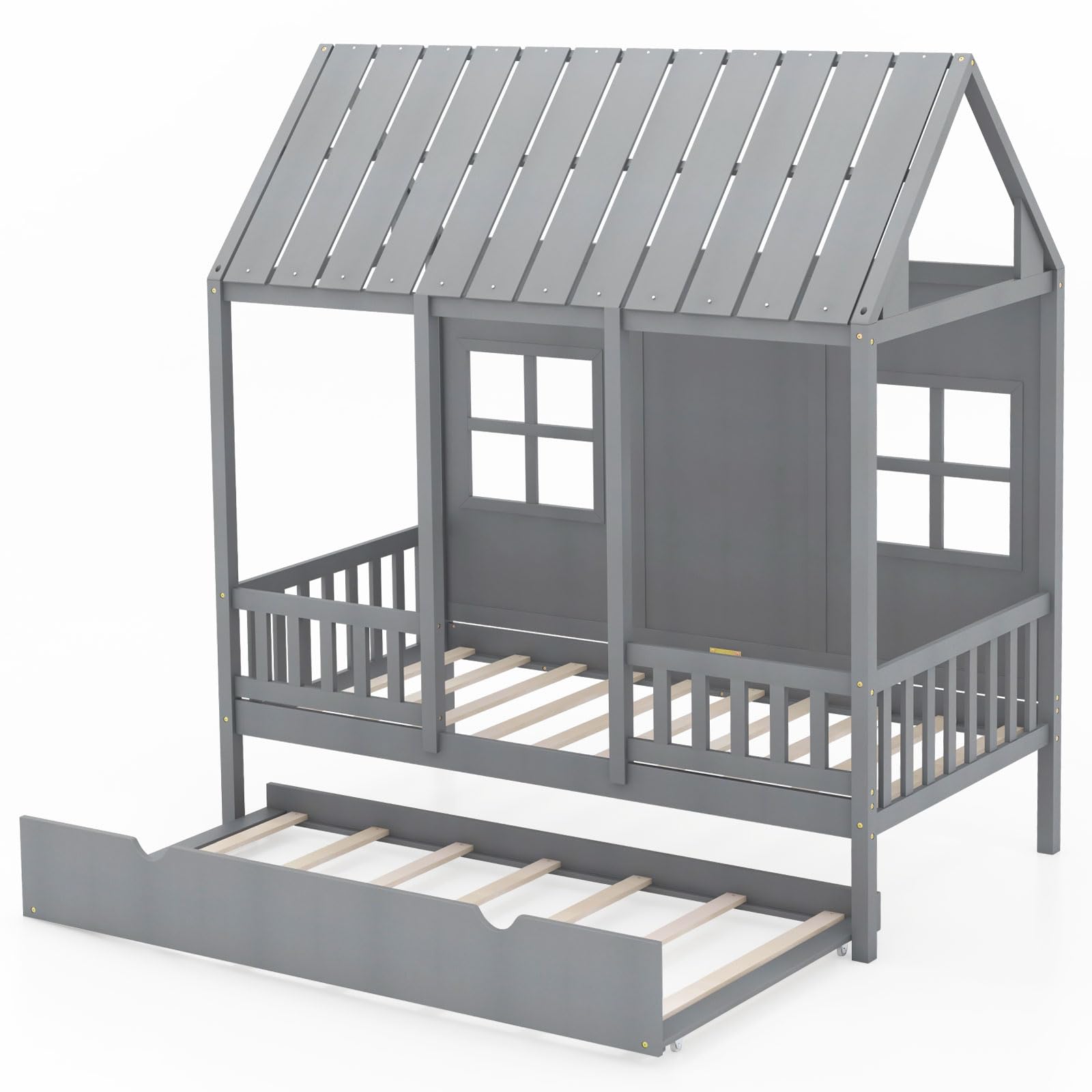 Transform your child’s bedroom into a magical wonderland with our captivating house bed with trundle. Crafted to ignite their wildest adventures, this whimsical bed creates a cozy sanctuary where dreams come true. With a safety guardrail that ensures worry-free nights, little ones can snuggle up knowing they’re protected. Plus, the genius trundle bed adds a secret sleeping spot for their favorite play dates or a clever storage solution for toys and treasures. Built to withstand the test of time, this bed is constructed from premium solid wood, plywood, and MDF materials, promising durability and stability. No need for a clunky box spring - the solid slatted platform design effortlessly supports a whopping weight. Unleash your child’s imagination as they explore every nook and cranny of this exceptional bed. Feel free to decorate the roof as you like.