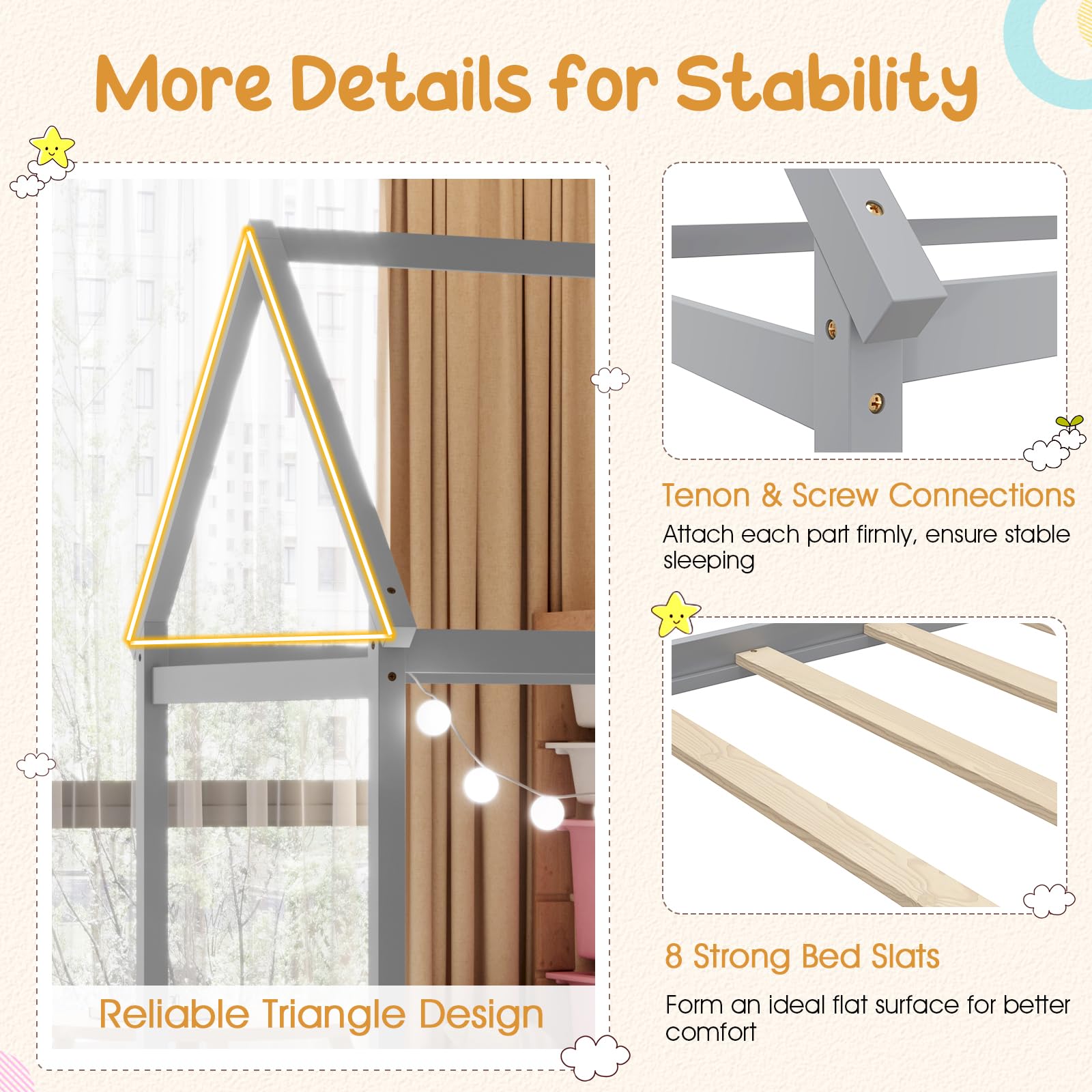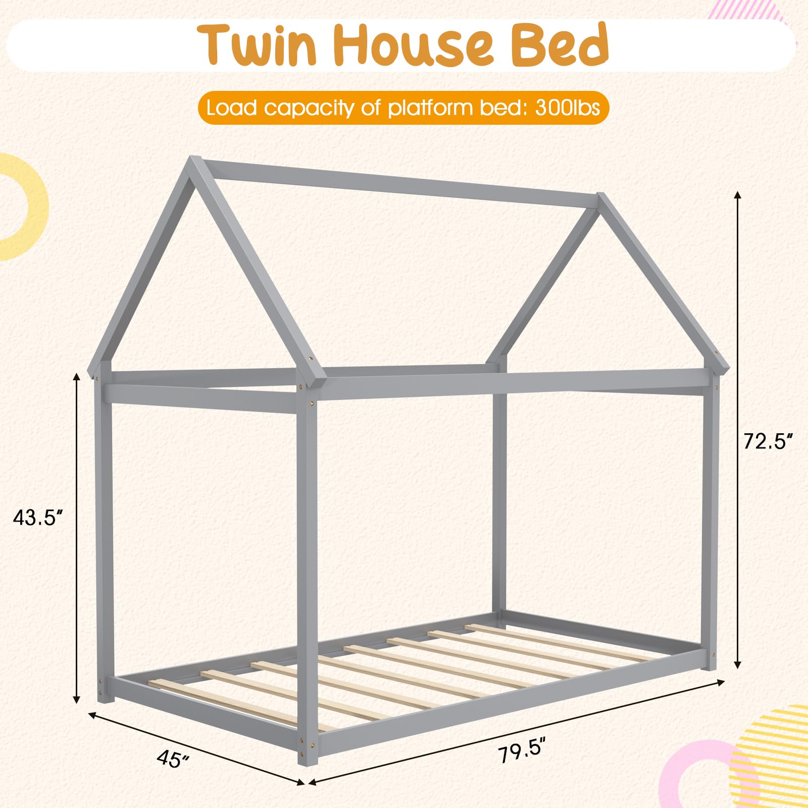 Transform your child’s bedroom into a magical wonderland with our whimsical twin house bed! Say goodbye to baby cribs and hello to a super cool, low-to-the-ground floor tent bed that promotes independence and boosts confidence. Watch your little angel easily climb in and out, feeling like a big kid! This house-shaped bed is constructed with top-notched solid wood frame and durable plywood slats, providing ultimate durability and safety. Let your imagination run wild by customizing it with curtains, lights, or other magical ornaments. Not just for sleeping, this versatile bed doubles as a cozy reading nook, play space, or secret fort. Bring joy and wonder into your child's life with this enchanting bed today!