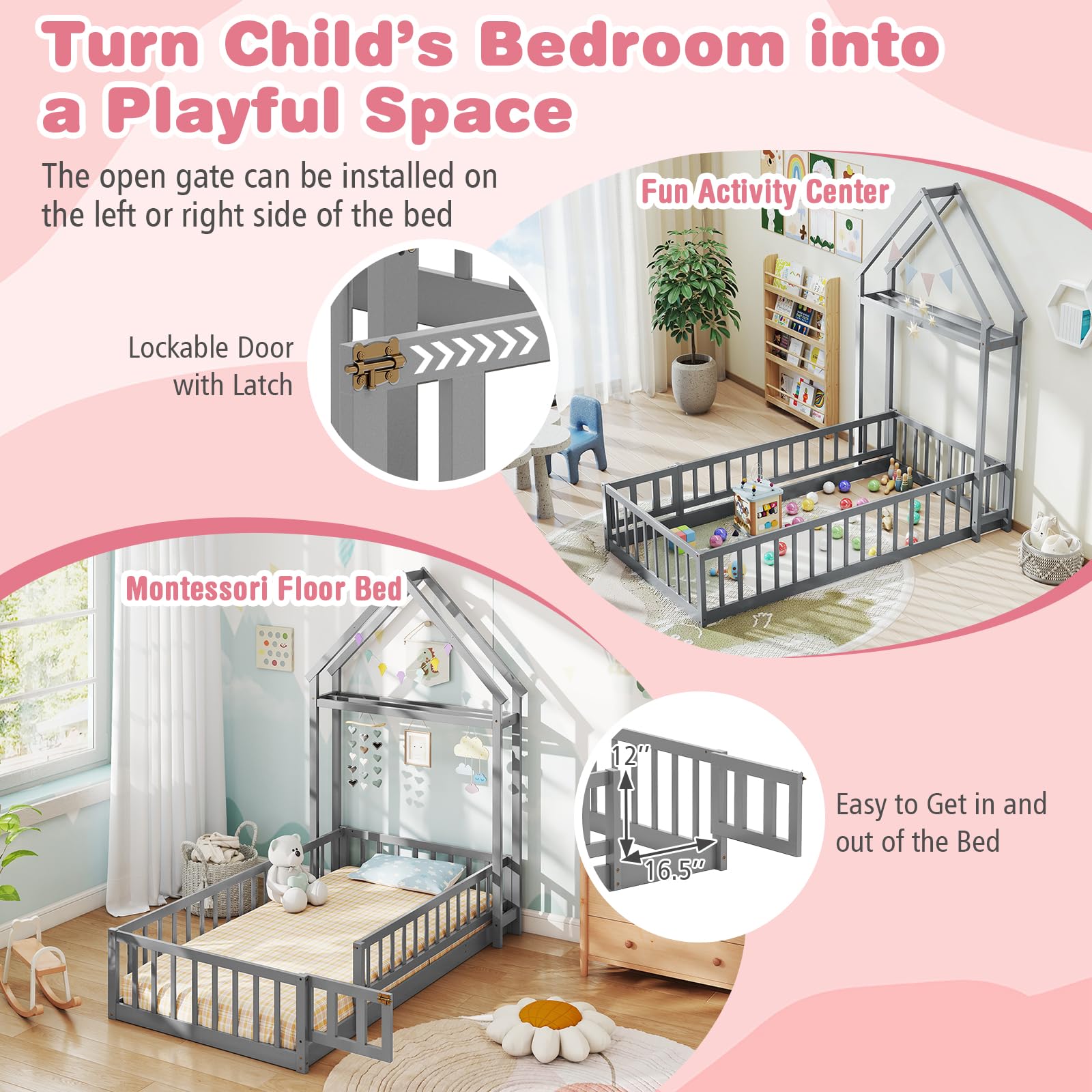 Featuring a charming house-shaped headboard, the twin size floor bed adds a whimsical touch to any room decoration. Moreover, this wood bed frame is designed without slats to sit directly on the floor, embracing the Montessori principle of accessibility and self-reliance. The lockable open gate makes it easy to get in and out of bed on their own while high guardrails ensure peace of mind. For more convenience, the clothes hanger can be installed on the side of the bed or fixed to the wall, providing a practical solution for organizing outfits or costumes. This Montessori bed not only serves as a cozy sleep space but also doubles as a potential play area during the day.