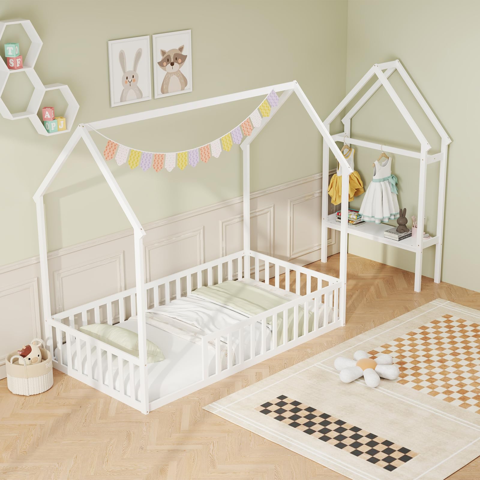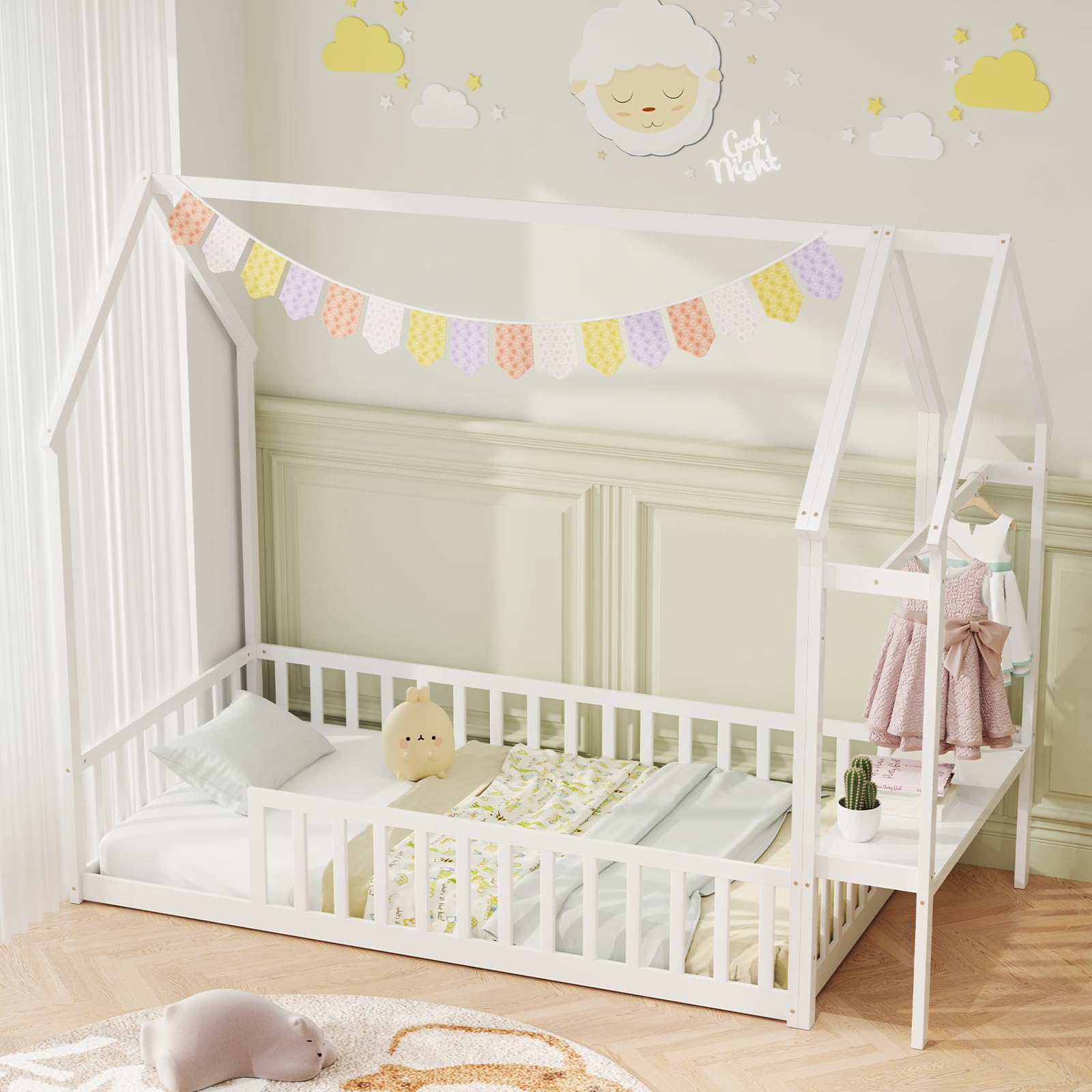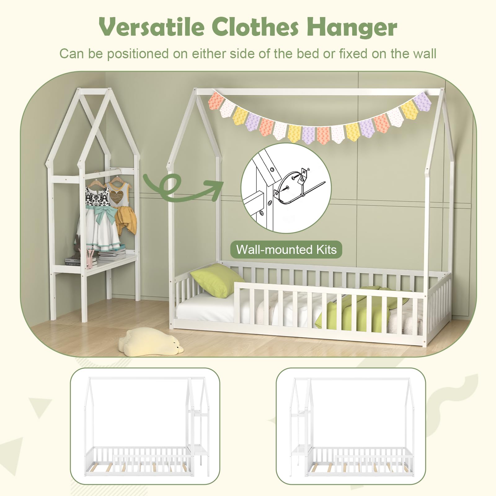 This floor bed frame features a unique house-shaped design with a roof, adding a touch of whimsy to any bedroom. The reversible clothes hanger can be placed on either side of the bed or mounted on the wall, providing flexibility in room layout. In addition, the practical storage shelf offers a convenient space to store and display items. The low floor design makes the bed ideal for promoting self-confidence. Crafted from solid wood with plywood slats support, this house bed ensures durability and stability for a restful night's sleep. Safety is paramount, with full-length guardrails offering added security for your child. Upgrade kid’s bedroom with this charming and practical Montessori bed that combines style, functionality, and safety.