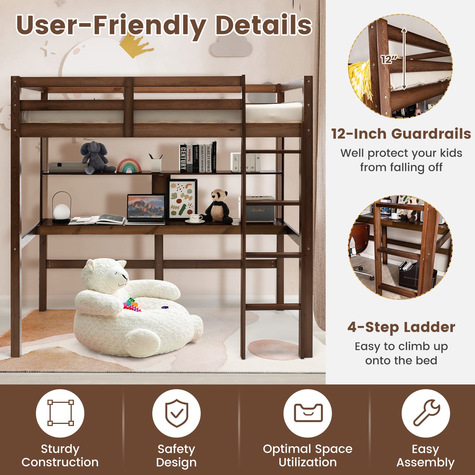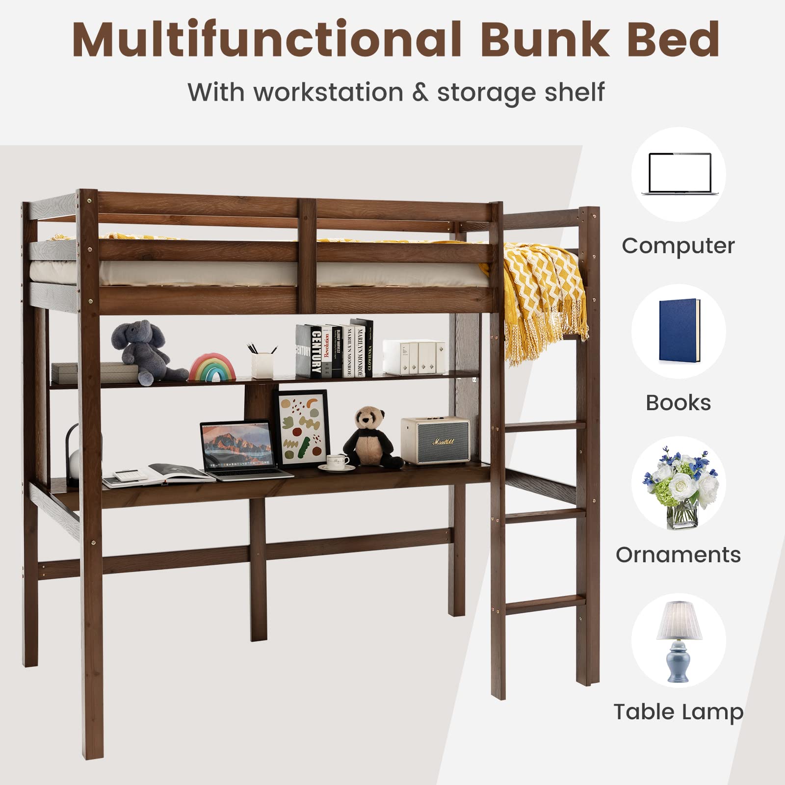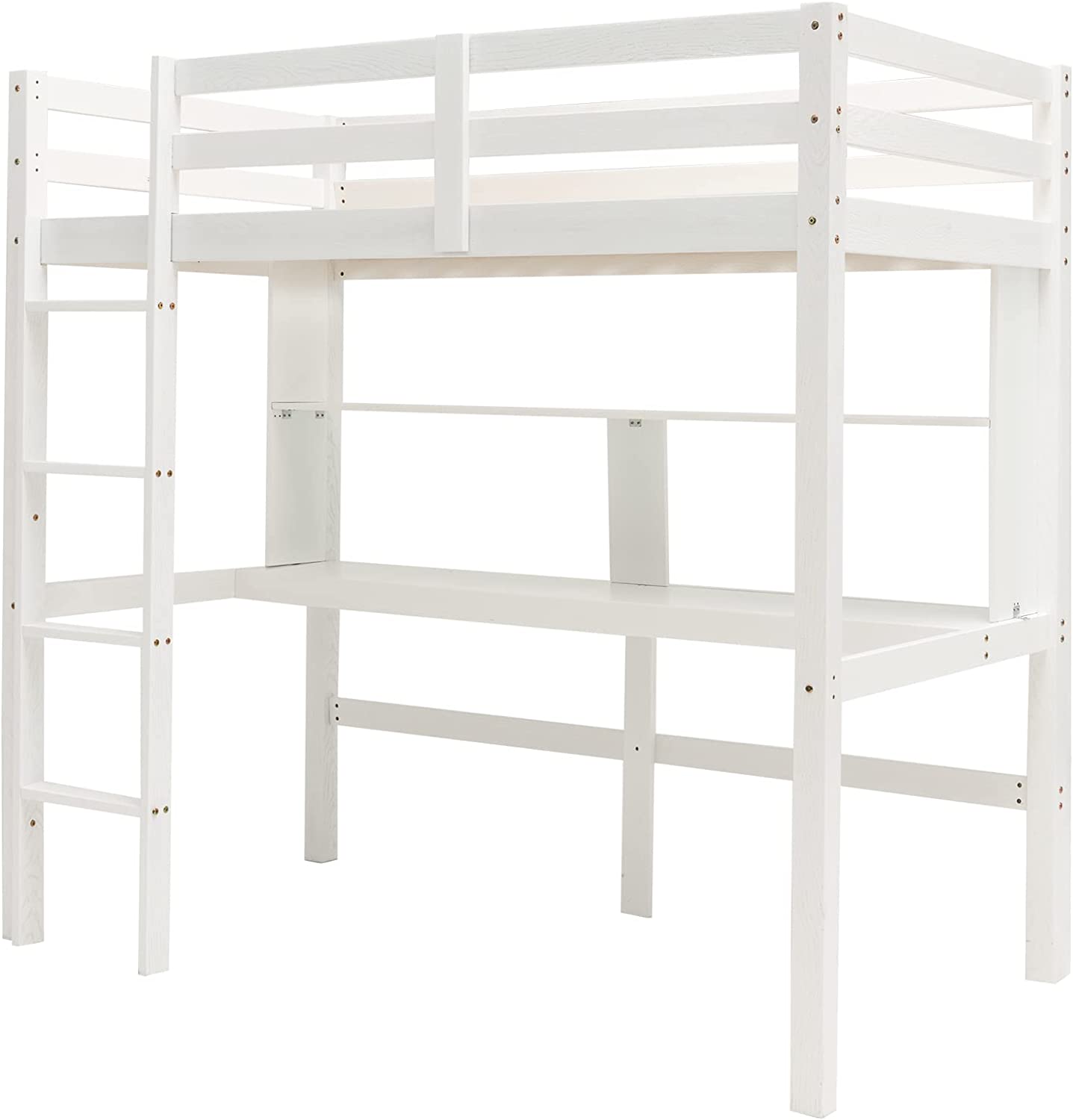 If you are tight on space, this solid wood bunk bed with desk is obviously a good solution to maximize the use of the bedroom space. The upper twin bed with safety guardrails provides a comfortable and safety sleeping environment, while the lower desk with storage shelf allows you to work, study and play games. What’s more, crafted with solid pinewood, the loft bed boasts a ultra-sturdy construction and considerable load-bearing capacity. In addition, the robust engineered wood slats allow you to use the mattress without the need for a box spring. In all, the multifunctional bunk bed is a perfect choice for kid’s rooms, dorms, and apartments.