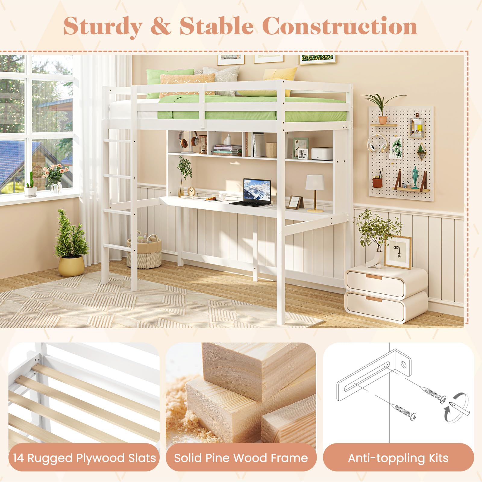 The loft bed with desk offers a convenient space for studying, working, or simply relaxing. Above the desk, the storage shelves offer ample room to keep books neatly organized. The solid wood bed frame is supported by sturdy plywood slats, providing a stable sleep surface. Safety is paramount with this loft bed, equipped with high guardrails and anti-toppling kits to securely anchor it in place. Besides, the sturdy ladder and wide entrance make accessing the loft area effortlessly. This modern loft bed is ideal for creating a cozy and efficient environment in any room.