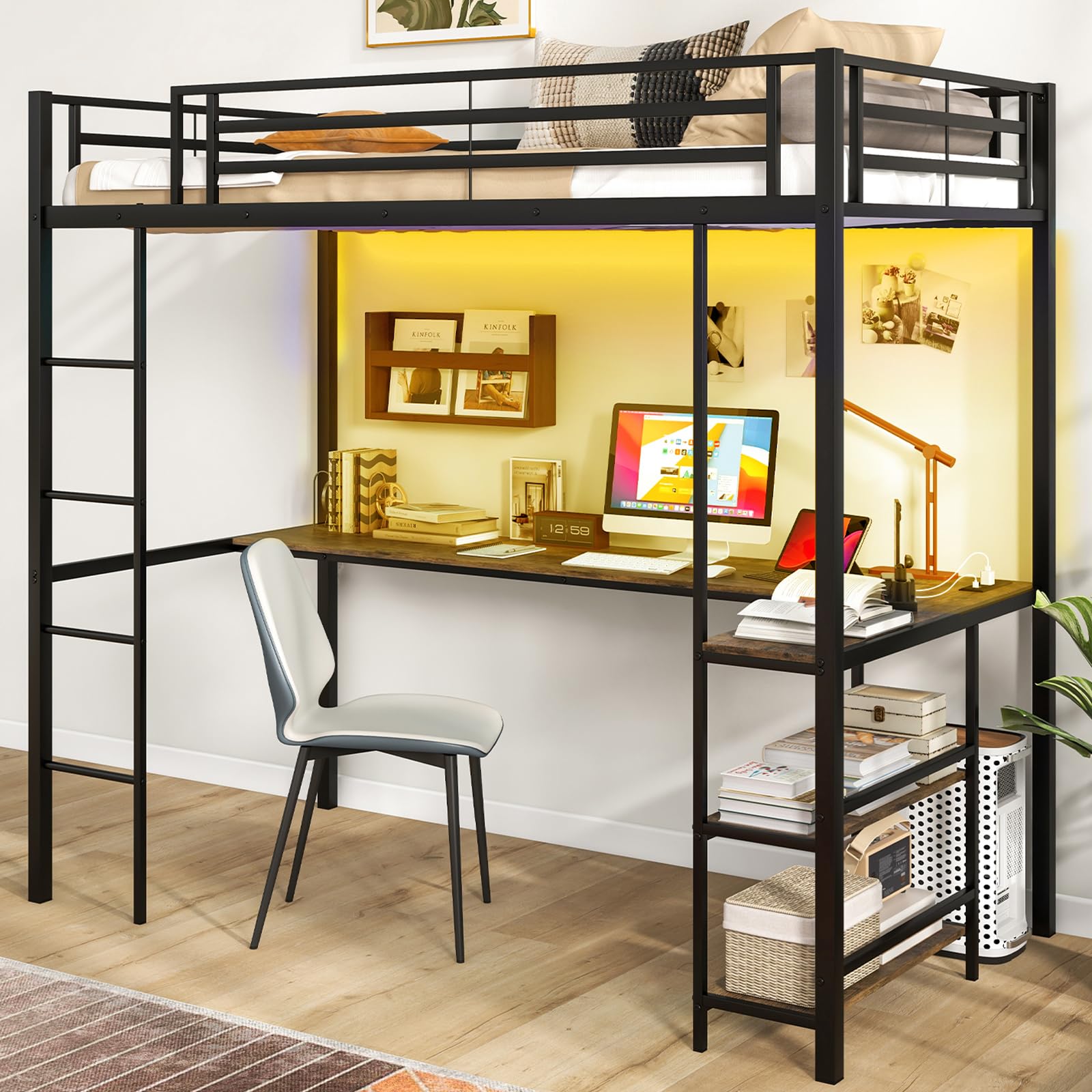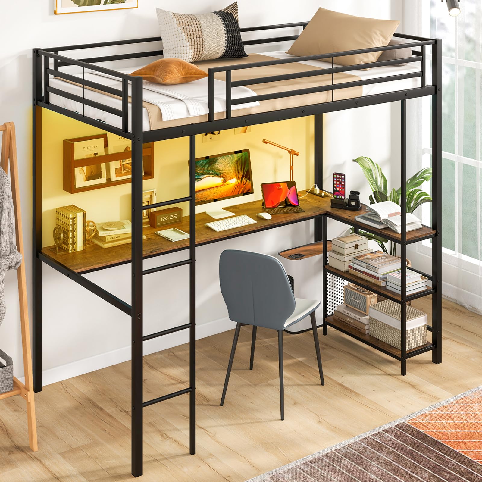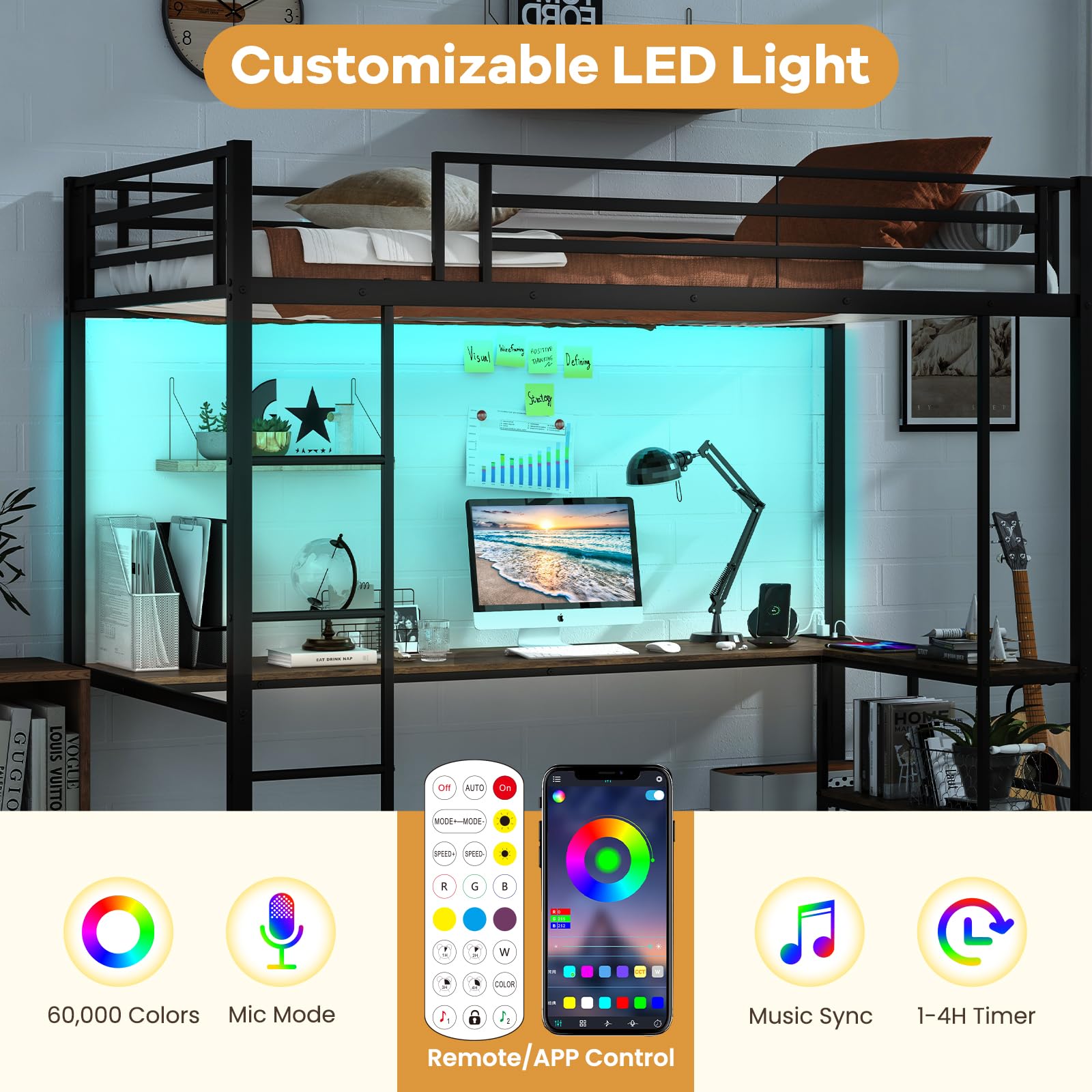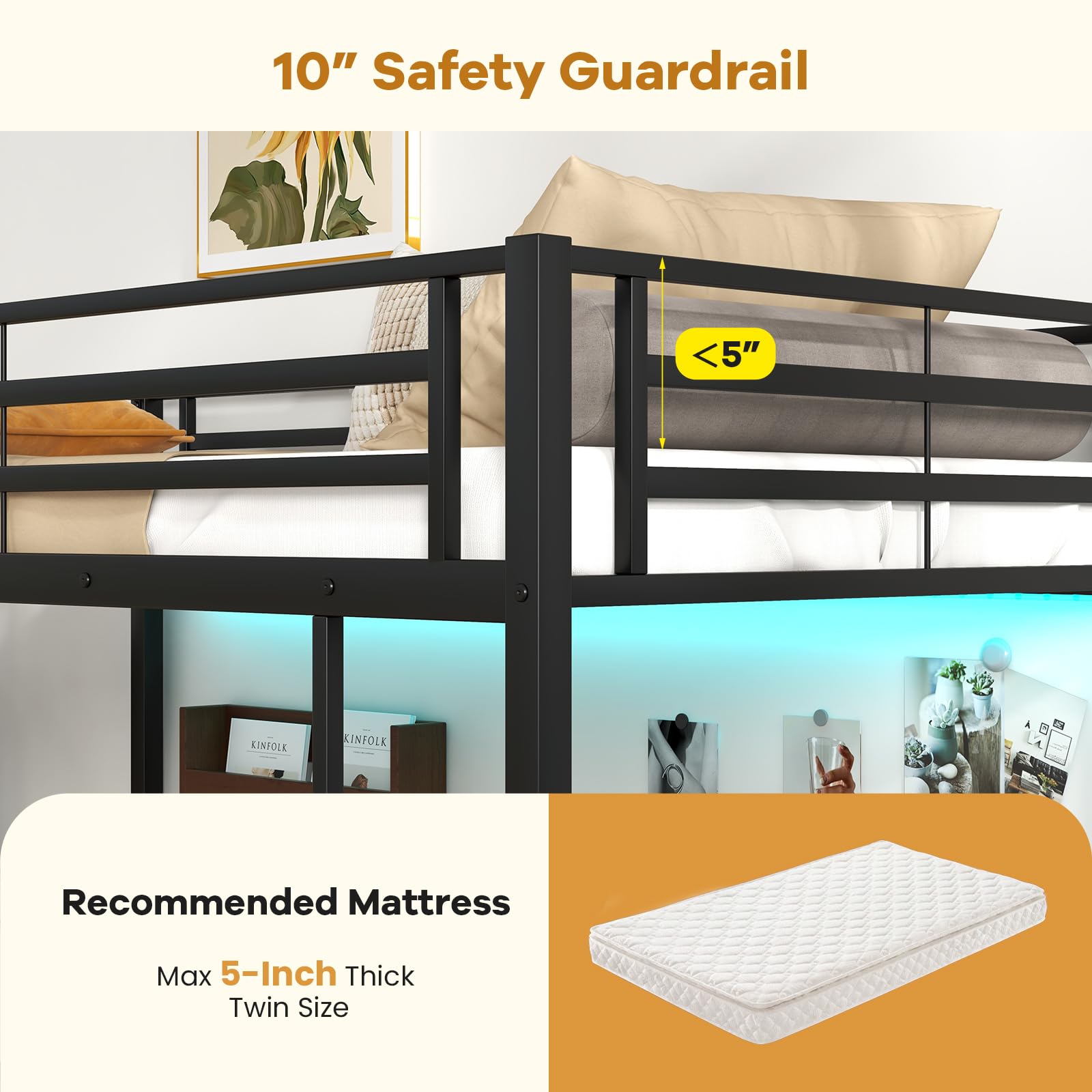 Experience a pleasant upgrade with this LED-illuminated twin loft bed. Picture transforming your room with a touch of a button - select from over 60,000 LED colors to match your mood or sync with your favorite tunes! With an integrated desk, ample shelving, and a built-in charging station, this twin bed stewards space while keeping your tech charged. Climb up safely with its secure steps, and sleep soundly with a robust guardrail ensuring night-long safety. Built with strong metal and designed to support substantial weight, this raised bed melds cutting-edge design with lasting durability. Say goodbye to mundane bedrooms and hello to vibrant versatility, all without needing a box spring!
