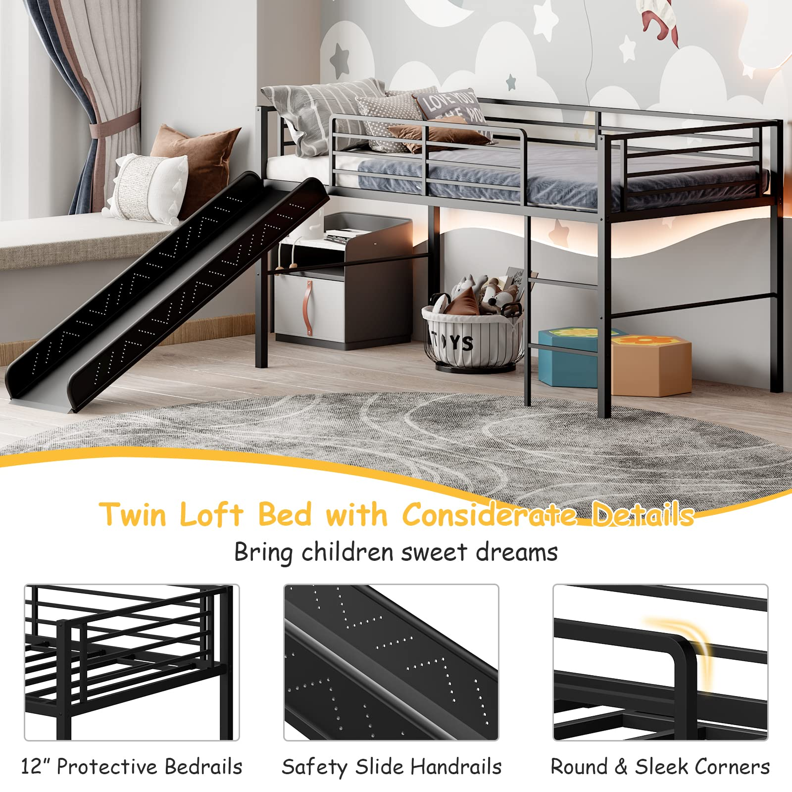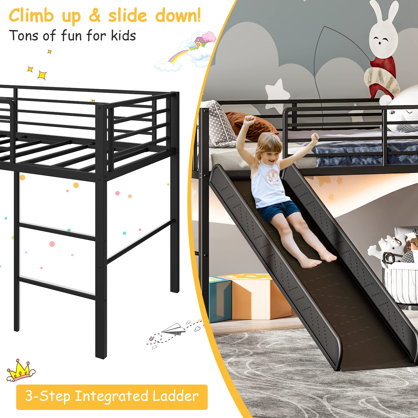 The twin-size loft bed is definitely the best addition to the kids' room! It features a long slide and a built-in 3-step ladder, which allow kids to have fun day and night. And the unique design obviously makes kids' getting up from the bed much more interesting and enjoyable. What's more, kids' safety is also our priority. With protective guardrails and safety handrails, the bed will give kids a safe and sound sleep. In addition, as the bed frame is well constructed from high-strength and rustproof steel, it also features superior stability as well as a long lifespan. Besides, the raised twin bed also saves precious floor space and adds to the room for storage or kids' activities.