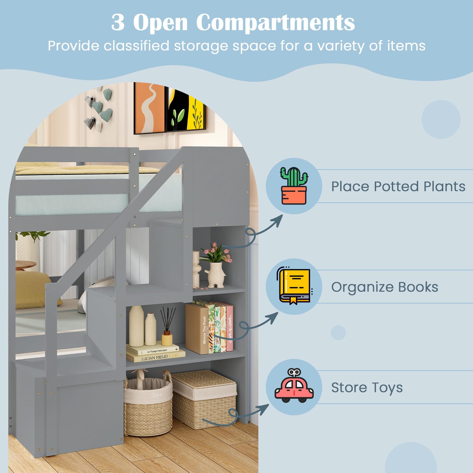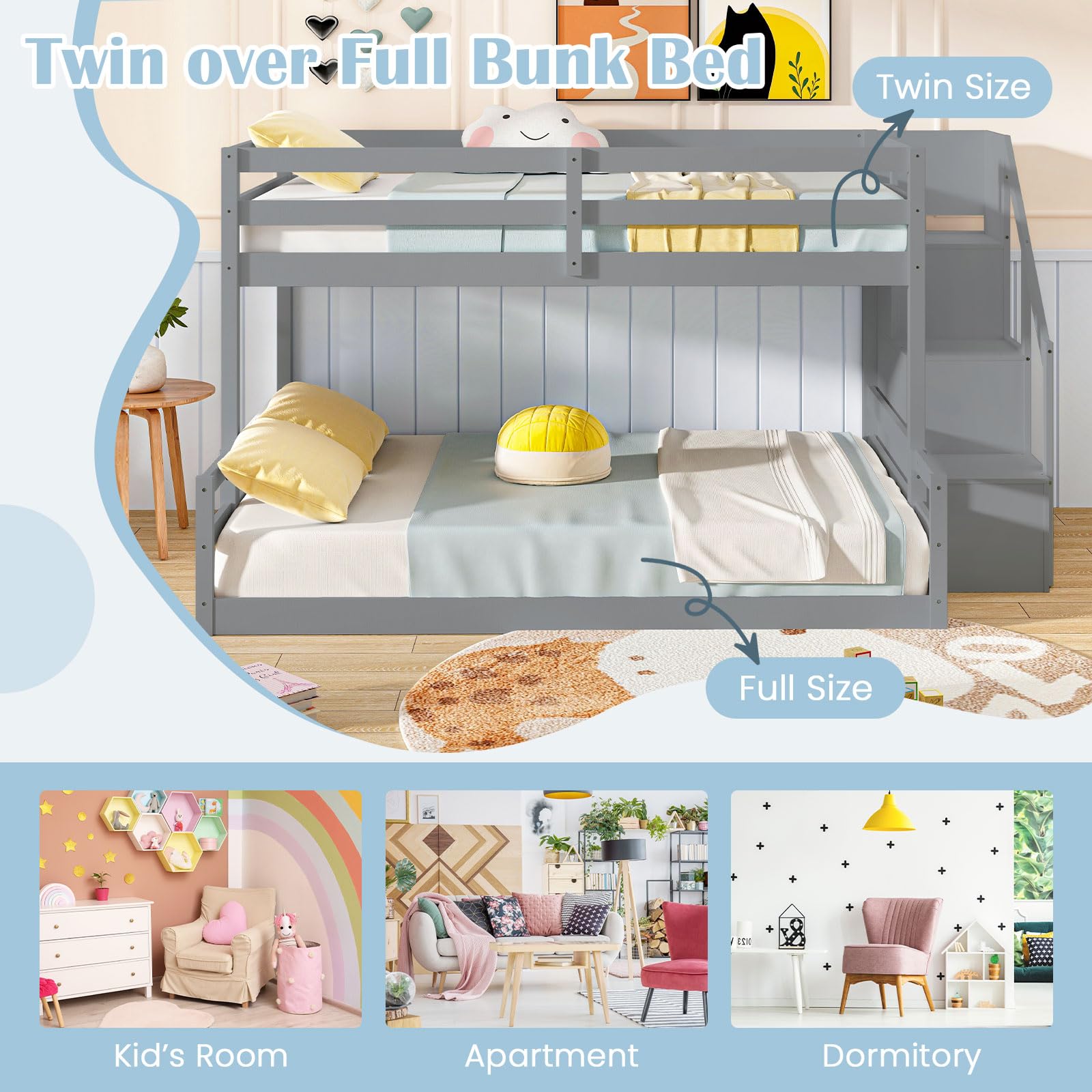 Give your children the gift of a cozy and comfortable sanctuary with our stylish bunk bed! This twin over full bunk bed showcases a low-profile design that makes it suitable for rooms with low ceilings or younger children. The stairway design is not only safer for kids to climb but also provides classified storage space for a variety of items. Moreover, the full-length guardrails are securely mounted on the upper bunk, ensuring a safe sleeping environment. Built from solid wood frame and rugged plywood slats, this floor bunk bed offers durability and high strength. All in all, the bunk bed with storage stairs is ideal for those looking to combine elegance with practicality in a bedroom furnishing.