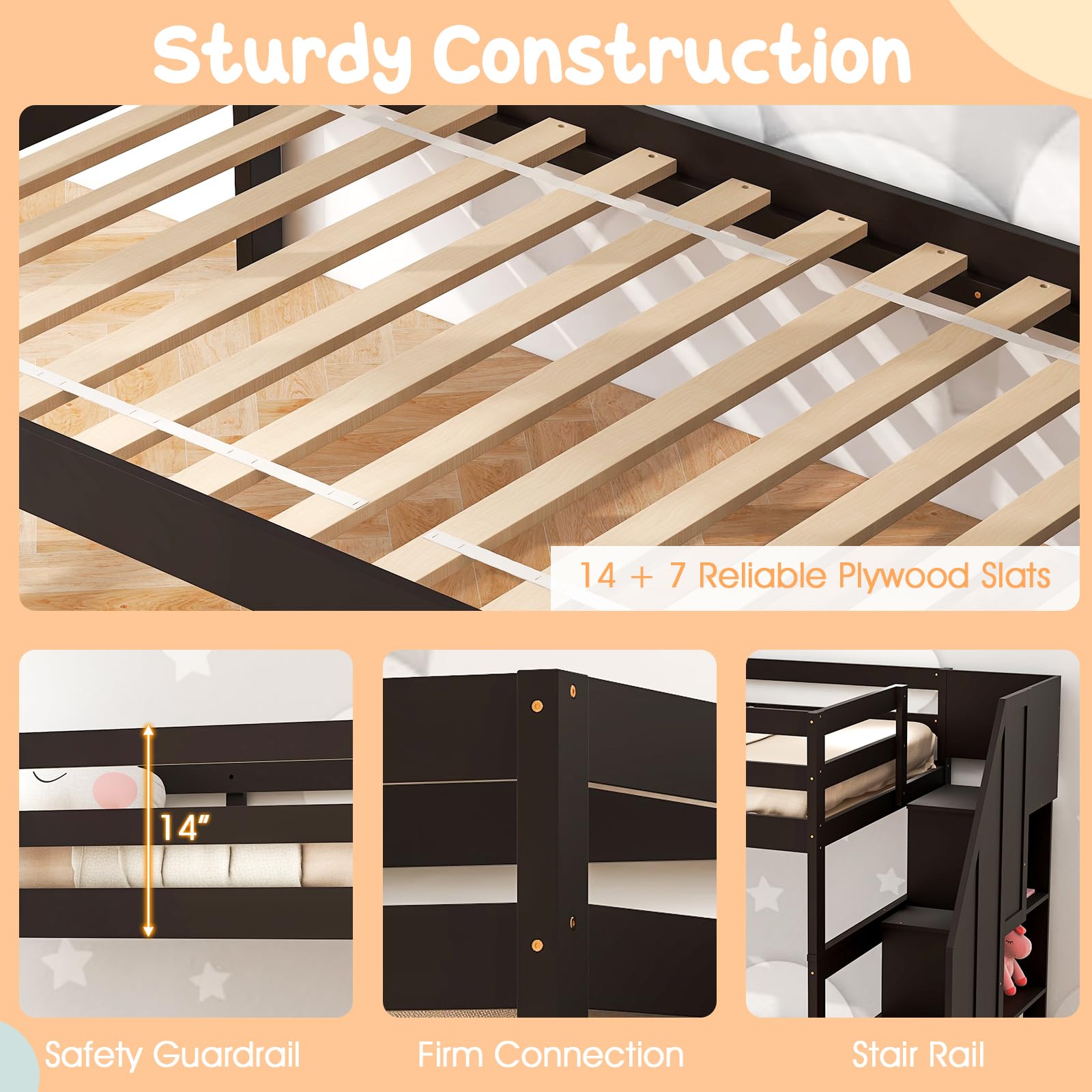 - [Large Storage Shelf] Discover the convenience of our bunk bed with a thoughtfully designed 4 tier storage shelf. Four compartments of varying sizes beneath the stairs provide ample space to store quilts, bed sheets, and other essentials. Additionally, organize books and clothing effortlessly.