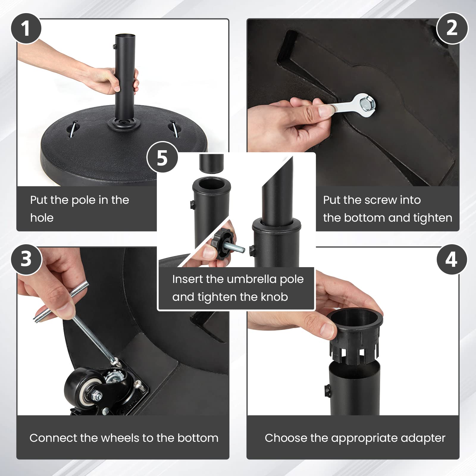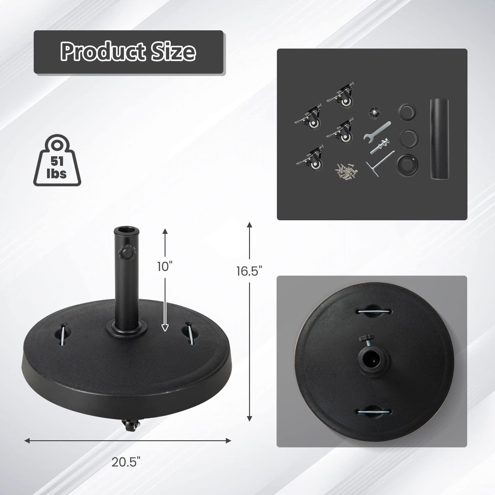 Crafted from high-quality resin and metal, this umbrella stand is built to last and withstand the elements, featuring exceptional durability, weather resistance, and rust resistance for long-term outdoor use. Boasting a sturdy net weight of 52 lbs, it provides reliable support for your outdoor umbrella. Designed with an adjustable knob, this stand accommodates umbrella pole diameters of 1.5''-1.9'' with ease, ensuring your umbrella stays securely in place all day long. With the added convenience of four wheels, this resin umbrella base effortlessly combines both practicality and elegance.