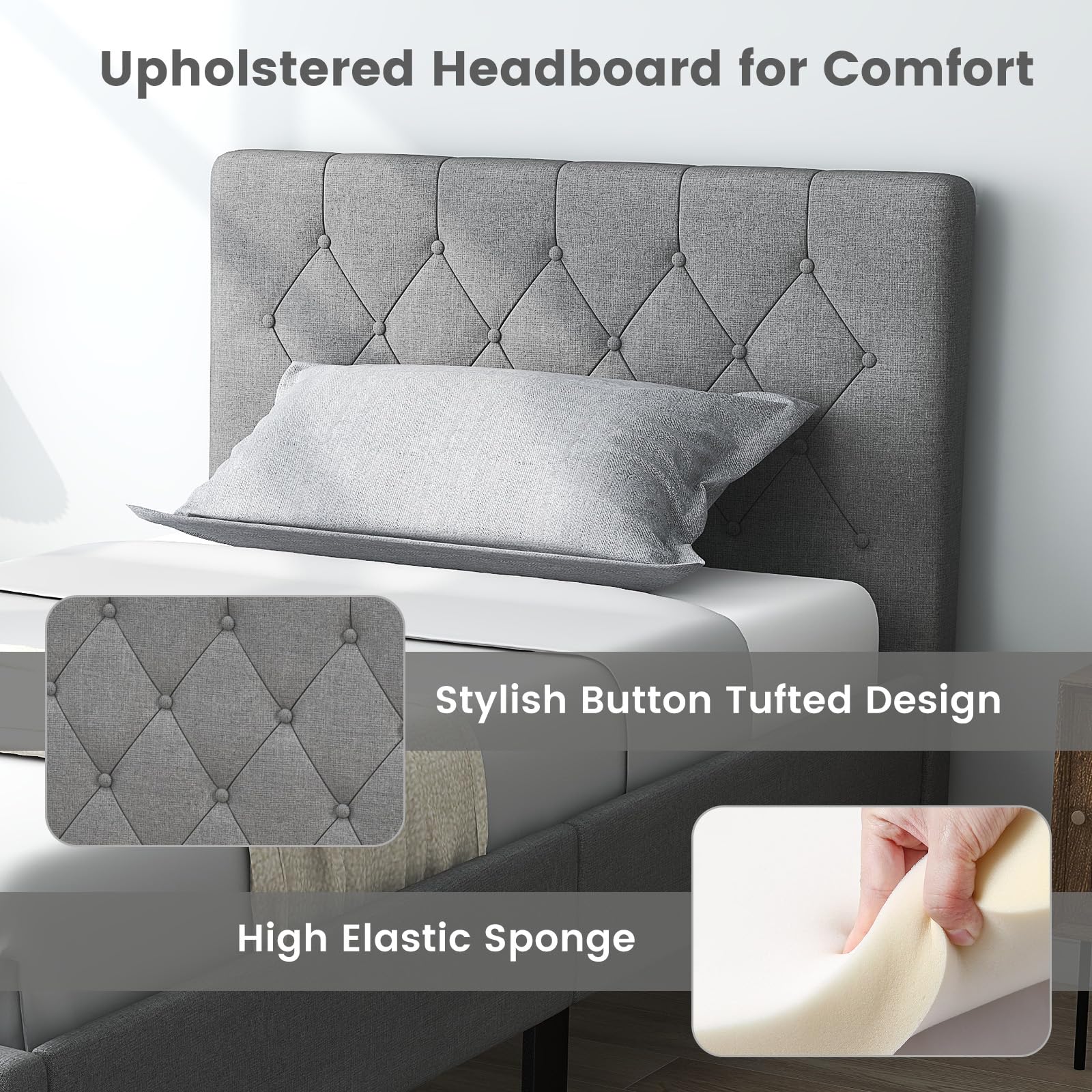 - Upholstered Headboard for Comfort: The headboard is wrapped in premium polyester fabric and padded with high elastic sponge, which is comfortable to lean against when you are reading or watching TV in bed. Plus, the headboard can perfectly fit your back curve for more relaxation.