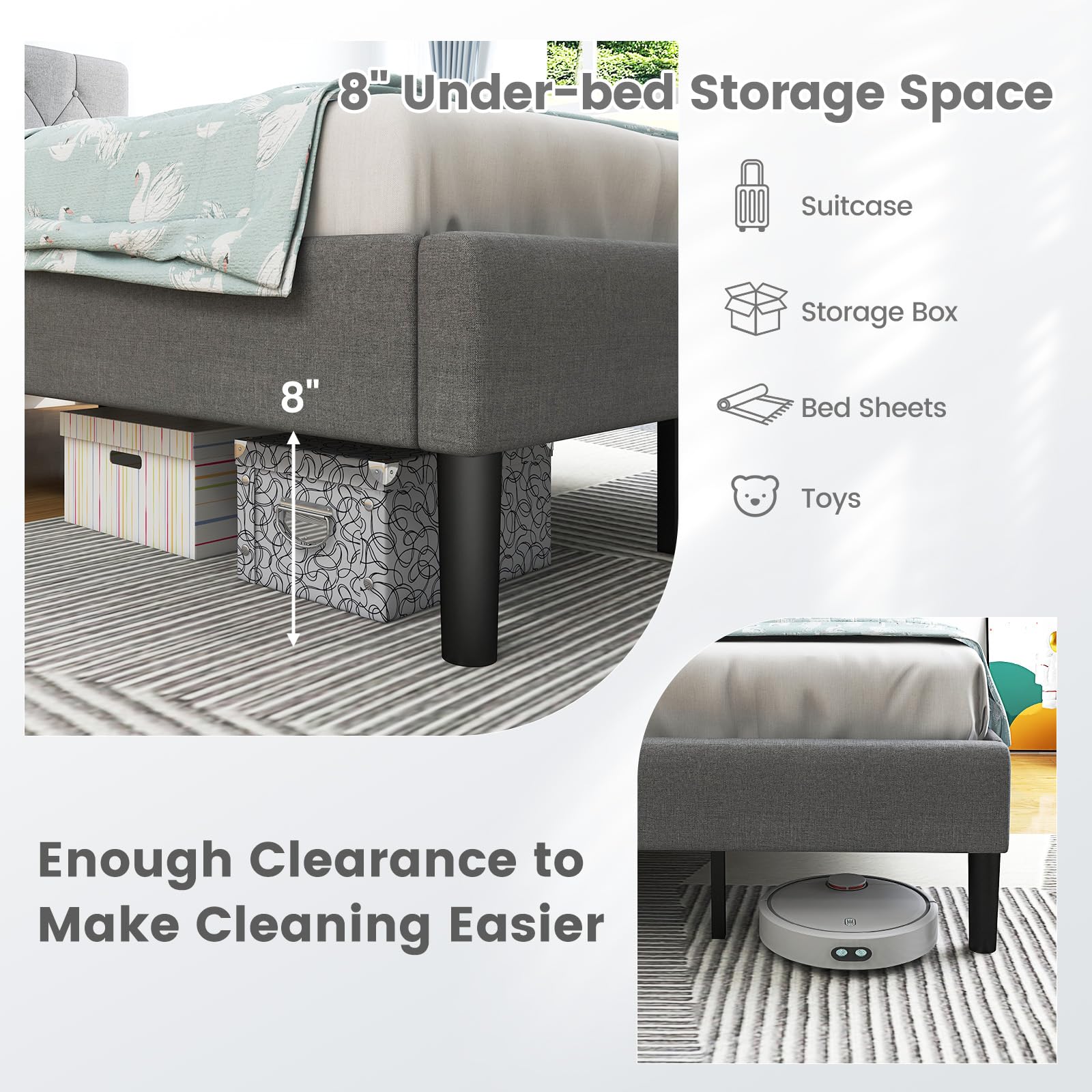 - No Box Spring Needed & Under-bed Space: Reinforced wooden slats provide reliable support for mattress without the need for a box spring. The platform bed frame features 8” under-bed space to meet your daily storage needs while leaving enough cleaning space.