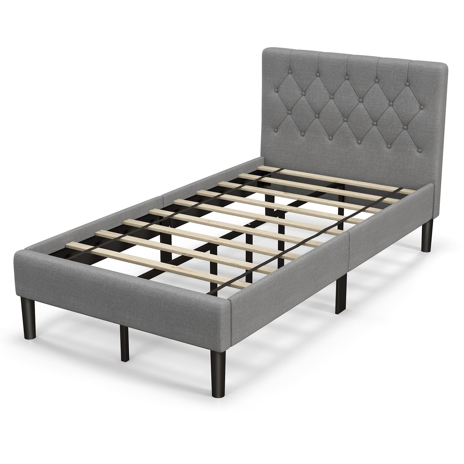 No matter your bedroom style, the stylish platform bed is an awesome choice. Made of solid wooden slats, the platform bed combines great sturdiness and strong load bearing. Together with sturdy support legs, higher stability is well ensured, which means a longer lifespan. The headboard is padded soft sponge and upholstered in polyester fabric for more comfort. As you can see, 8” under-bed storage space facilitates the placement of daily items, such as suitcase, toys, storage box and bed sheets. This modern upholstered bed frame adds refined sensation to your bedroom while offering you a comfortable sleeping environment with reliable quality!